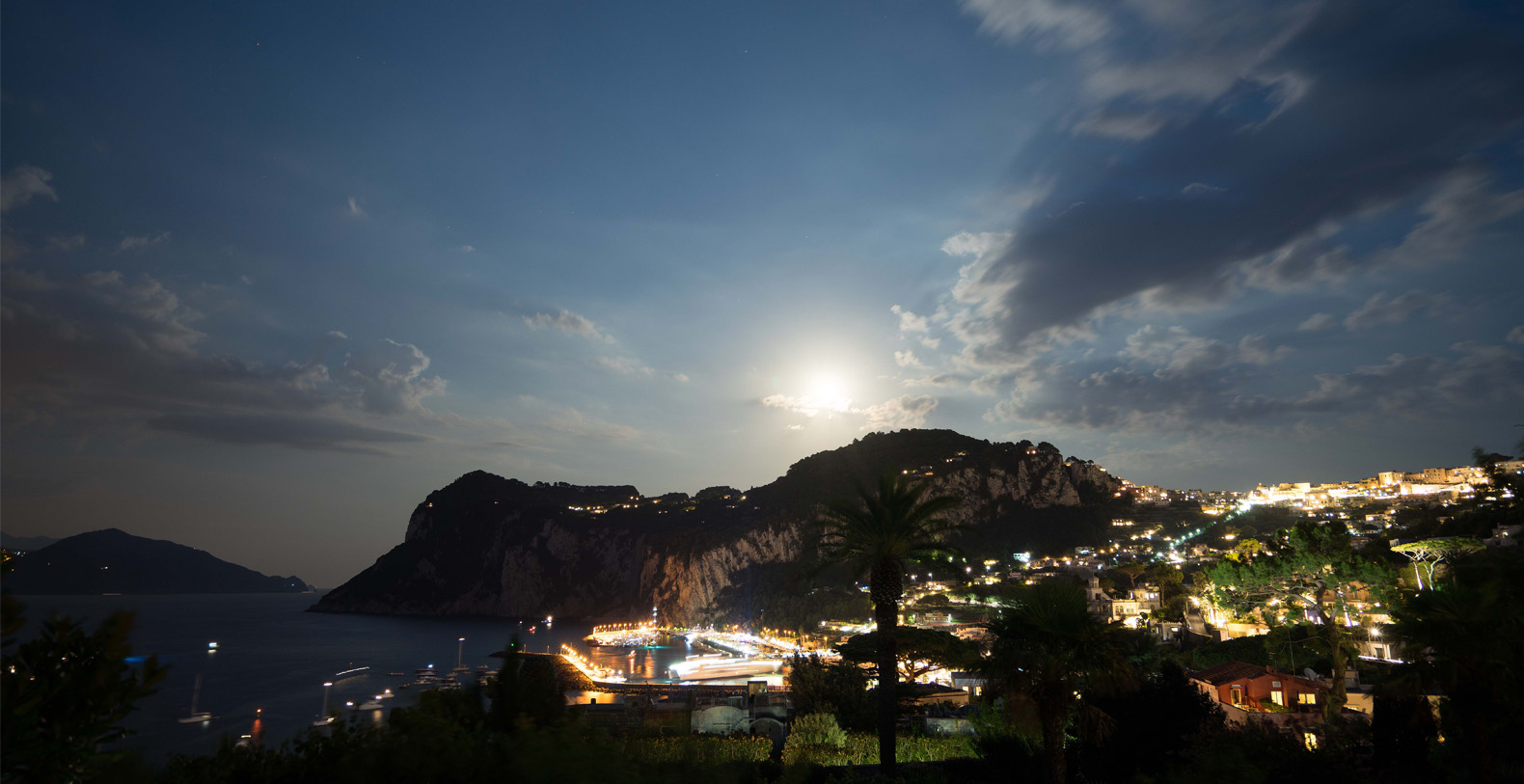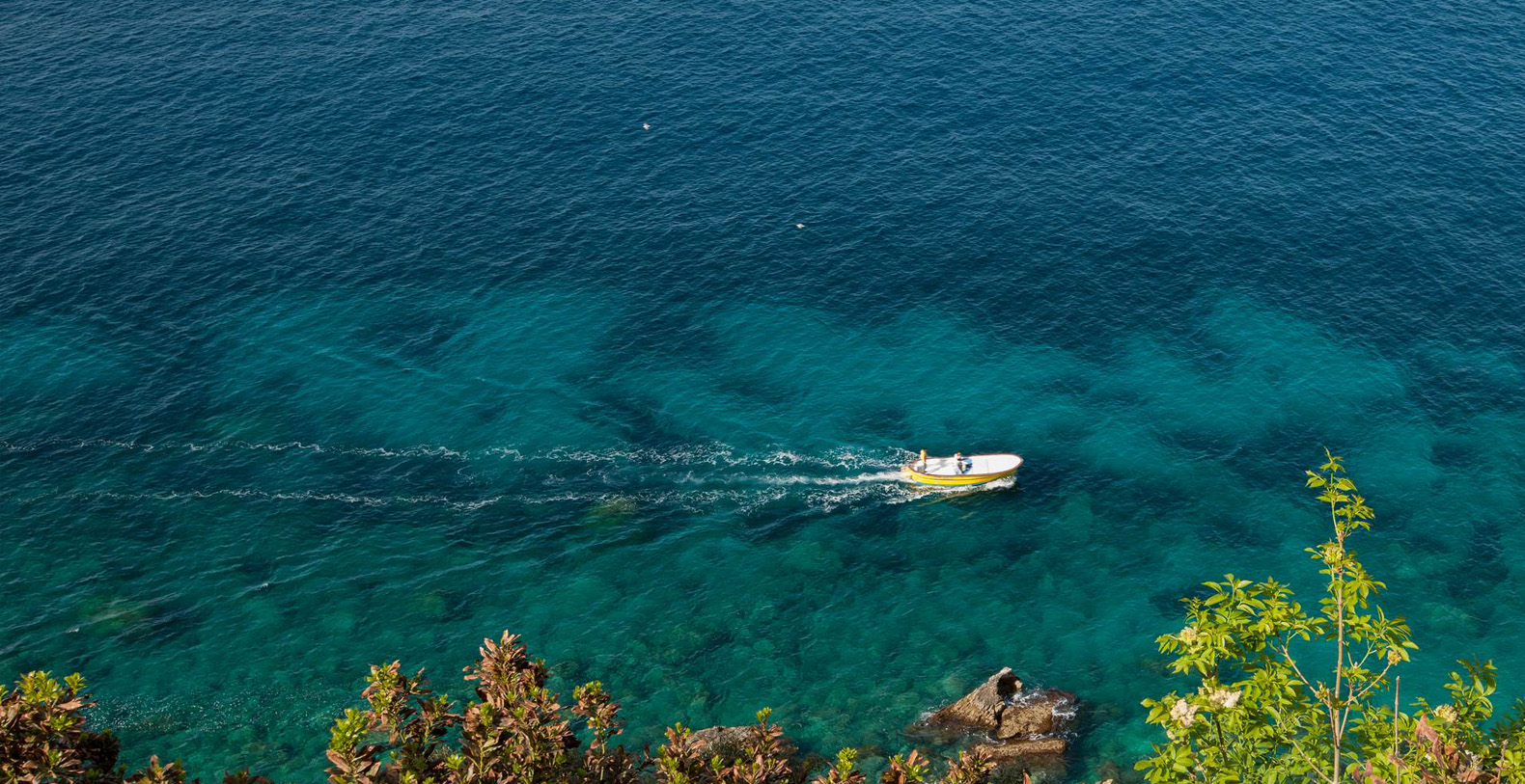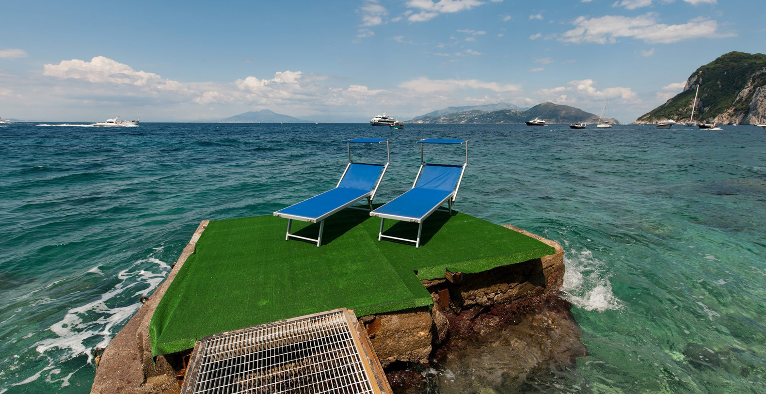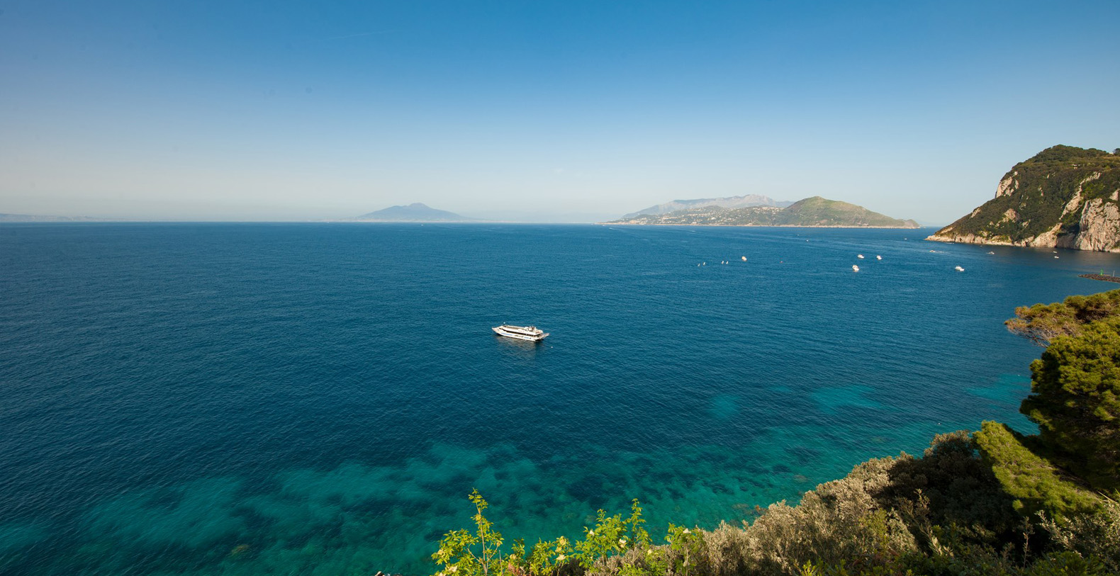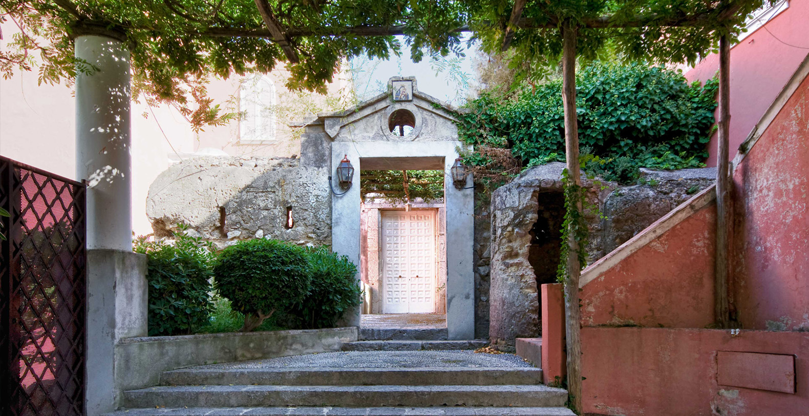 A lovely area in the garden is the large, marble paved terrace facing the sea and offering the best views out onto the bay of Naples. The terrace is furnished with iron cast tables, lounge chairs, and benches where guests can enjoy the silent sounds of the sea below and listen with pleasure to the boats silently passing by the waterfront from the Grotta Azzurra. Here one can truly admire the wonders of nature while enjoying its peace and quiet. A large round table with chairs and a second, rectangular table with chars, as well as several smaller tables with chairs and benches make up super comfortable garden seating areas and more than enough space for outdoor dining for the largest of groups. An easy, panoramic, and comfortable pedestrian path of about 150 steps leads from the garden down to the sea, passing through a pleasant, shaded wooded area filled with olive trees and Mediterranean herbs. The path leads to a private sundeck, platform, and boat dock. The area is furnished with lounge chairs, umbrellas, & beach towels and cold drinks and snacks can be stocked in the refrigerator and kitchenette located at sea level. Staff can serve lunch here as well.