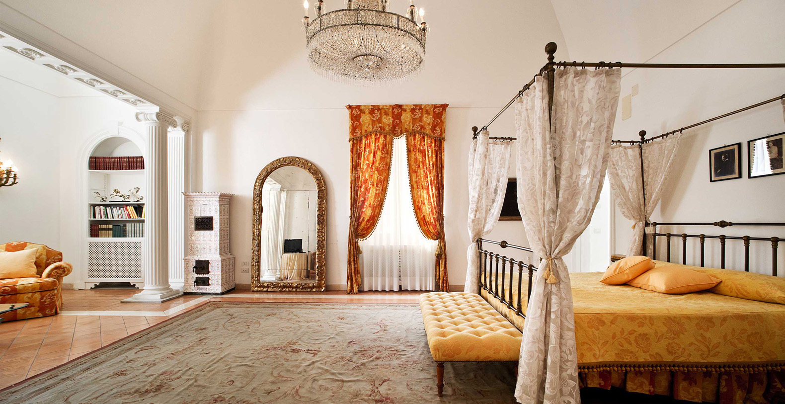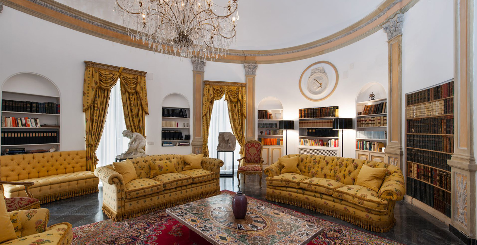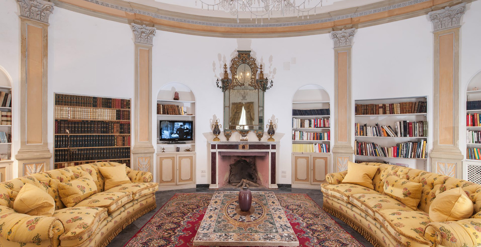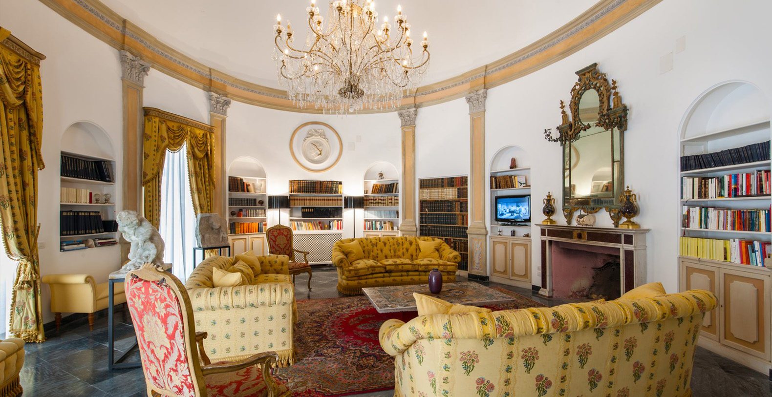 One of the most pleasant areas of the villa is the large, circular shaped, elegant library. Here, you truly feel like you are immersed in a special atmosphere which characterizes the villa's history. The warm colours of the entire area is a contrast against the black marble floor. The library boasts a relaxation area comfortably furnished with sofas, benches with cushions, couches, and as marble topped table. A great selection of books are at guest's disposal and the oriental carpet collects the colours which characterize the library. The ambient is furnished with built-in marble columns, 2 large antique terracotta vases, antique mirrors, and a large marble fireplace that completes its aristocratic style and creates a space dedicated to reading. The room also boasts several balcony areas which opens out to the back of the villa.