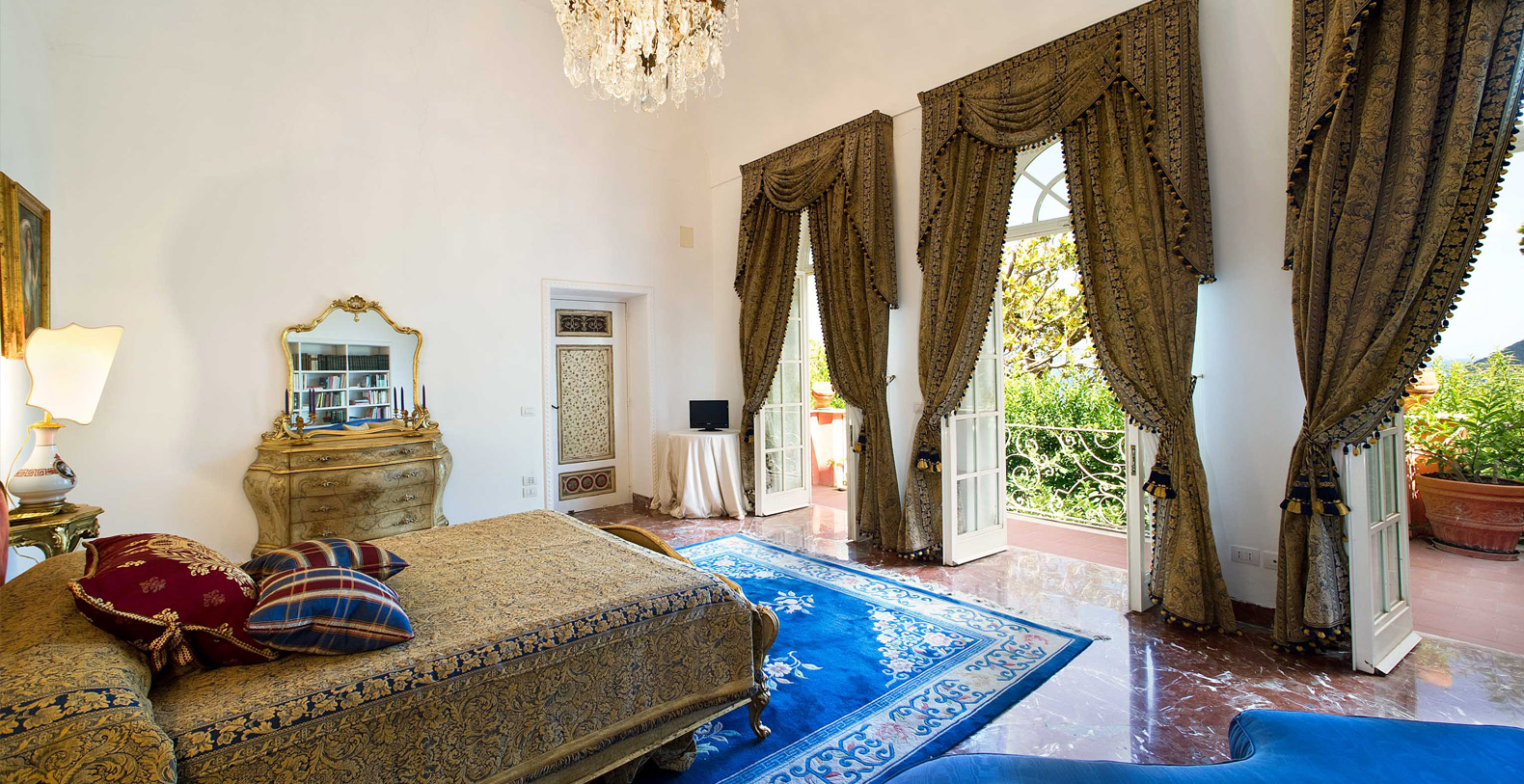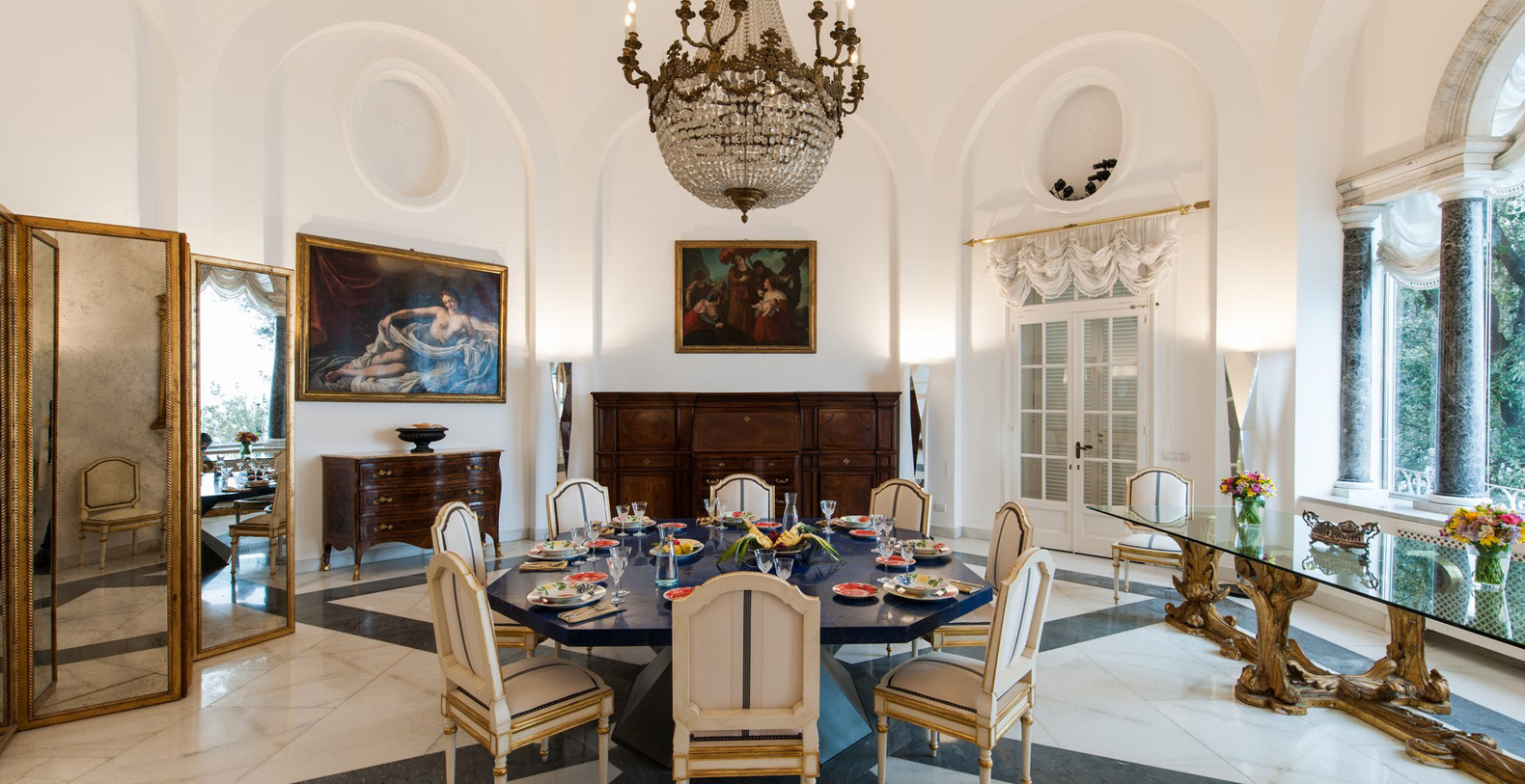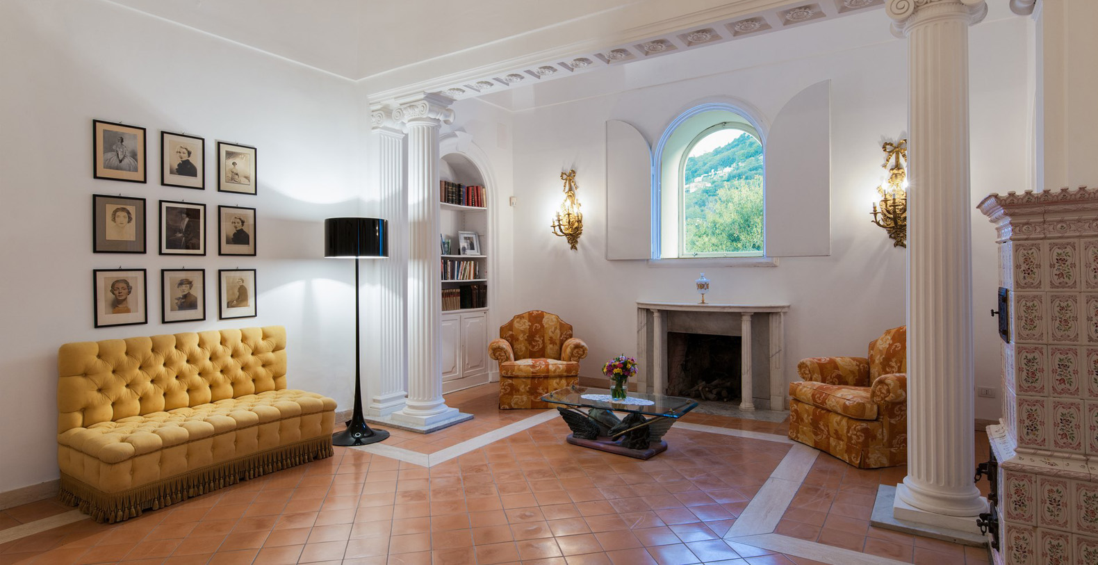 One of the most pleasant areas of the villa is the large, circular shaped, elegant library. Here, you truly feel like you are immersed in a special atmosphere which characterizes the villa's history. The warm colours of the entire area is a contrast against the black marble floor. The library boasts a relaxation area comfortably furnished with sofas, benches with cushions, couches, and as marble topped table. A great selection of books are at guest's disposal and the oriental carpet collects the colours which characterize the library. The ambient is furnished with built-in marble columns, 2 large antique terracotta vases, antique mirrors, and a large marble fireplace that completes its aristocratic style and creates a space dedicated to reading. The room also boasts several balcony areas which opens out to the back of the villa.