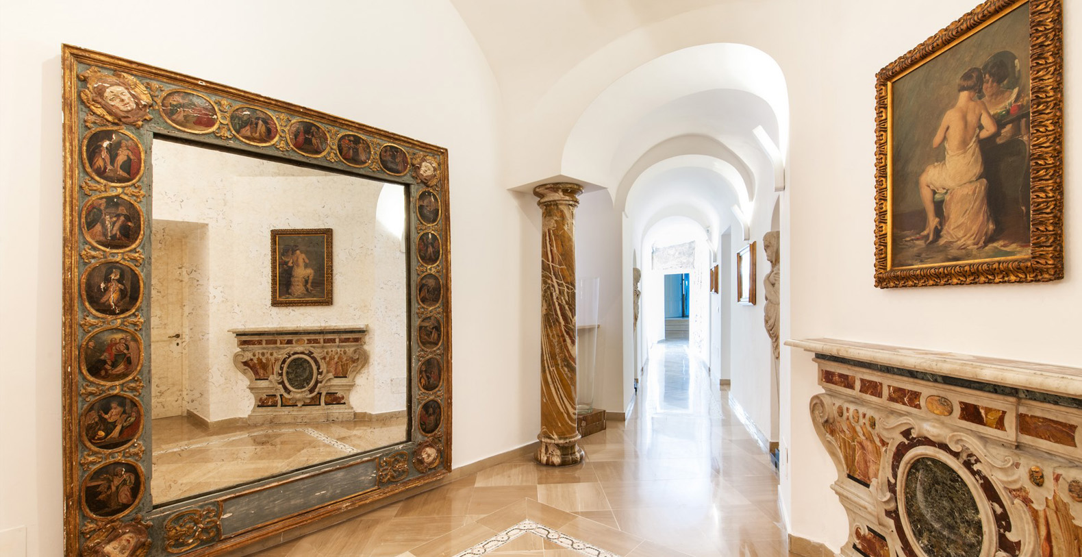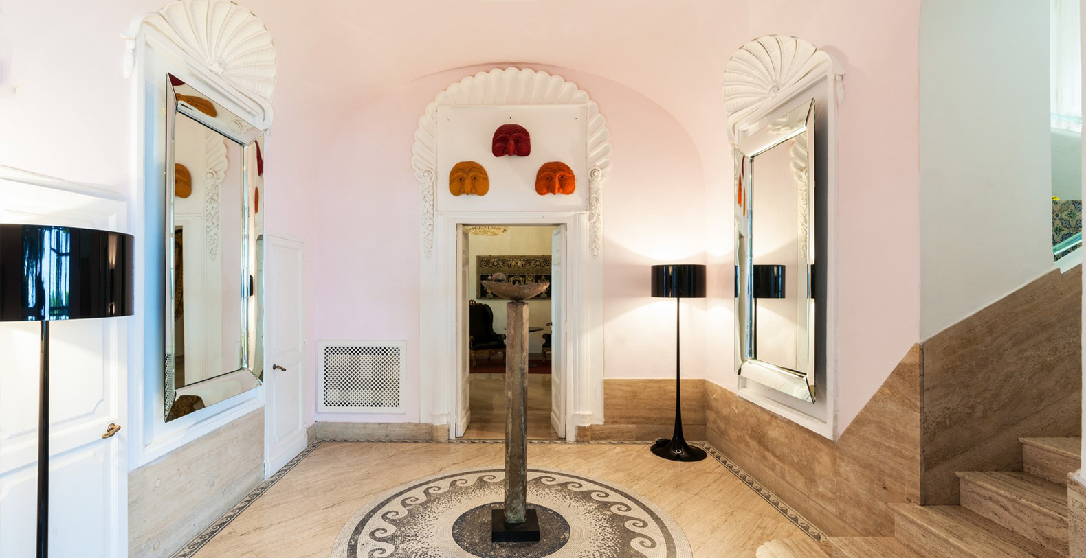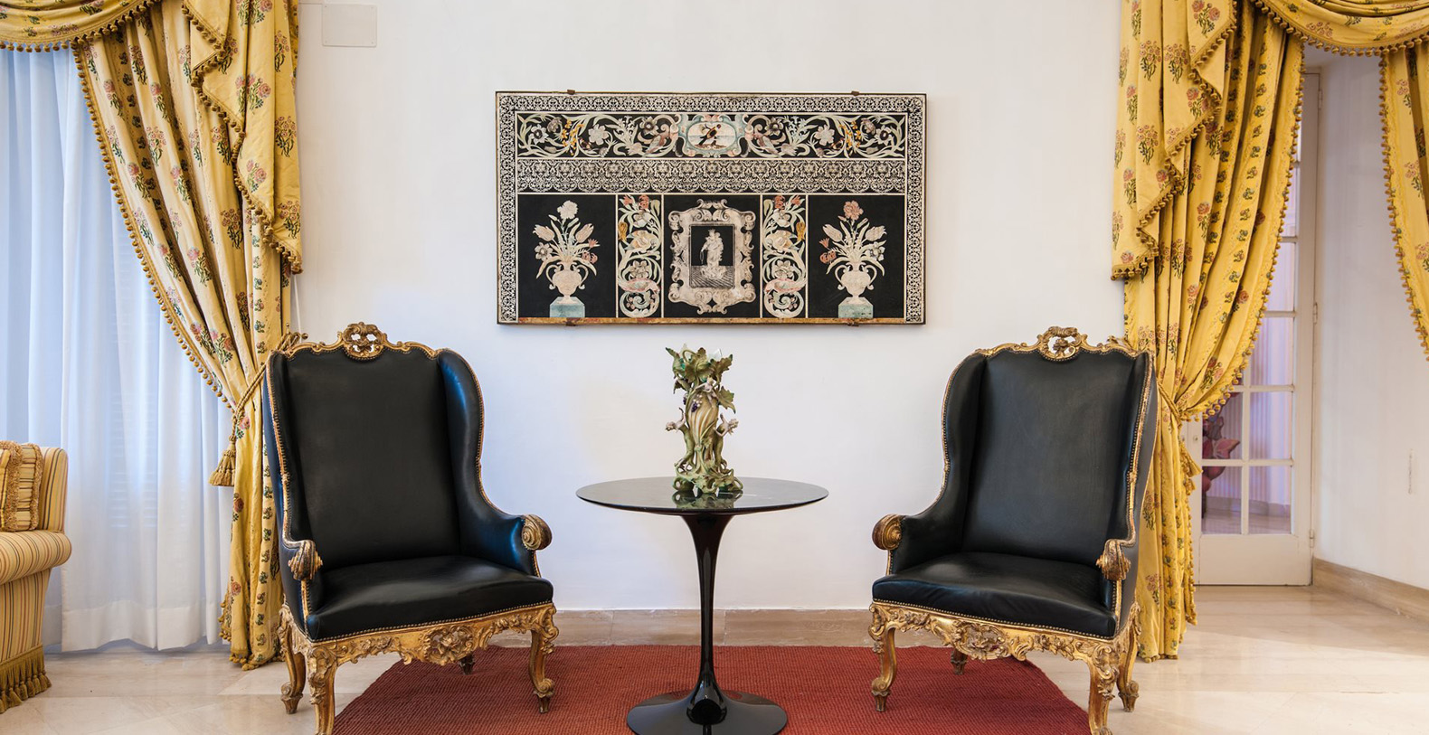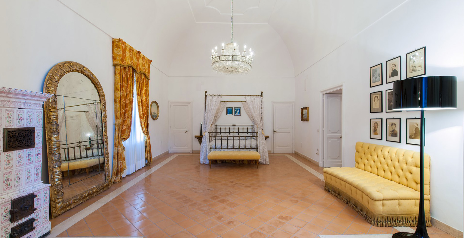 One of the most pleasant areas of the villa is the large, circular shaped, elegant library. Here, you truly feel like you are immersed in a special atmosphere which characterizes the villa's history. The warm colours of the entire area is a contrast against the black marble floor. The library boasts a relaxation area comfortably furnished with sofas, benches with cushions, couches, and as marble topped table. A great selection of books are at guest's disposal and the oriental carpet collects the colours which characterize the library. The ambient is furnished with built-in marble columns, 2 large antique terracotta vases, antique mirrors, and a large marble fireplace that completes its aristocratic style and creates a space dedicated to reading. The room also boasts several balcony areas which opens out to the back of the villa.