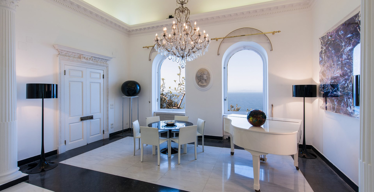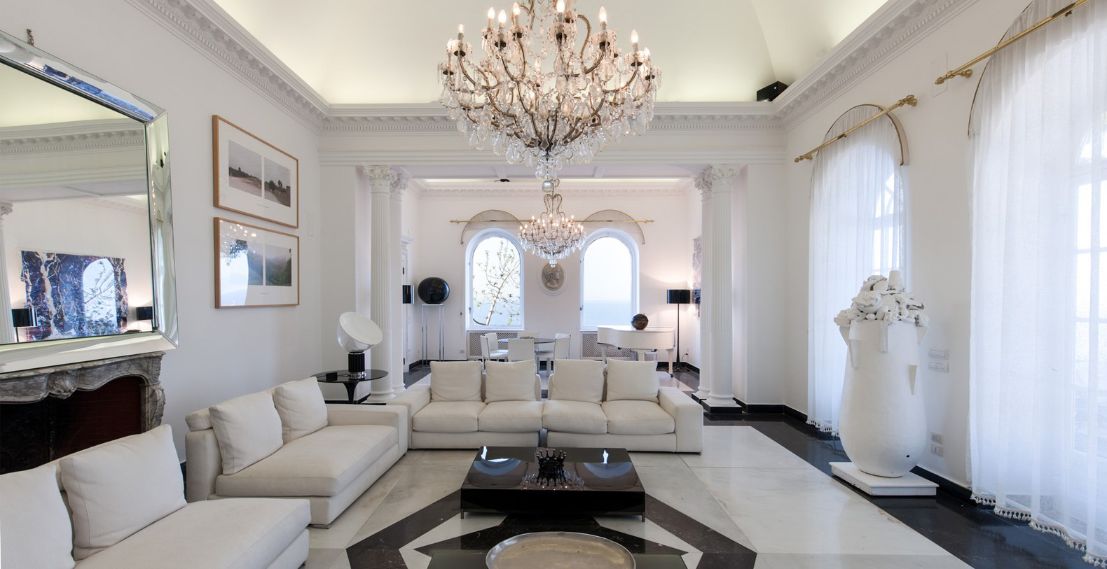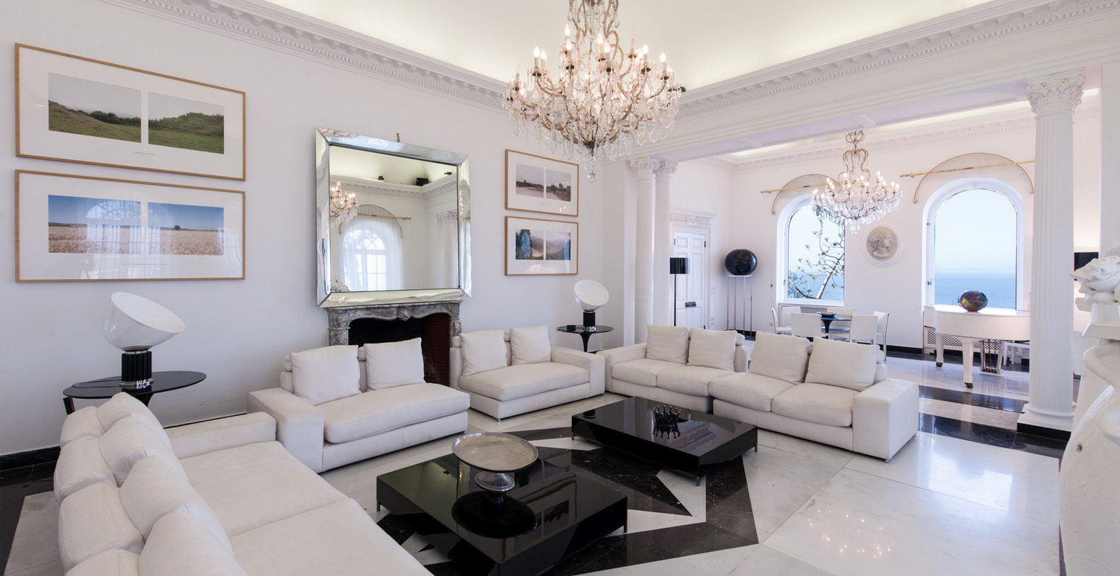The end of the corridor brings you, to the left, to a natural, stone wall, once part of an authentic Anglo-French fort. On the left side lays a sliding glass door leading out to a courtyard with potted greenery and six white columns. Three steps up lies the service area with the laundry. The end of the corridor, to the right, leads to the main dining room. To enter the dining room means to enter one of the most elegant common areas in the entire villa. The bright and full of natural light dining room encompasses the villas indoor dining area. As soon as you enter, your sight is captured by a Lapis Lazuli octagonal table, seating 8. Marble columns, beautiful paintings, crystal lamps, one working fireplace, and a large glass door with an enchanting sea view fill this elegant space. Two French doors open onto a terrace facing directly above the sea, while a door leads to the living room which does not lack style and atmosphere. Newly redecorated in minimalist-decor the living room boasts vaulted ceilings with stucco decor, black and white marble floors, beautiful candelabra and a crystal lamp. Sofas and armchairs and glass tables make for comfortable seating in front of the fireplace, while two large windows with great sea views and two French doors open out onto the terrace. Beautiful paintings, pieces of modern art and a large, grand piano complete the decor of this prestigious living area.