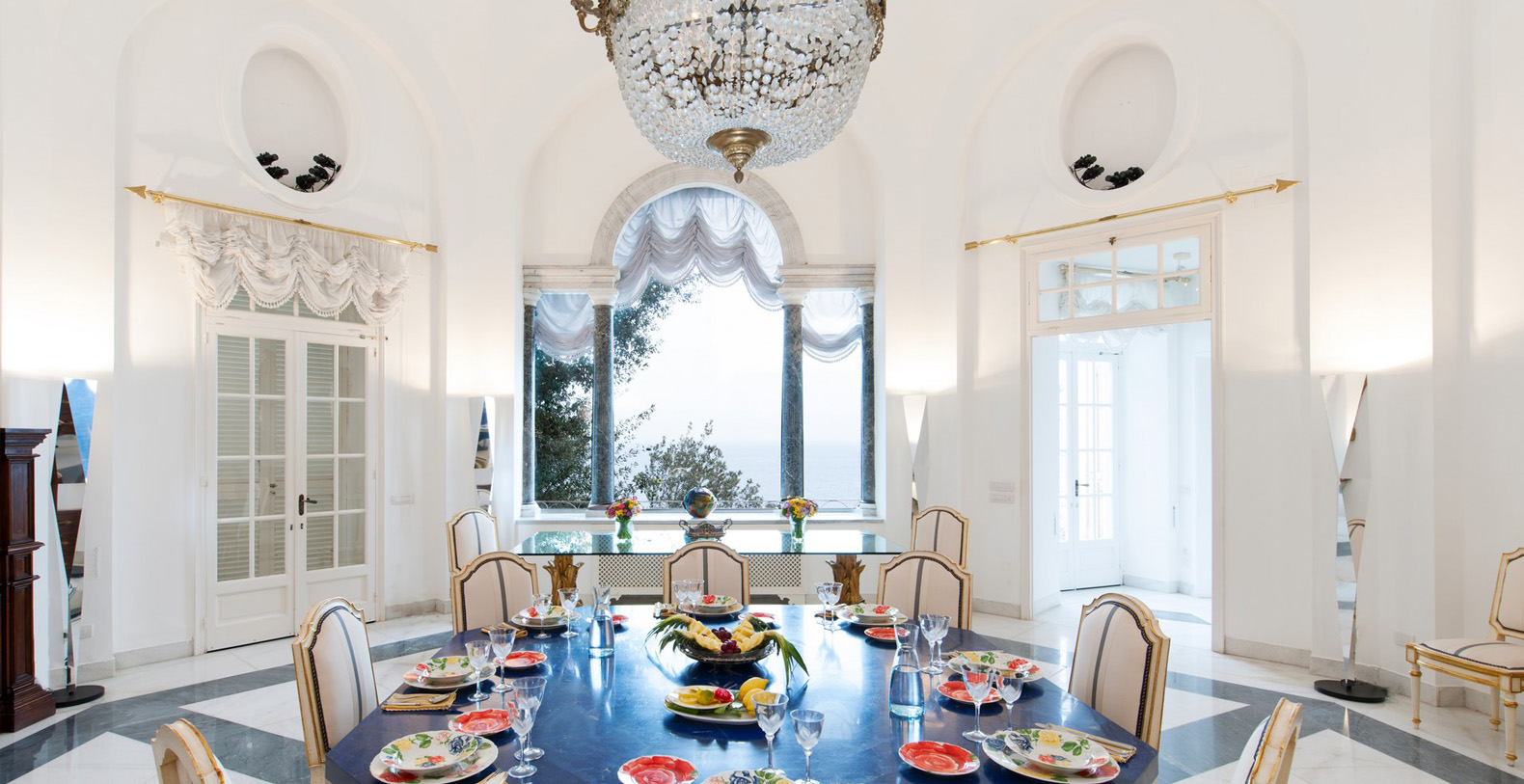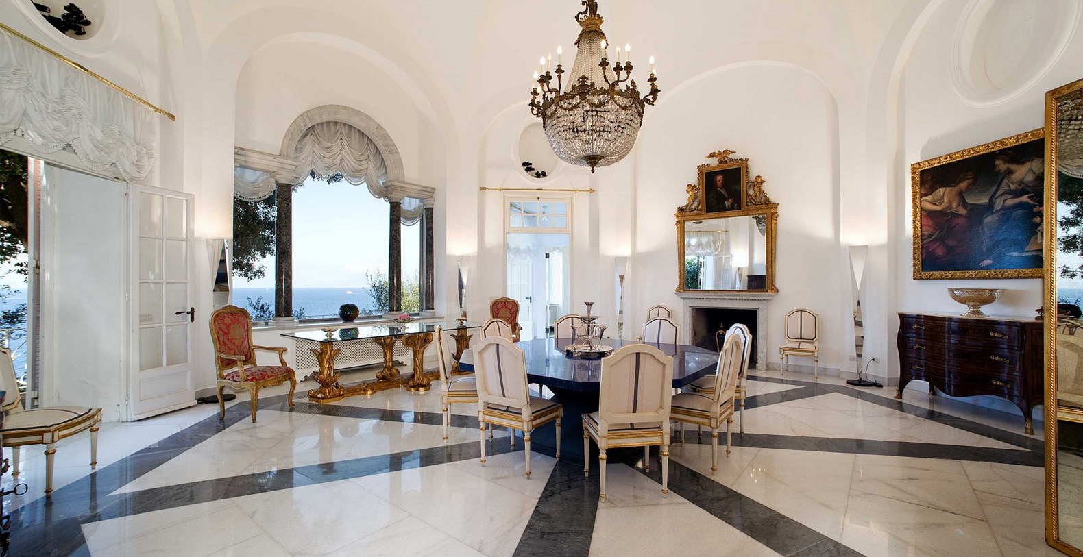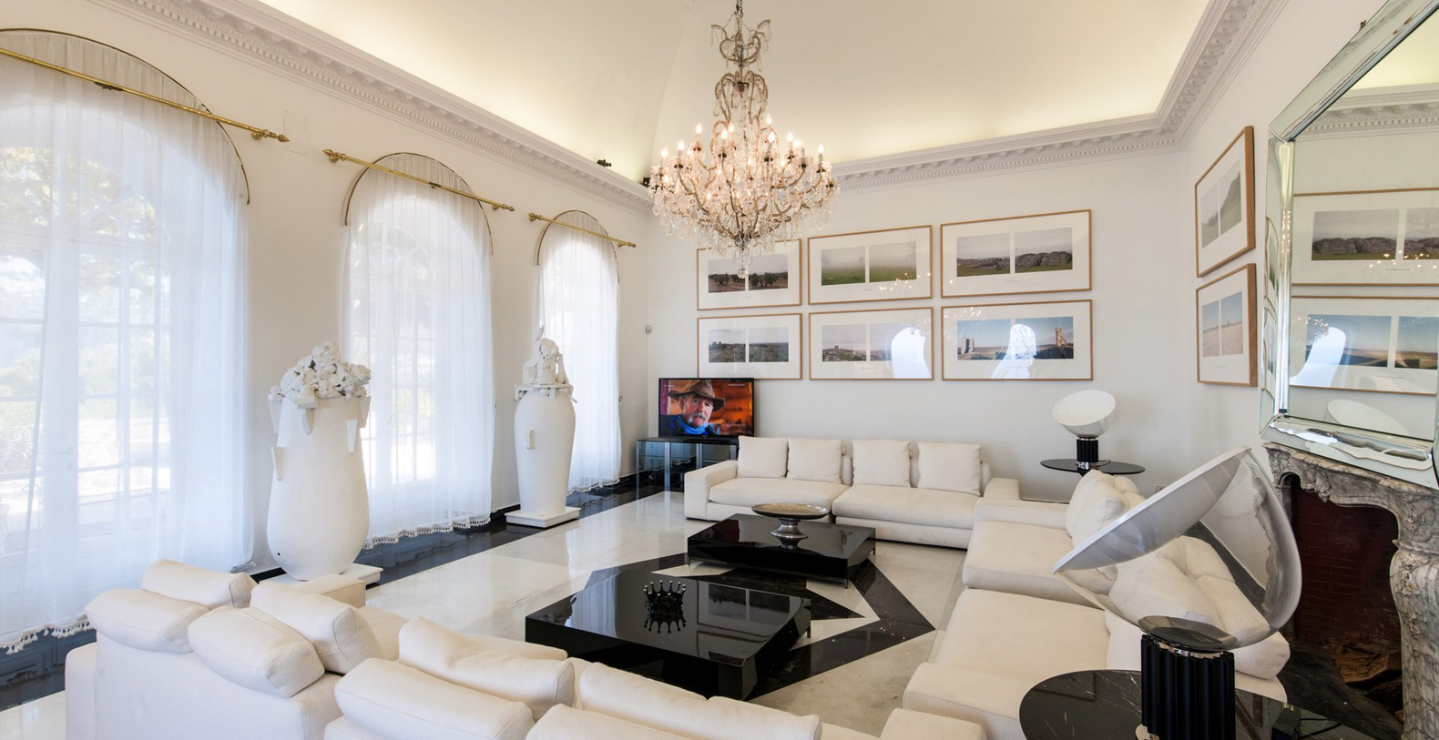 The end of the corridor brings you, to the left, to a natural, stone wall, once part of an authentic Anglo-French fort. On the left side lays a sliding glass door leading out to a courtyard with potted greenery and six white columns. Three steps up lies the service area with the laundry. The end of the corridor, to the right, leads to the main dining room. To enter the dining room means to enter one of the most elegant common areas in the entire villa. The bright and full of natural light dining room encompasses the villas indoor dining area. As soon as you enter, your sight is captured by a Lapis Lazuli octagonal table, seating 8. Marble columns, beautiful paintings, crystal lamps, one working fireplace, and a large glass door with an enchanting sea view fill this elegant space. Two French doors open onto a terrace facing directly above the sea, while a door leads to the living room which does not lack style and atmosphere. Newly redecorated in minimalist-decor the living room boasts vaulted ceilings with stucco decor, black and white marble floors, beautiful candelabra and a crystal lamp. Sofas and armchairs and glass tables make for comfortable seating in front of the fireplace, while two large windows with great sea views and two French doors open out onto the terrace. Beautiful paintings, pieces of modern art and a large, grand piano complete the decor of this prestigious living area.