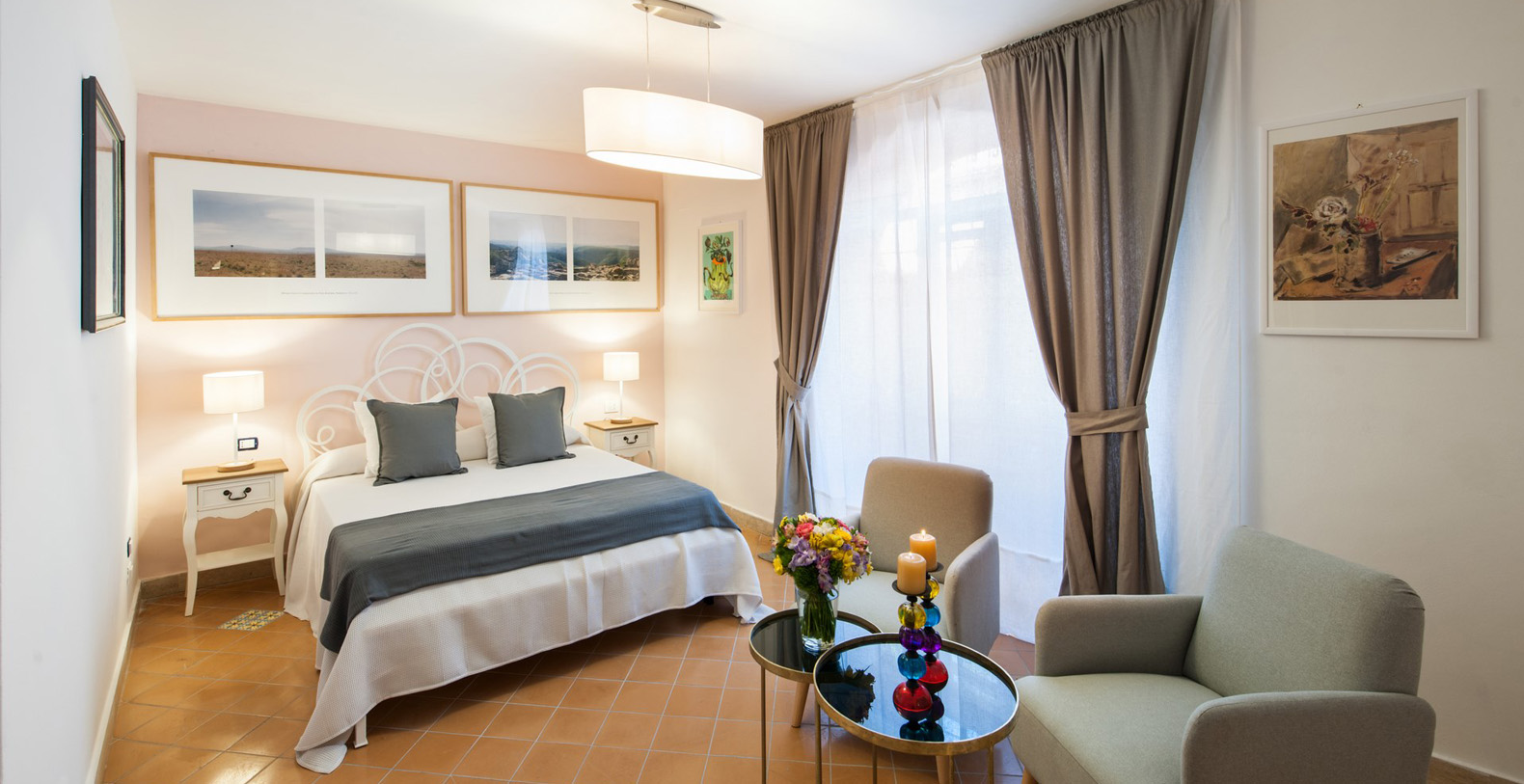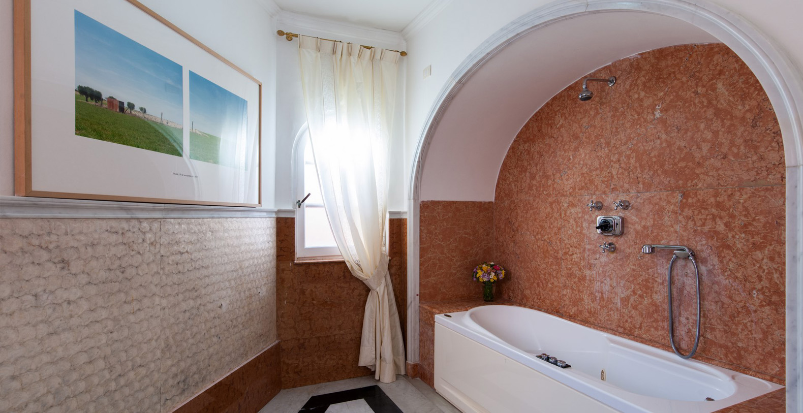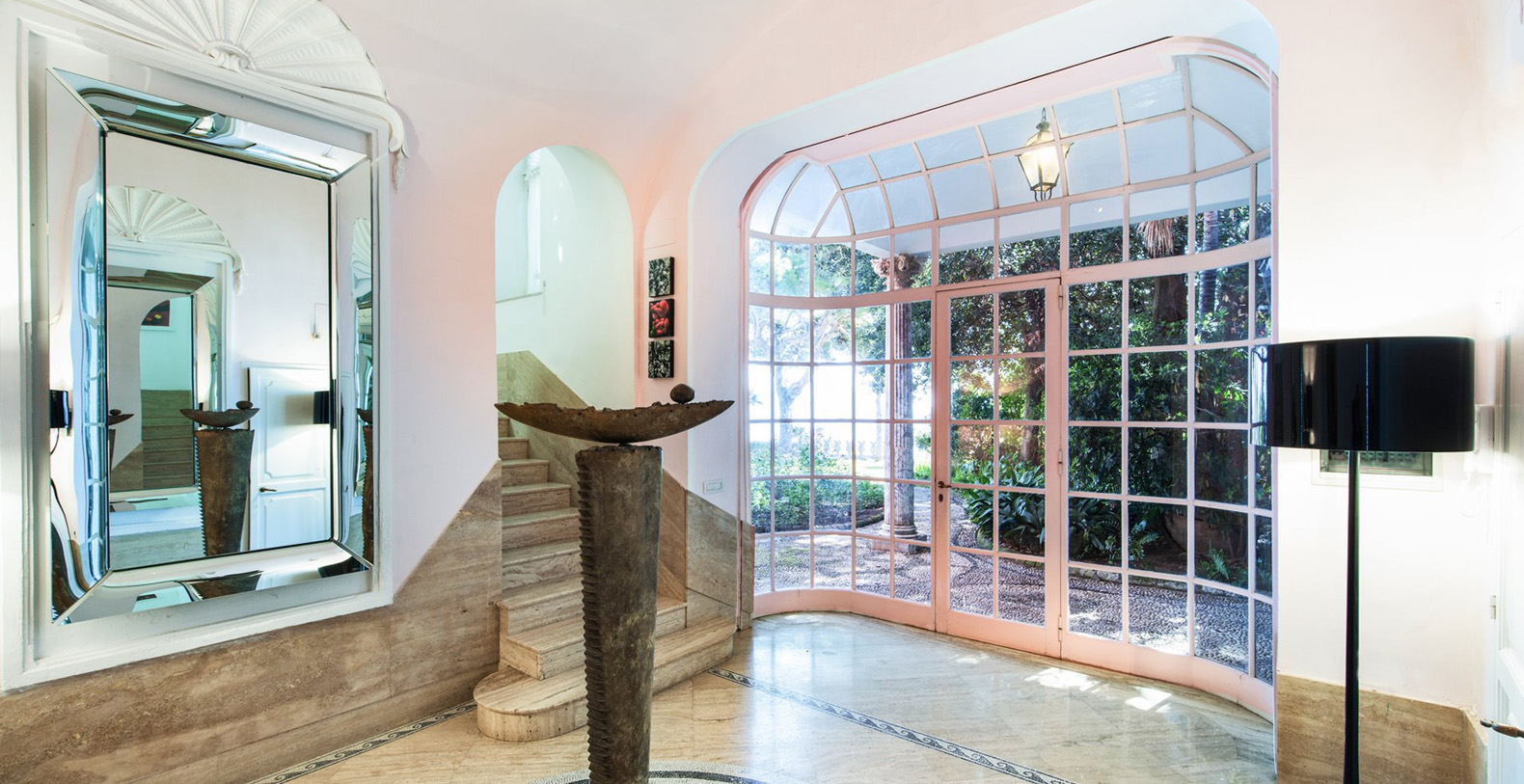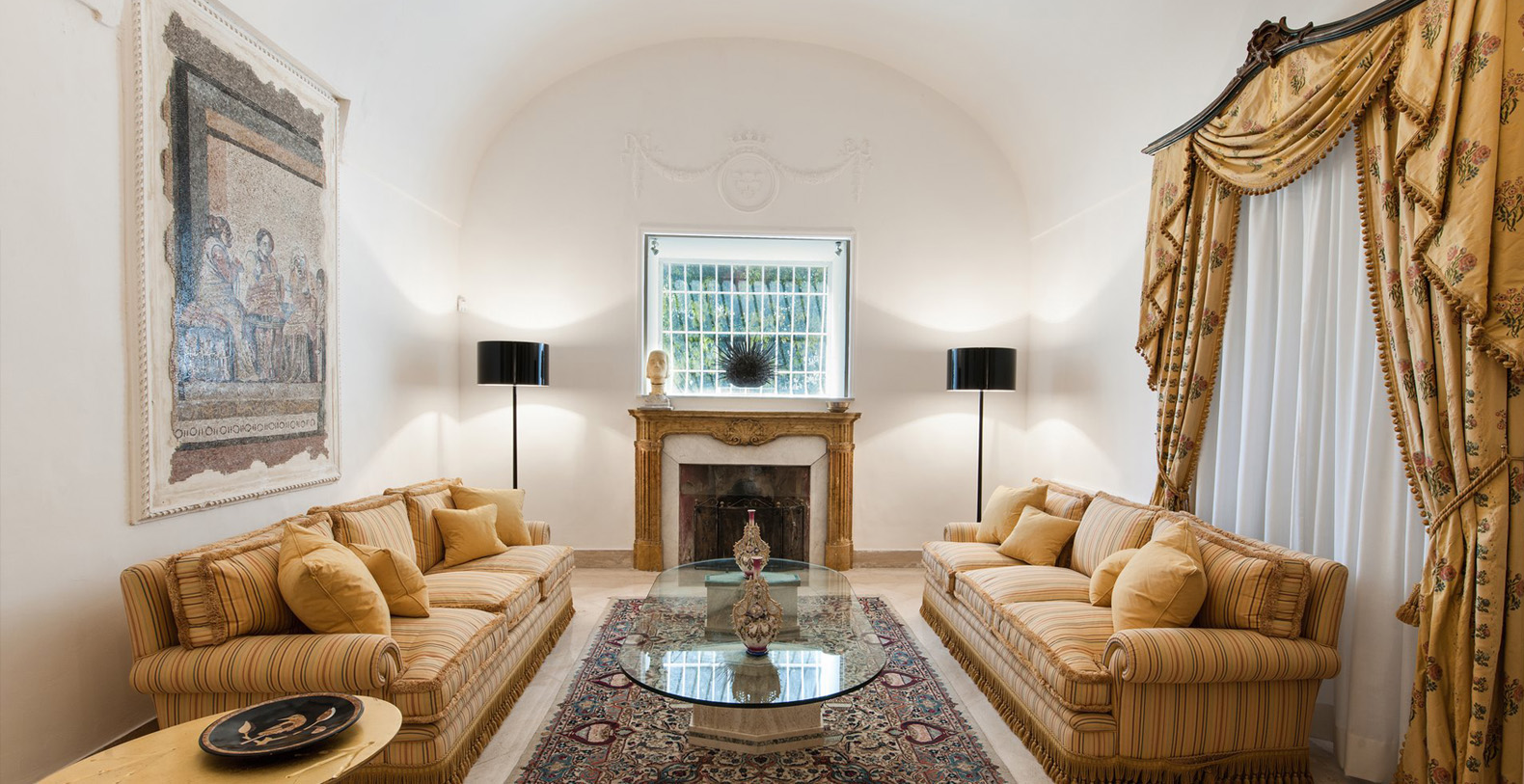 The elegant entrance door welcomes guests into the main hall. A warm welcome is given by the elegant and majestic hall lined with a black and white marble floor and lined with decorative mirrors. A modern art sculpture reflects the mixture of antique and modern, which characterize the setting of the entire villa. Antique mirrors with crystal wall lamps create a lovely contrast between modern and antique, as seen throughout the entire property. Upon walking through the hall, one enters into the living area furnished with marble tables. Sofas and various pockets for reading and relaxation, all arranged around the large fireplace, allows you to enjoy important pieces of history and art such as the one-of-a-kind mosaics hanging on the walls depicting the era of Roman Pompei. A corridor with a glass-door opening on to the left side, towards a terrace area behind the villa, takes you to the lemon trees from where you can enjoy a view out onto the hillside. The left side of the corridor leads to the bedroom and kitchen areas.