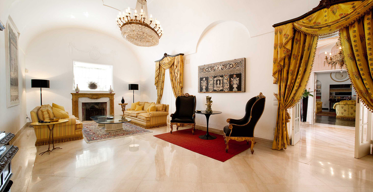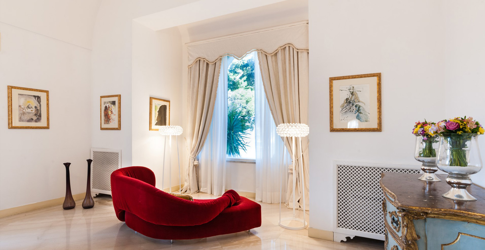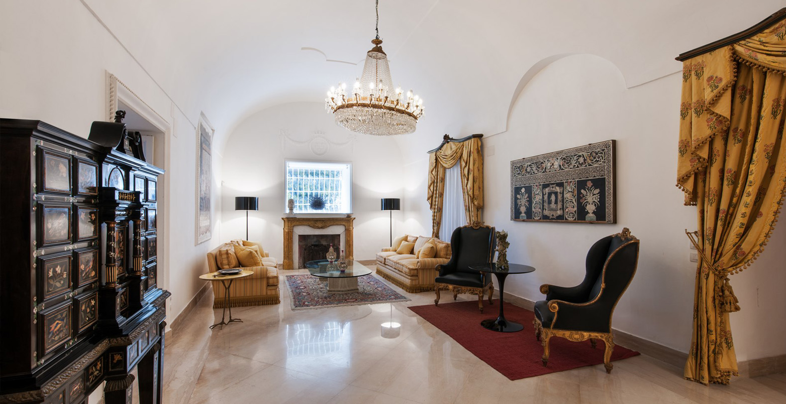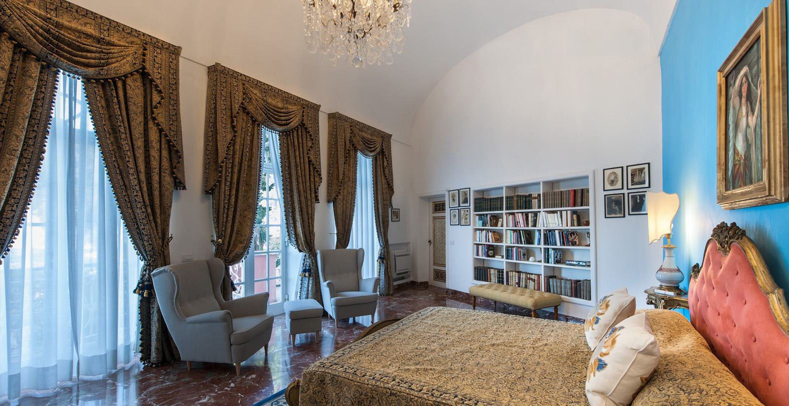 The Villa Camelia complex consists of two connecting buildings, extending over two floors. The first area, referred to as The Landlords Residence blends naturally into the Saloni al Mare or Lounges on the Sea, consisting of large, common areas where all the villas guests can unite. Wide lounges with marble floors, vaulted ceilings, antique crystal lamps, important pieces of antique furniture, and renowned works of art reflect the owner's sophisticated taste as a true art lover and expert.