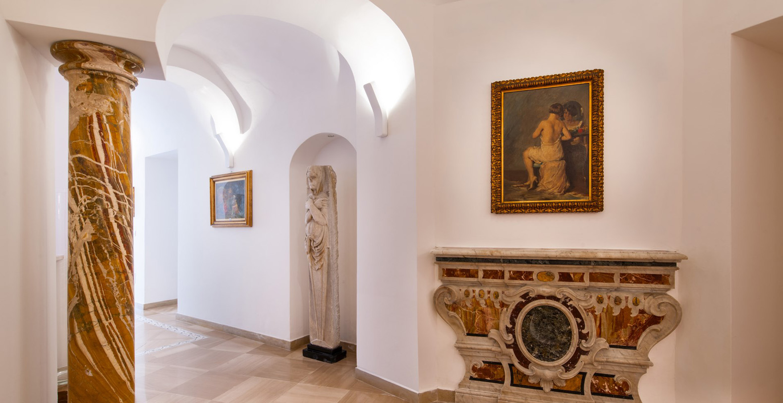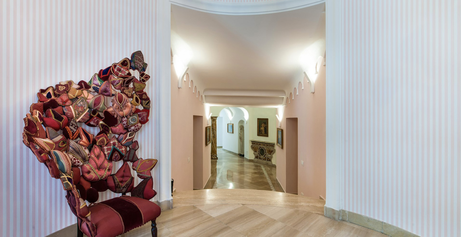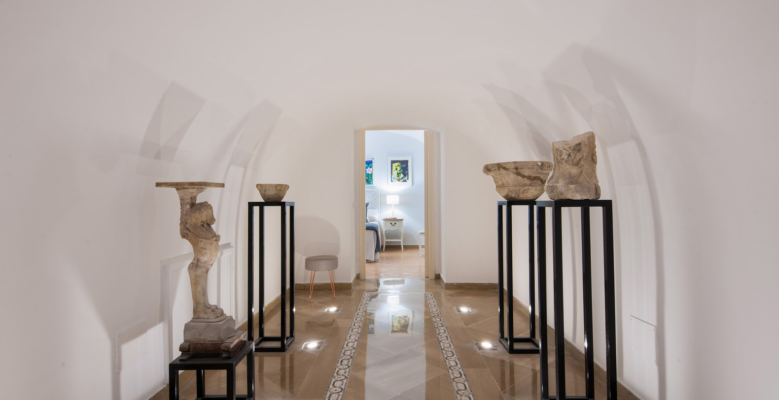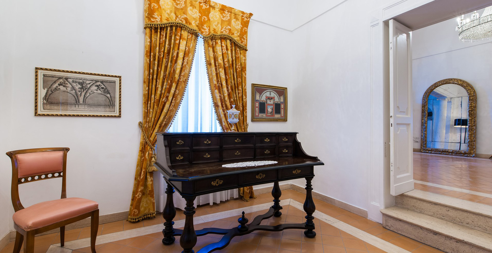 The first floor and its four luxurious suites can be reached from either the hall, the main corridor, or from the garden. 15 steps lead from the hall along a marble staircase up to the first two suites.