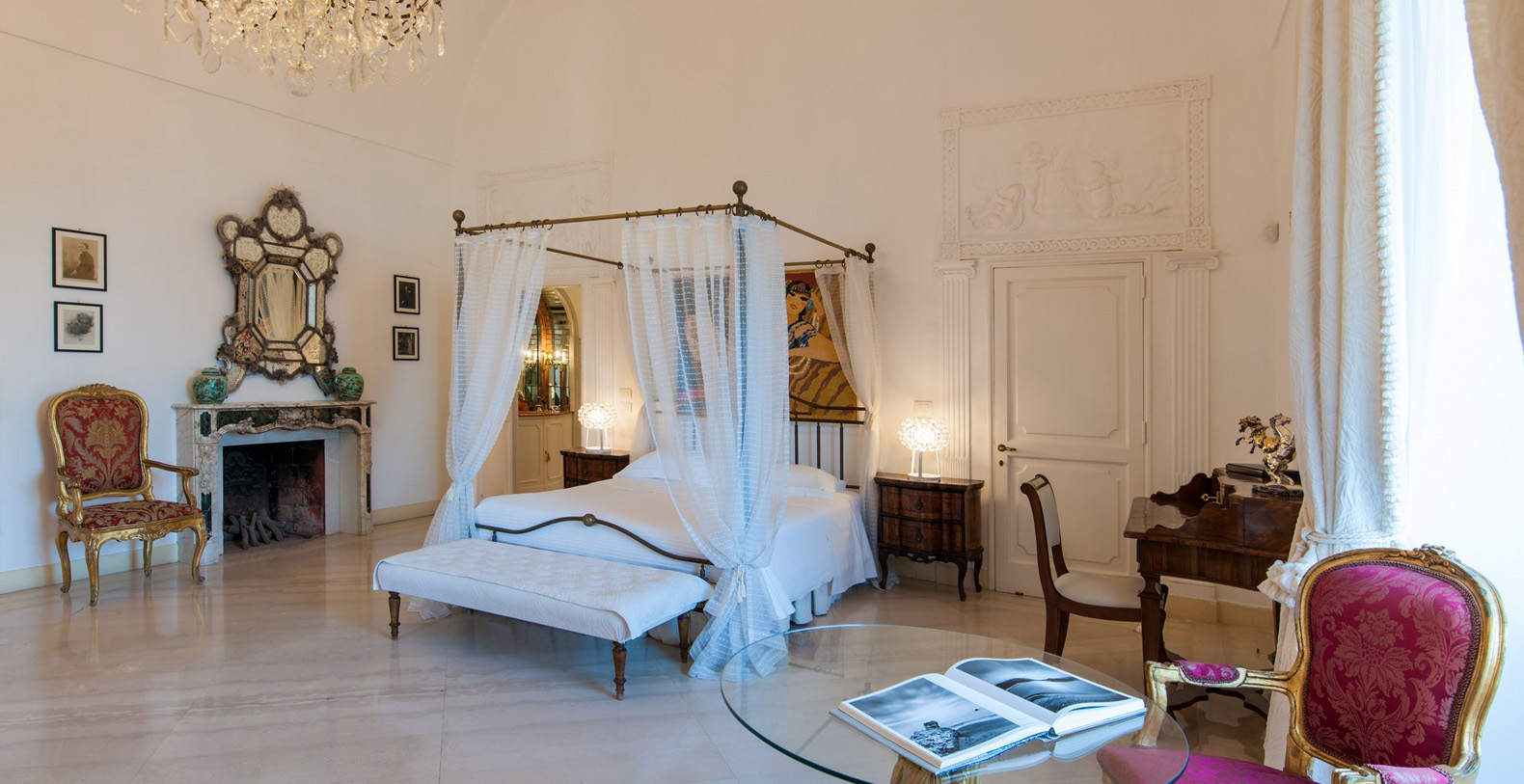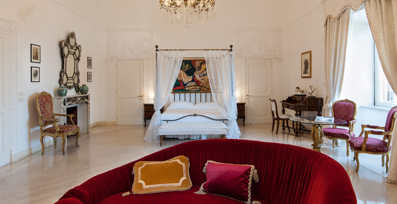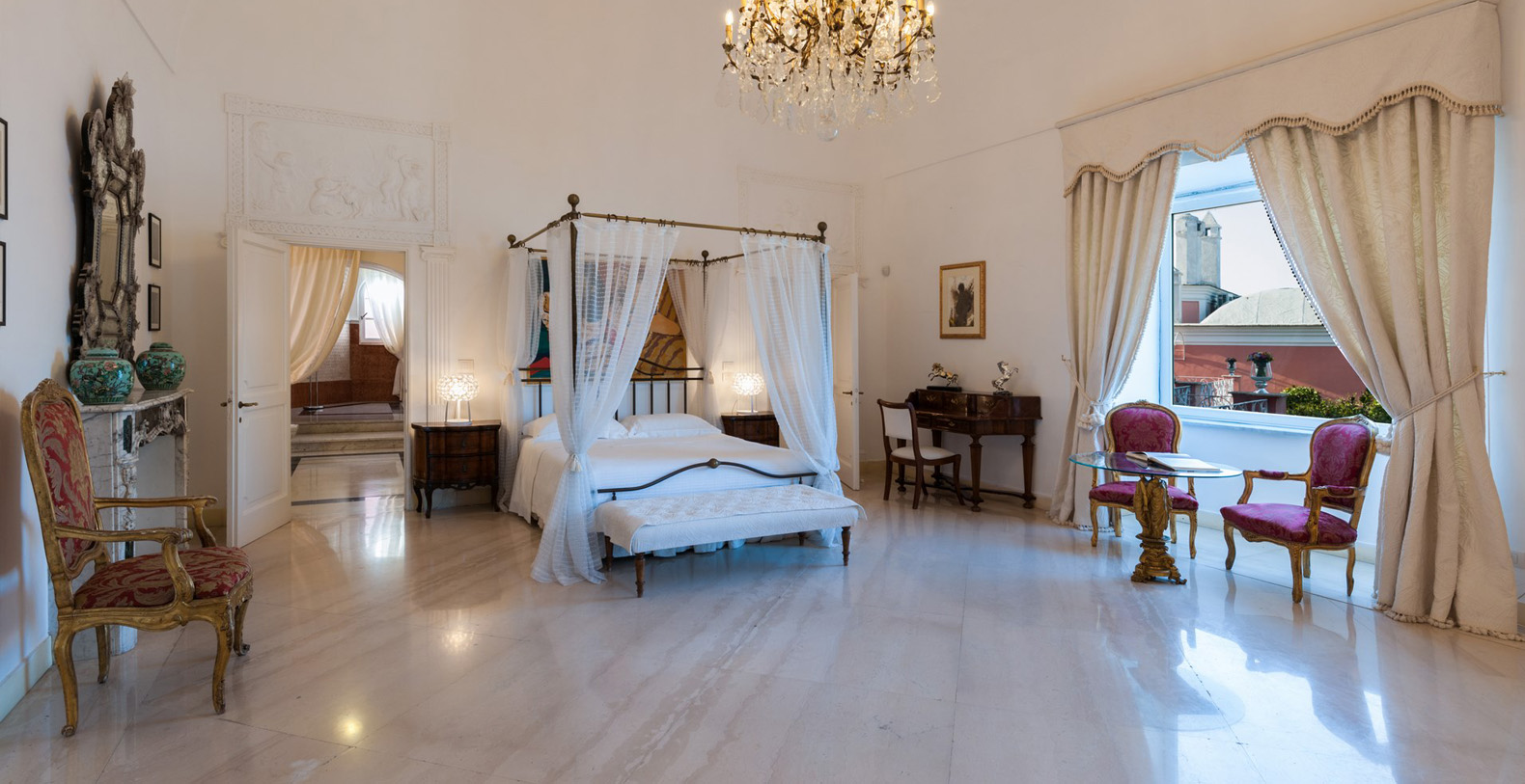 The large, contemporary suite boasts two wide, panoramic windows overlooking the garden, offering its guests an amazing sea view. A Baldachin double bed, chaise lounge, small table, writing desk with chair, and working fireplace add to the vaulted ceiling, large mirror, antique furniture, and crystal lamp which complete the elegance of the master suite. The suite boasts a large, en-suite bathroom with walls in mother of pearl, marble floors, and a bathtub adorned by red marble.