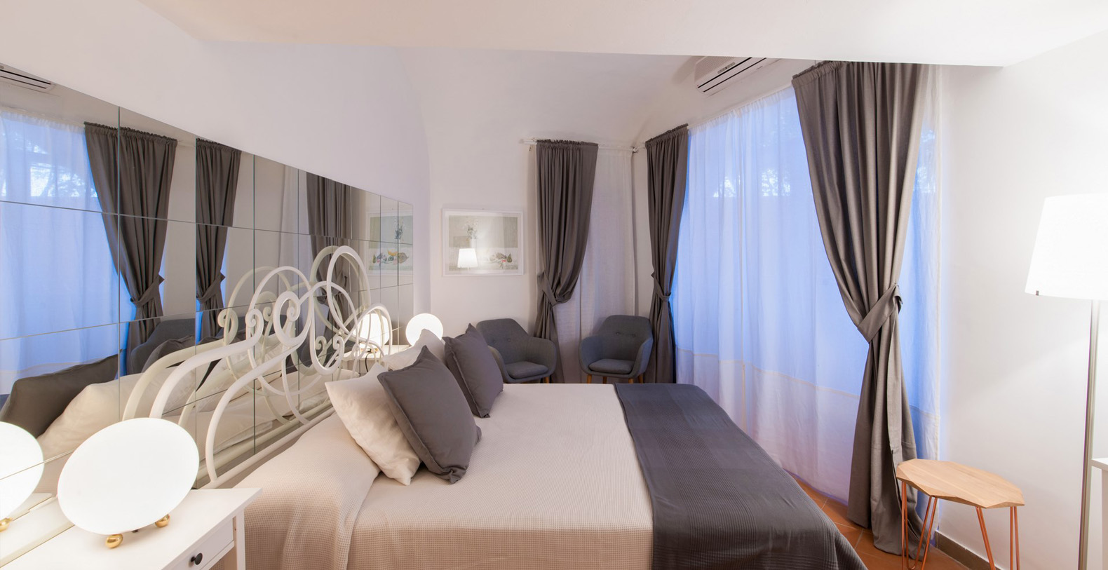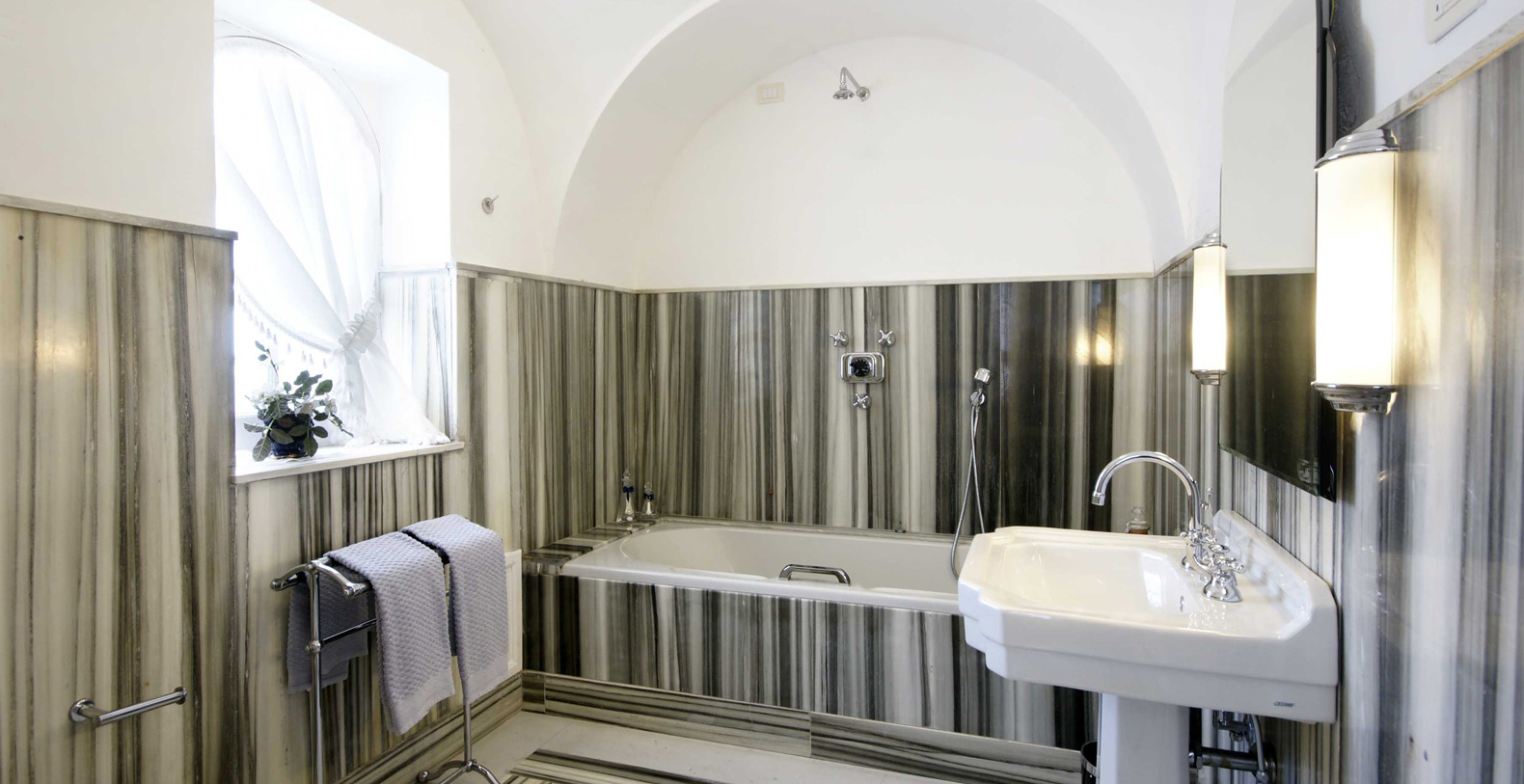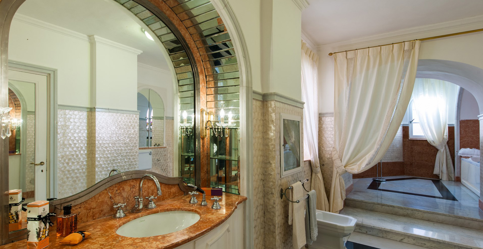 The large, contemporary suite boasts two wide, panoramic windows overlooking the garden, offering its guests an amazing sea view. A Baldachin double bed, chaise lounge, small table, writing desk with chair, and working fireplace add to the vaulted ceiling, large mirror, antique furniture, and crystal lamp which complete the elegance of the master suite. The suite boasts a large, en-suite bathroom with walls in mother of pearl, marble floors, and a bathtub adorned by red marble.