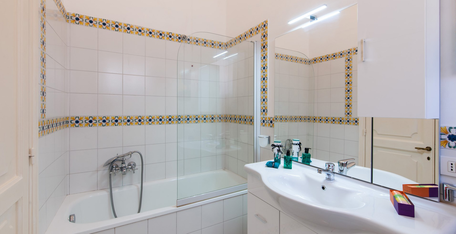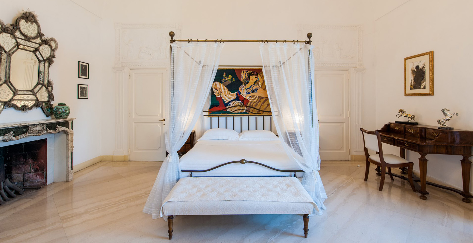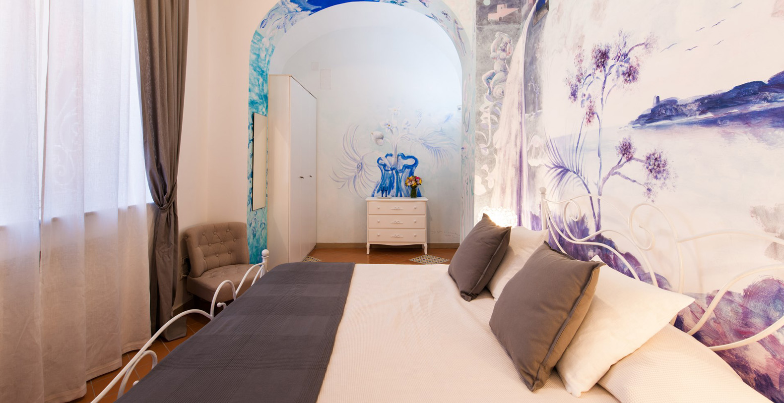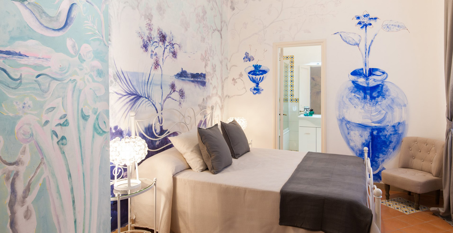 French bed with hand painted wall décor by a well known Italian Artist, tiled floor, and built-in wardrobe; en-suite bathroom with white tiles and bathtub.