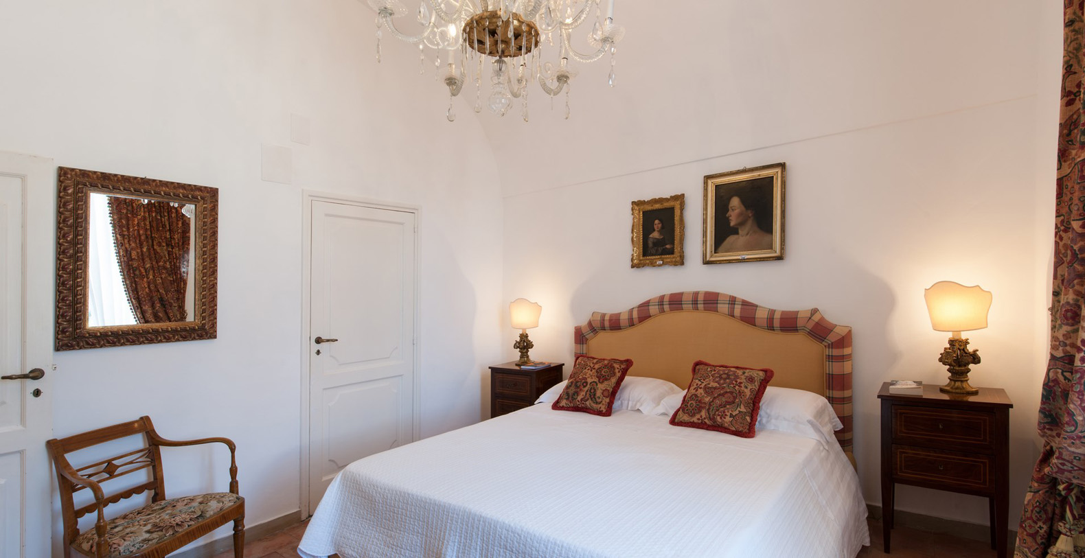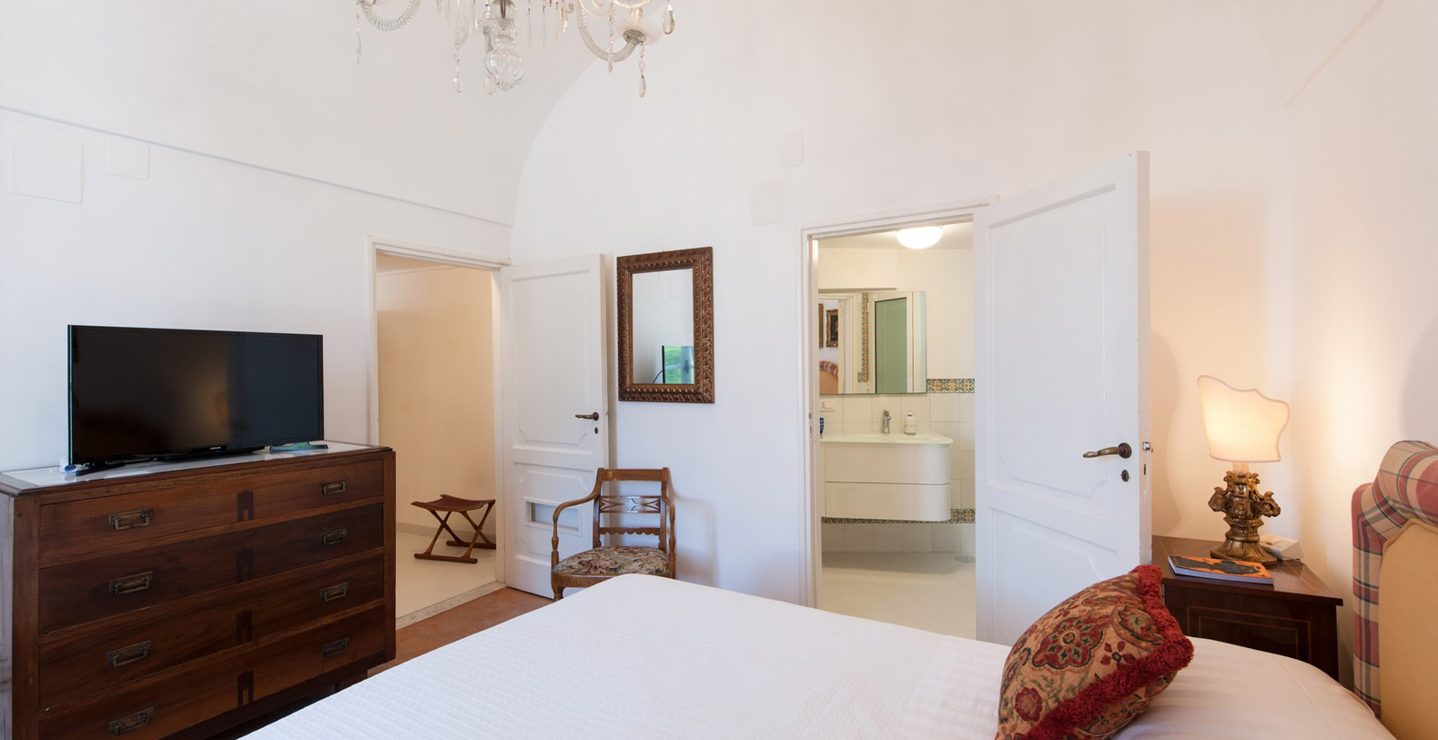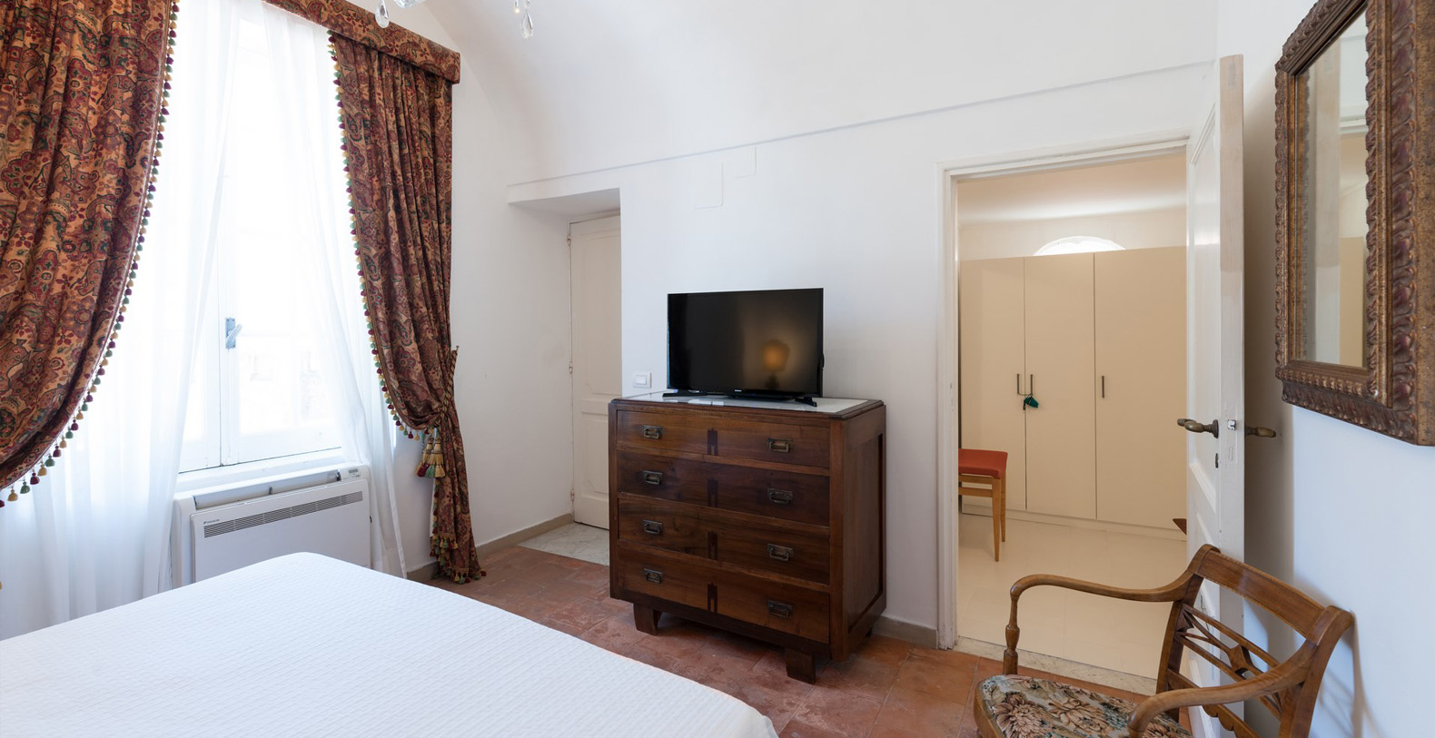 Located four steps up from the main corridor, the first bedroom is a double with baldachin bed and terracotta tile floor. The room is furnished with two wood benches, a wardrobe, and a writing desk with chair; en-suite bathroom with white tiles and shower box.