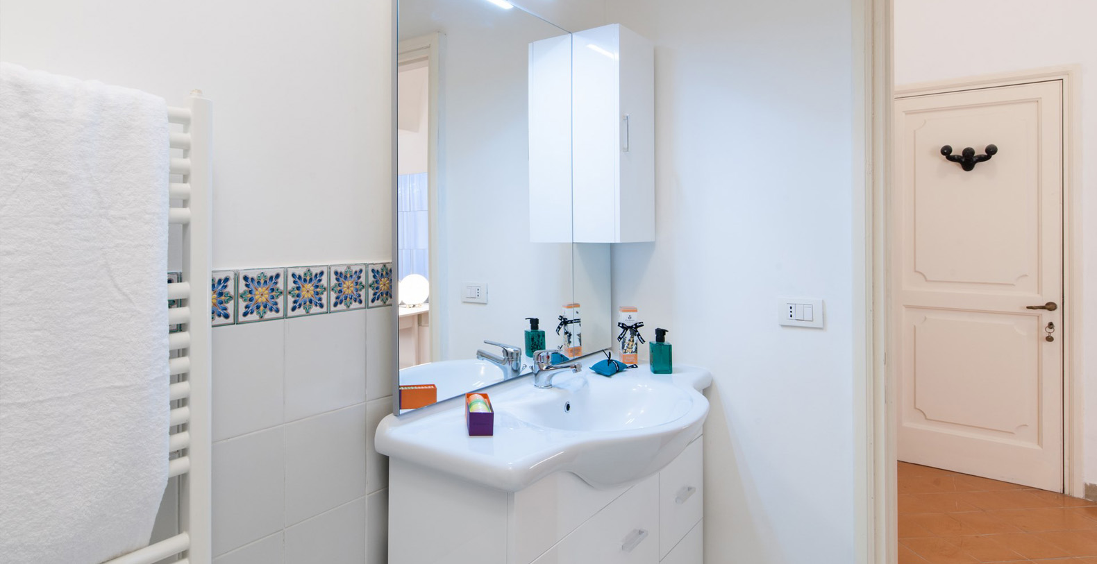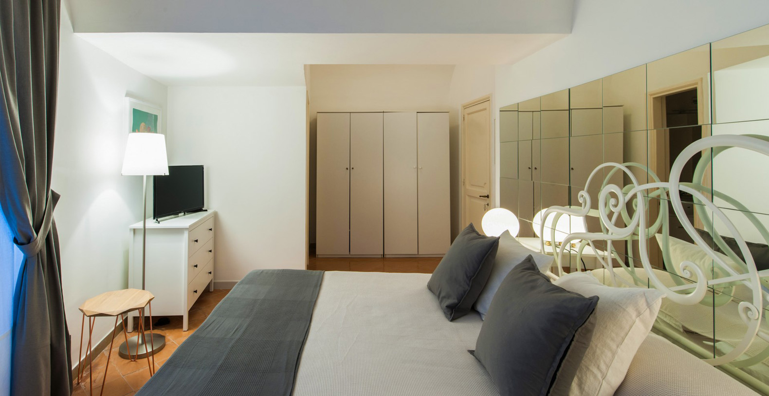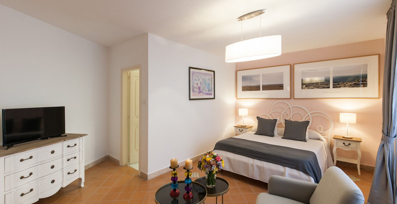 Located four steps up from the main corridor, the first bedroom is a double with baldachin bed and terracotta tile floor. The room is furnished with two wood benches, a wardrobe, and a writing desk with chair; en-suite bathroom with white tiles and shower box.