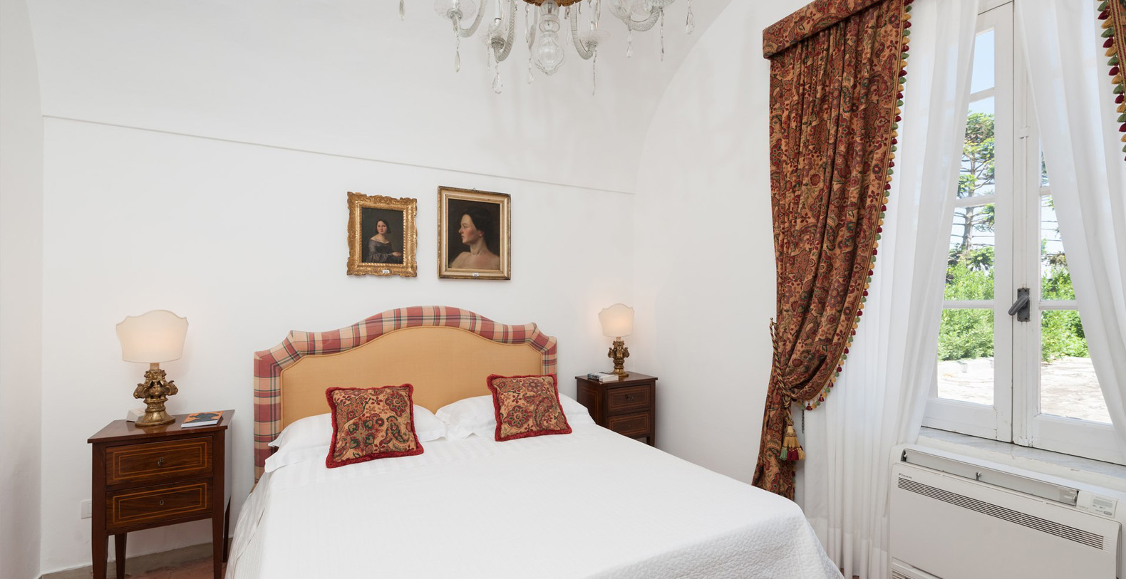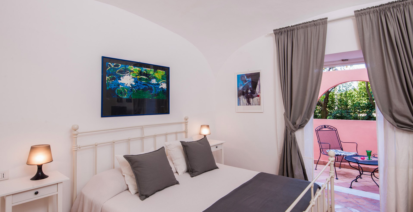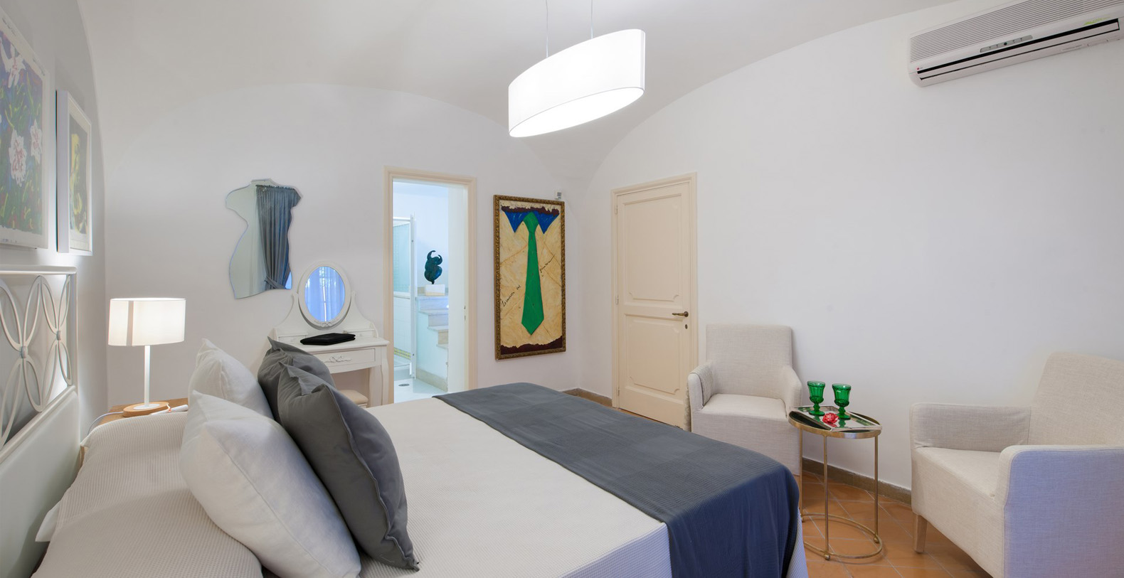 Reachable up 19 steps from the garden, lies the second suite with a double bed. Two French doors facing the garden offer unique sea views and the suite boasts dark red, marble floors, vaulted ceilings, crystal lamps, and a writing desk. There is a private, external bathroom with access from the wardrobe area of the suite. The bath enjoys white hand-made tile floors and a large shower.