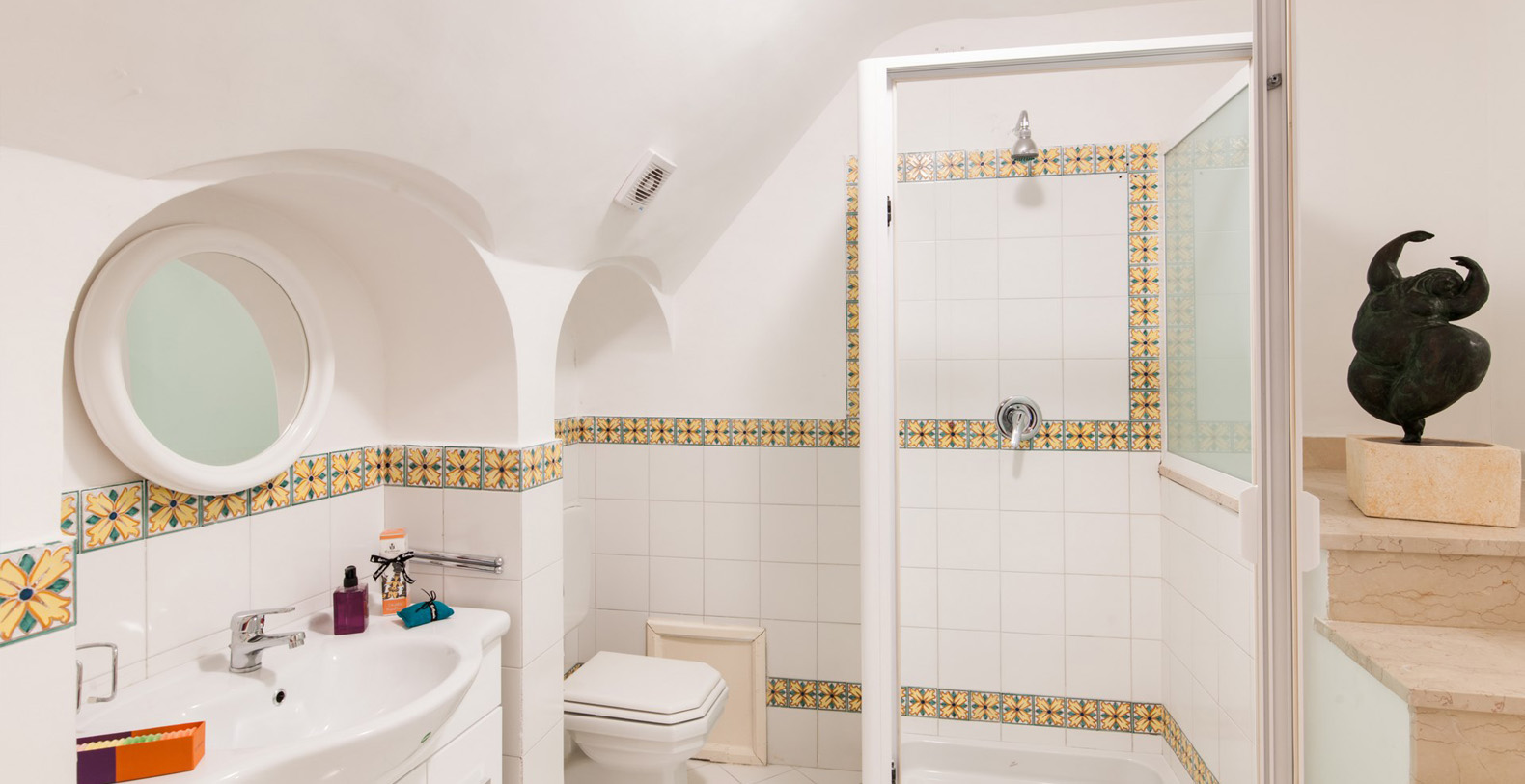 Accessible up 19 steps from the courtyard, the third suite enjoys a small living area with terracotta tile floors, 2 sofas, and several couches. There is a window facing the courtyard and vaulted ceilings abound, while a crystal lamp, ample closet and en-suite bathroom with white tile floors and shower box finish the decor.