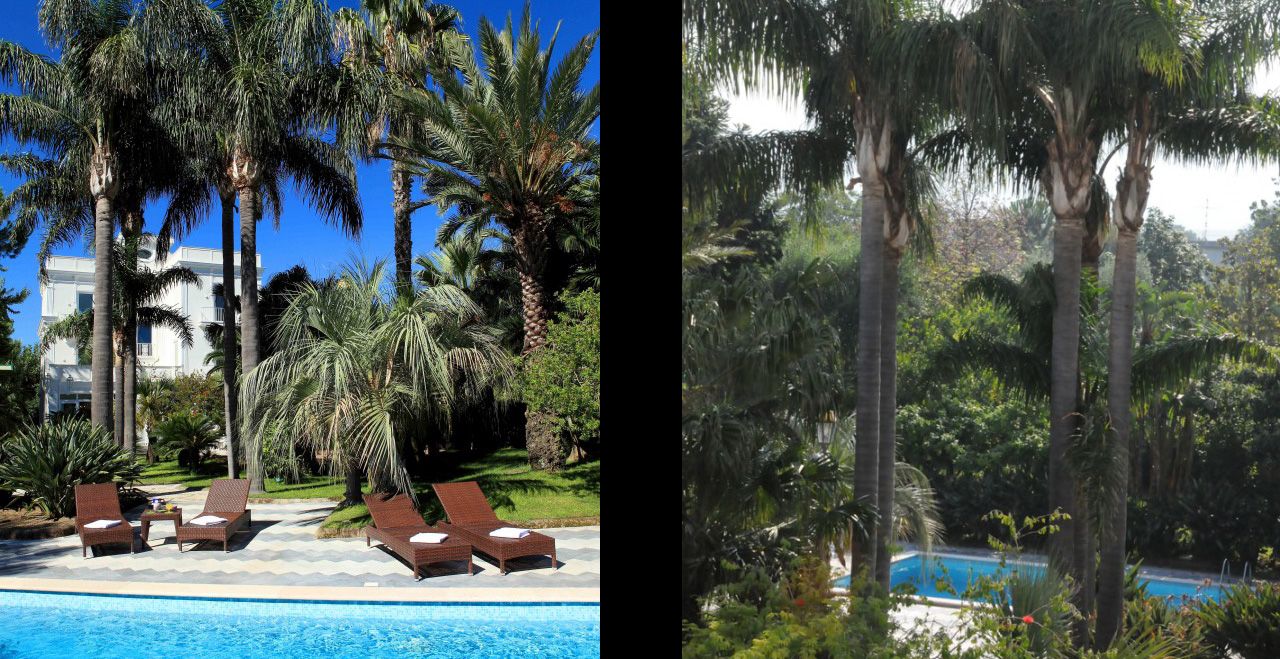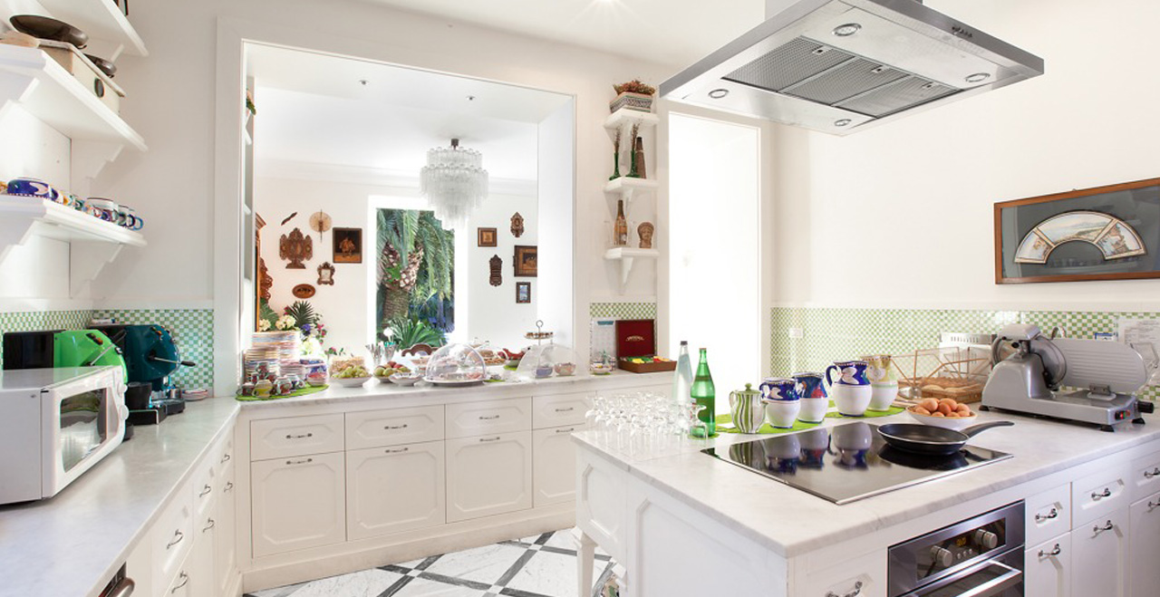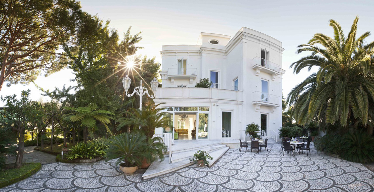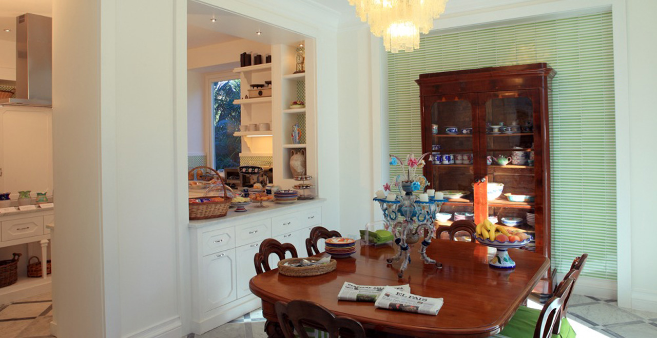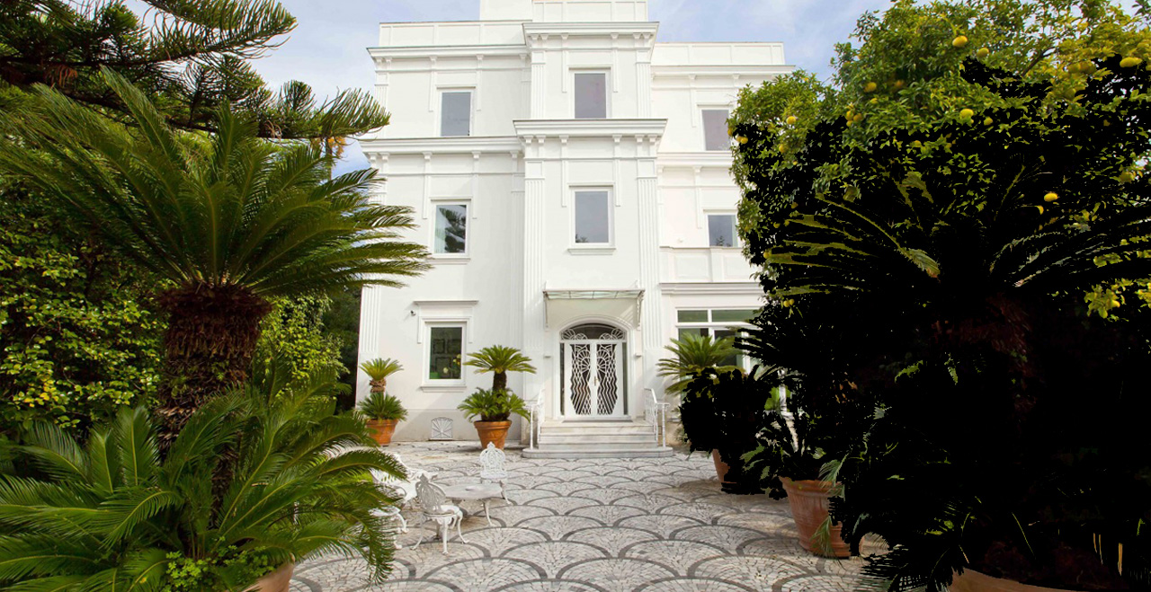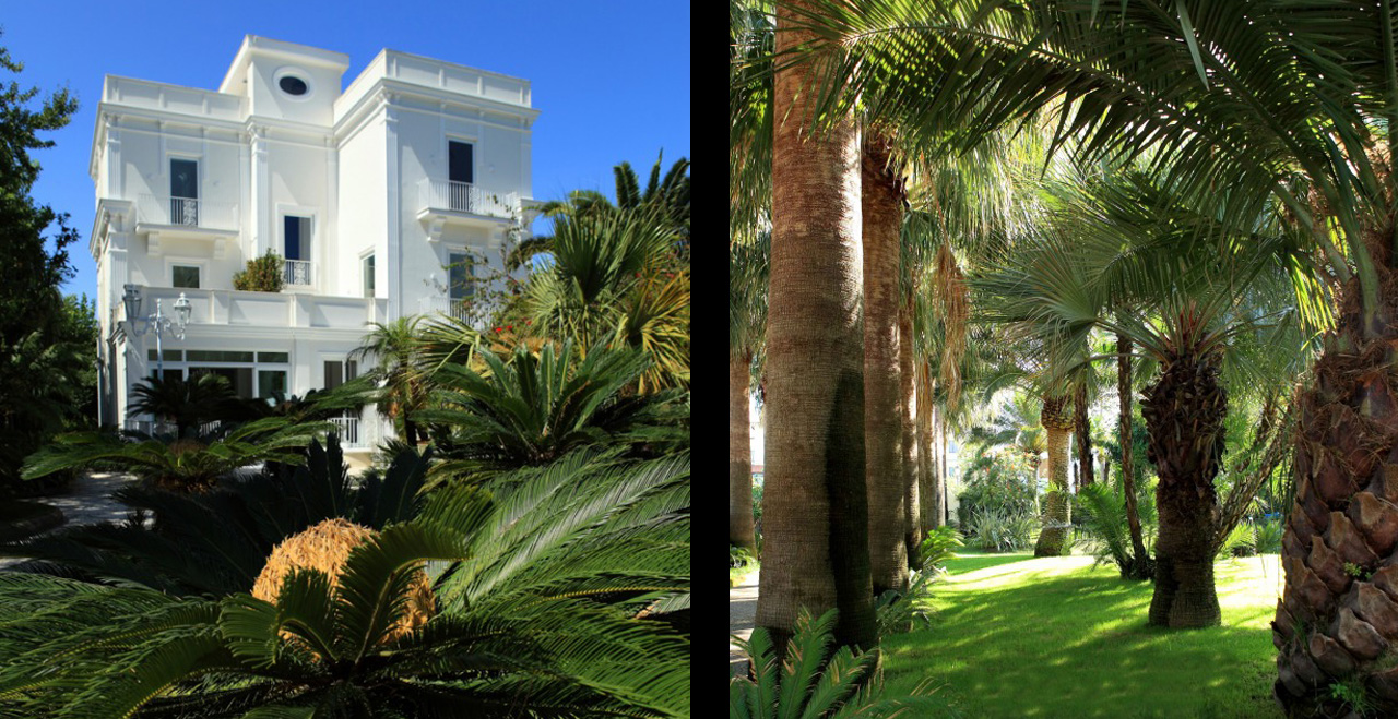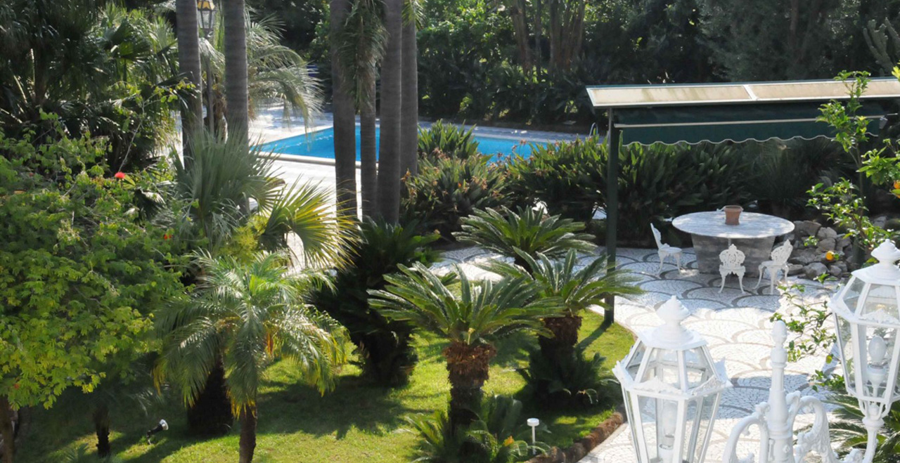 Along the park, some small art exhibitions will take place, set in a real open space gallery. Special features inside the Villa include some fine paintings, and elegant furniture, much of it made in the famous inlaid wood style by craftsmen from Sorrento. Beautiful glass handeliers from Murano light up the cool and spacious public areas, and also highlight not just the floors with their original ceramic Vietri tiles, but also an unusual collection of old clay pots.
