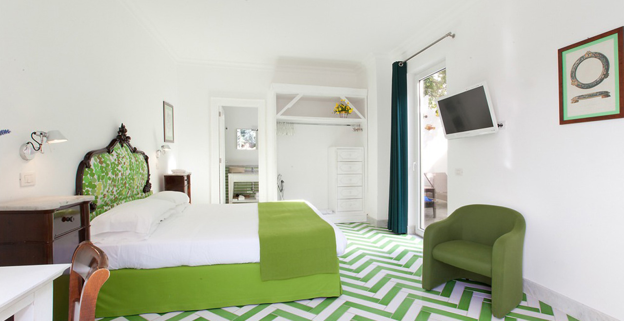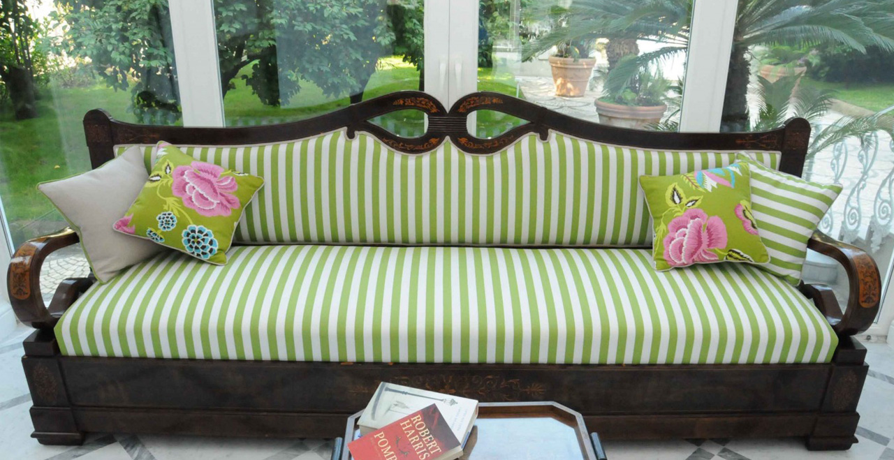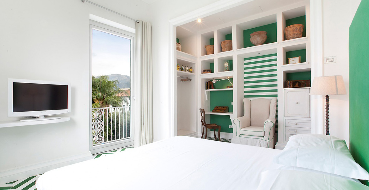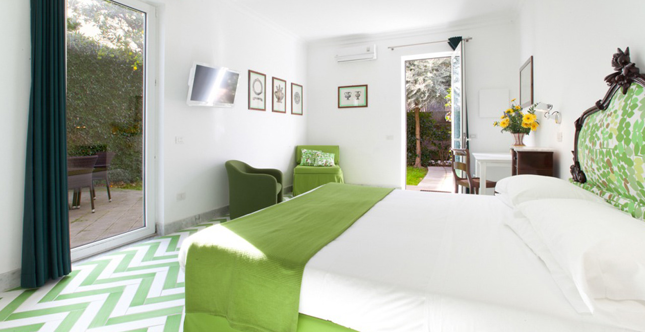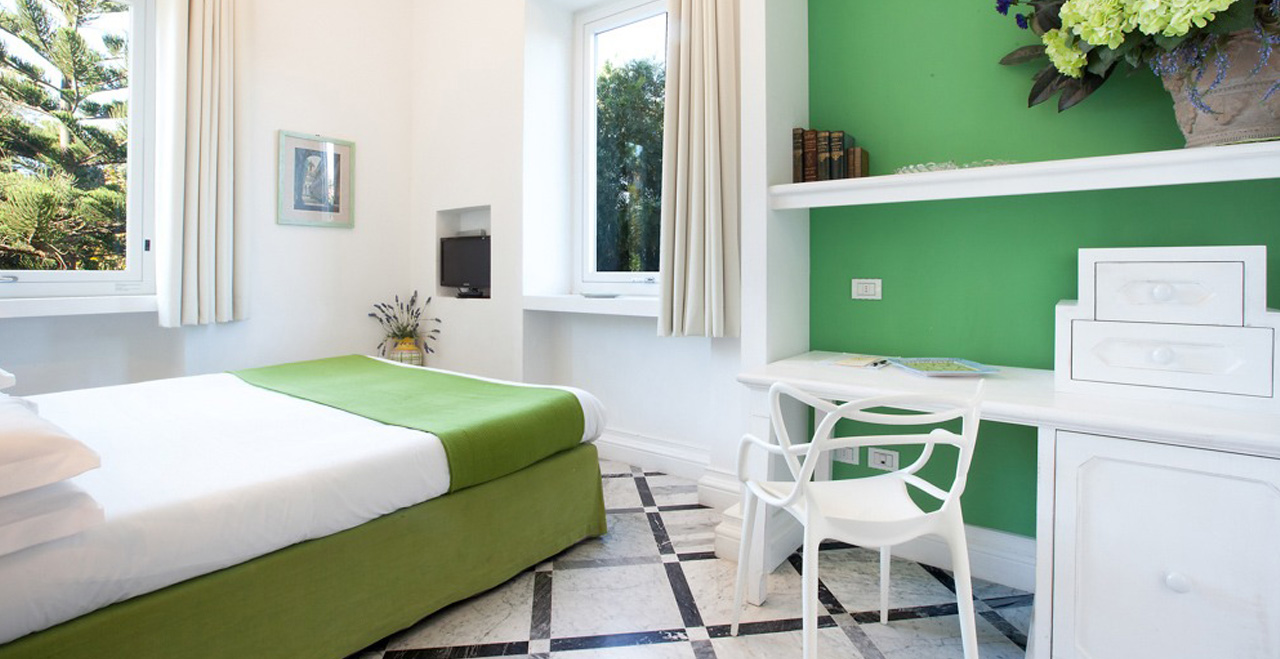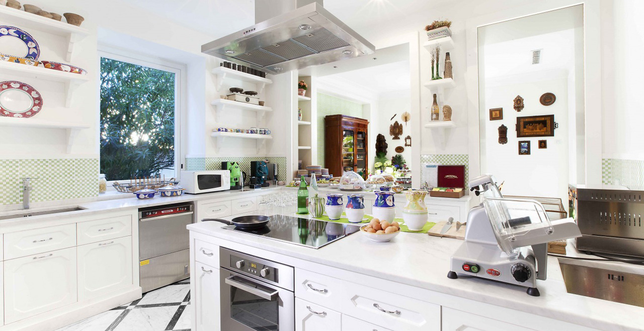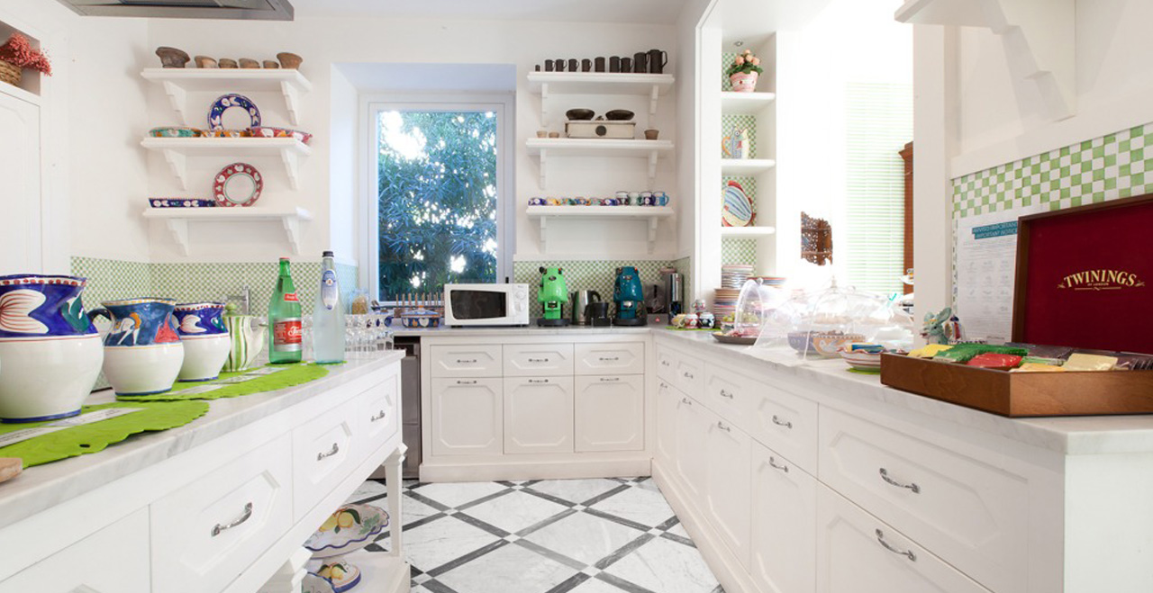 Along the park, some small art exhibitions will take place, set in a real open space gallery. Special features inside the Villa include some fine paintings, and elegant furniture, much of it made in the famous inlaid wood style by craftsmen from Sorrento. Beautiful glass handeliers from Murano light up the cool and spacious public areas, and also highlight not just the floors with their original ceramic Vietri tiles, but also an unusual collection of old clay pots.