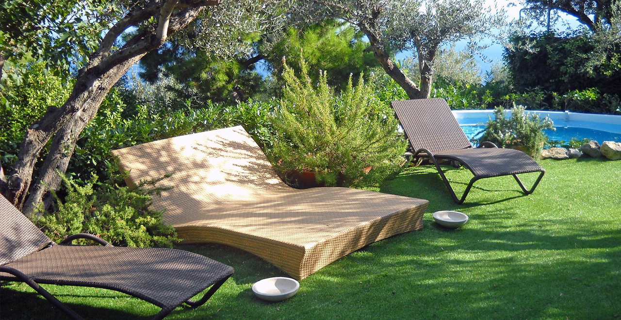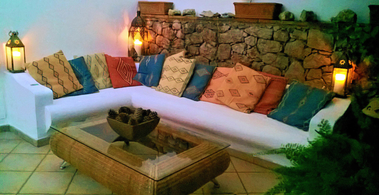 Outdoor seating terrace with wall sofas