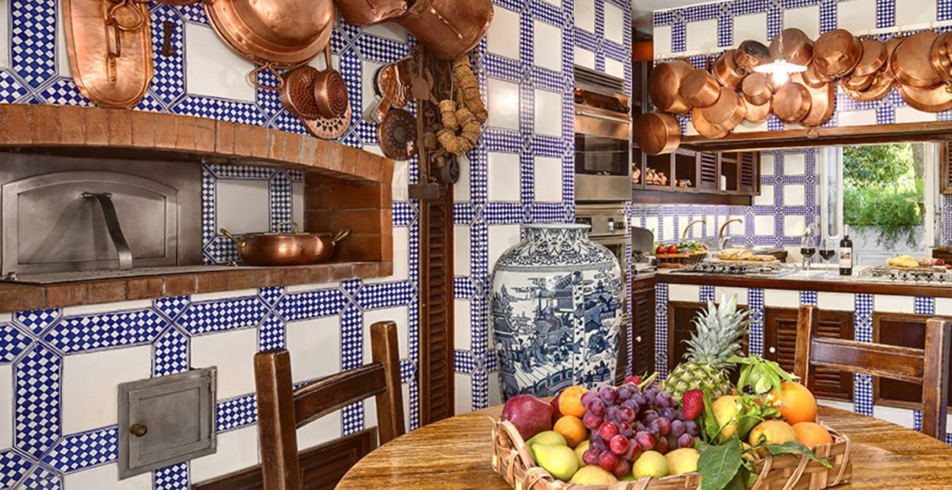 Villa Liberty interiors are classic in design with parquet flooring, beautiful artwork adorns the walls and comfortable stylish furniture is throughout this Italy villa rental. A beautiful blue and yellow ceramic tiled gourmet kitchen with state of the art equipment is featured at Villa Liberty. Large copper pots hang over the preparation island and side wall adding to these fine Italy accommodations. Large ceramic urns sit beside a wonderful pizza oven with wooden dining table complete Villa Liberty kitchen accommodations. Outside the kitchen is an incredible terrace with large potted palms giving way to the gorgeous swimming pool with rattan chase lounges for enjoying the incredible beauty bestowed on guests visiting the majestic Amalfi Coast in Italy.