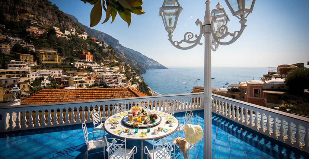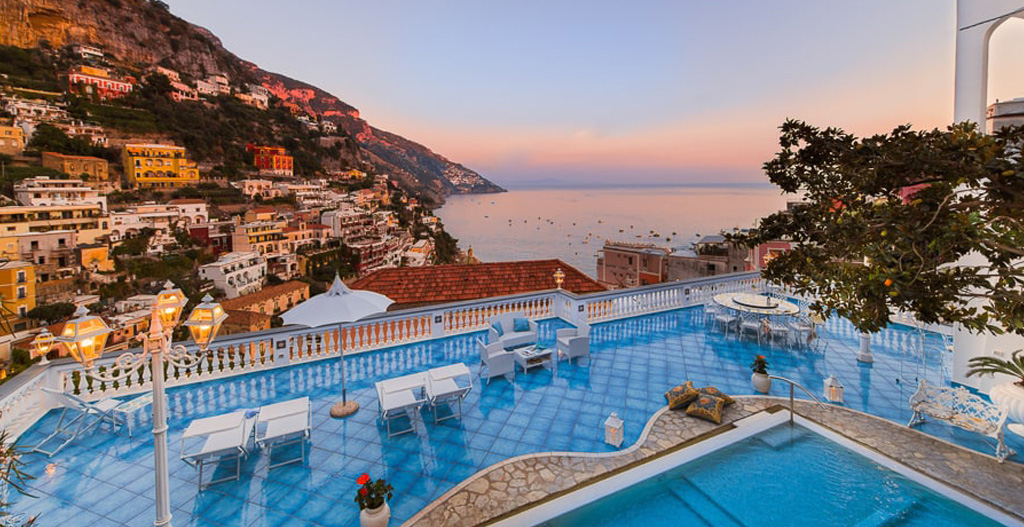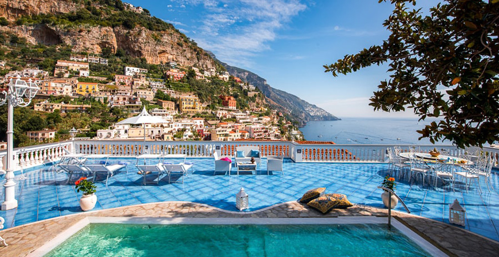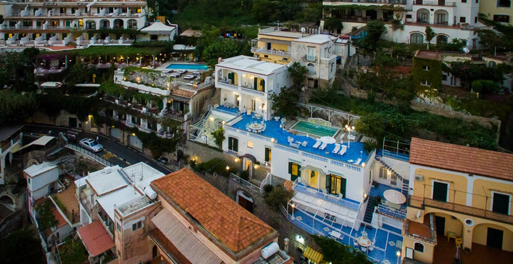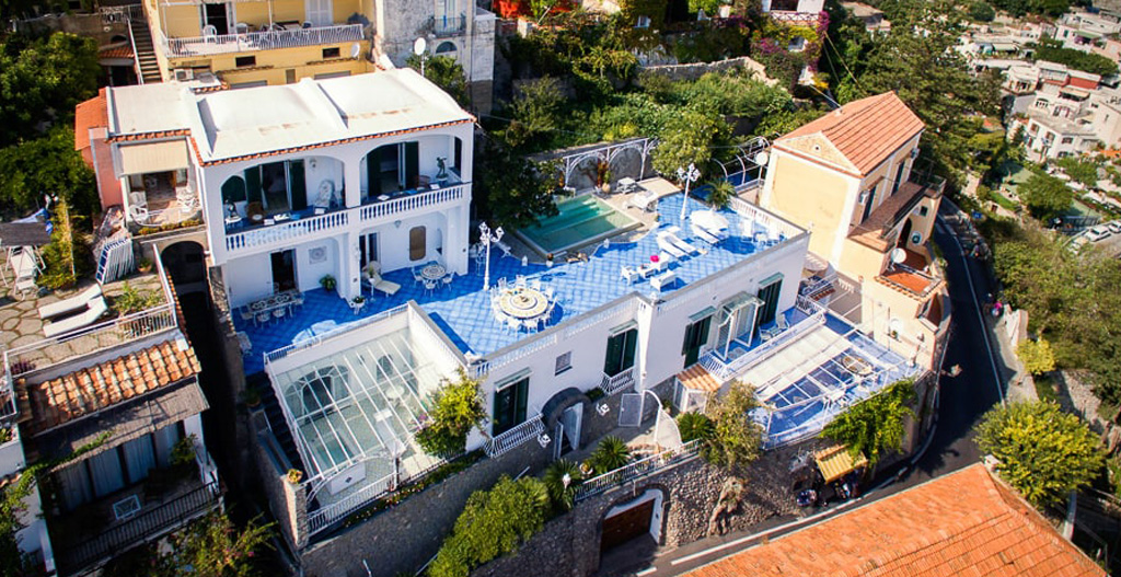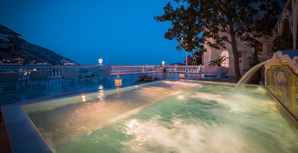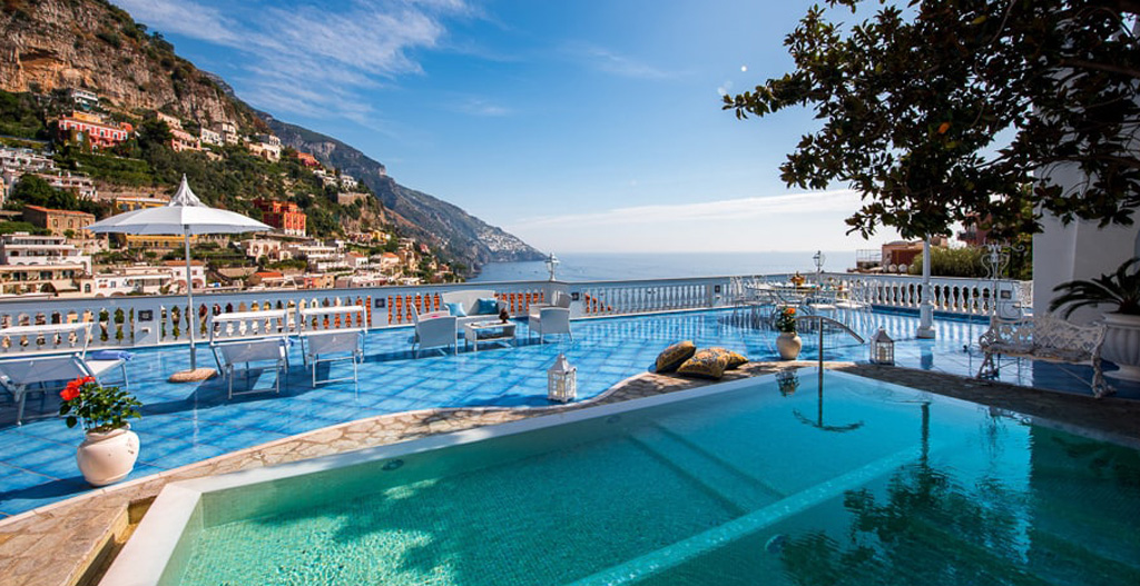 See the Best of Positano. The large terrace at Villa Mon Repos covers a full 200 square meters and is accessible from every level of the villa, so guests can enjoy one of the most exclusive views over Positano. In addition to the sun deck furnished with sun beds and tables and chairs, the terrace is home to the gorgeous rectangular overflow pool with a view, dramatically lit after sunset.