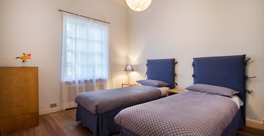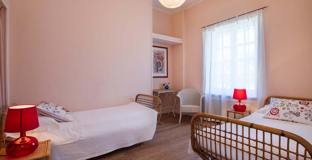 The two wings each contain a master bedroom with double bed and ensuite bathroom with tub, a bedroom with two single beds, a bedroom with double bed, and a bathroom with tub.