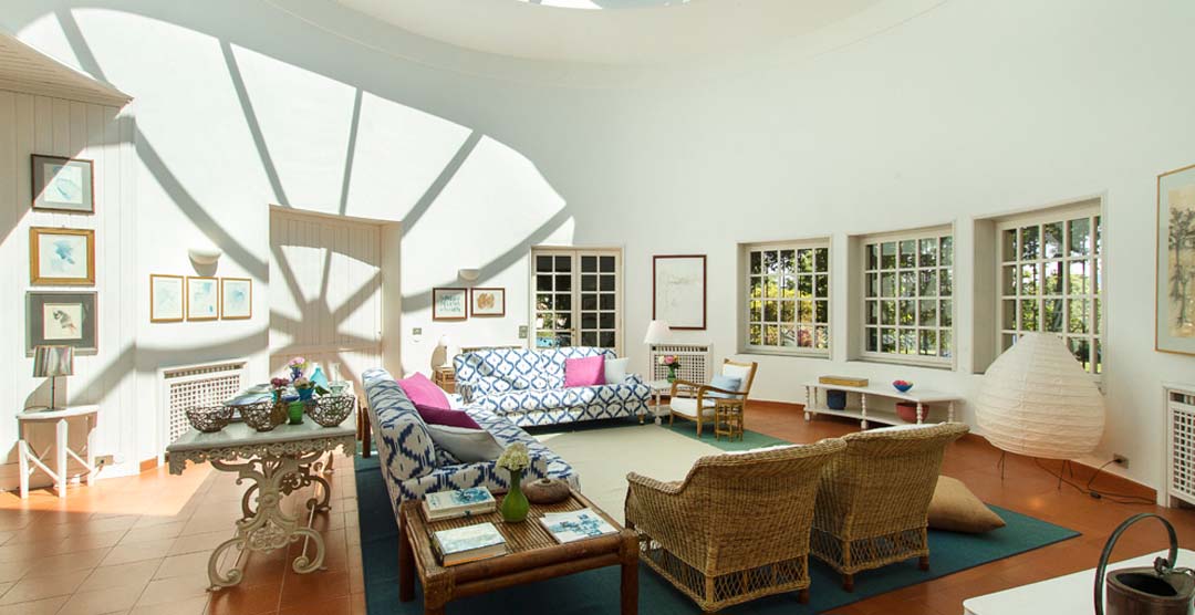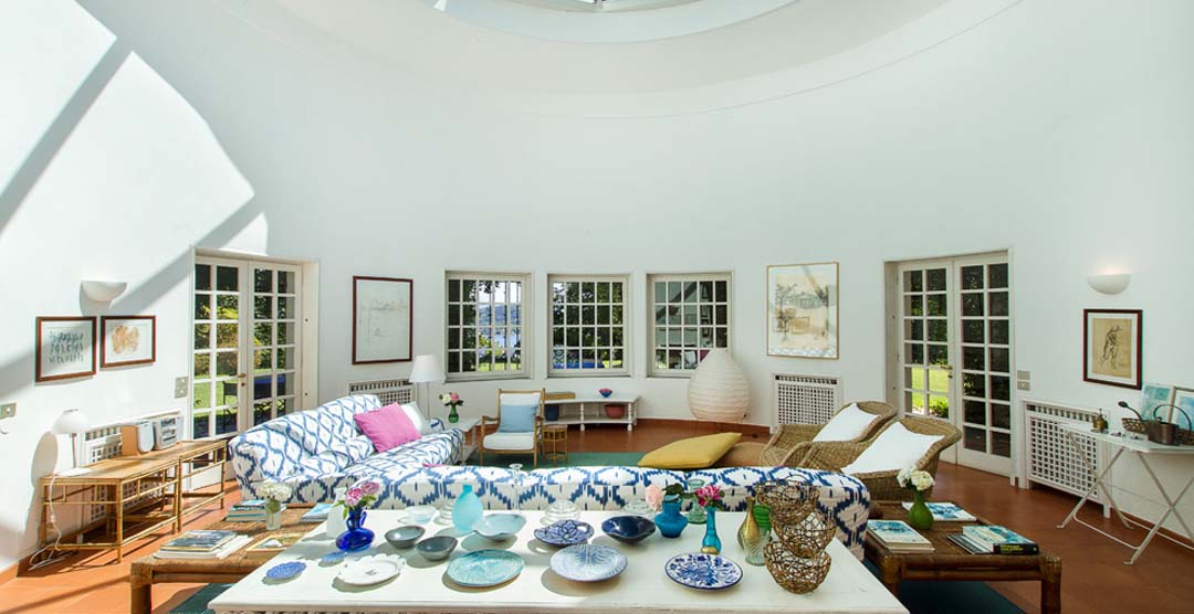 This stylish white villa (700 m²) can accommodate up to 12 people in 6 bedrooms and is conveniently built on one floor in the shape of an airplane with a central circular part and two wings: