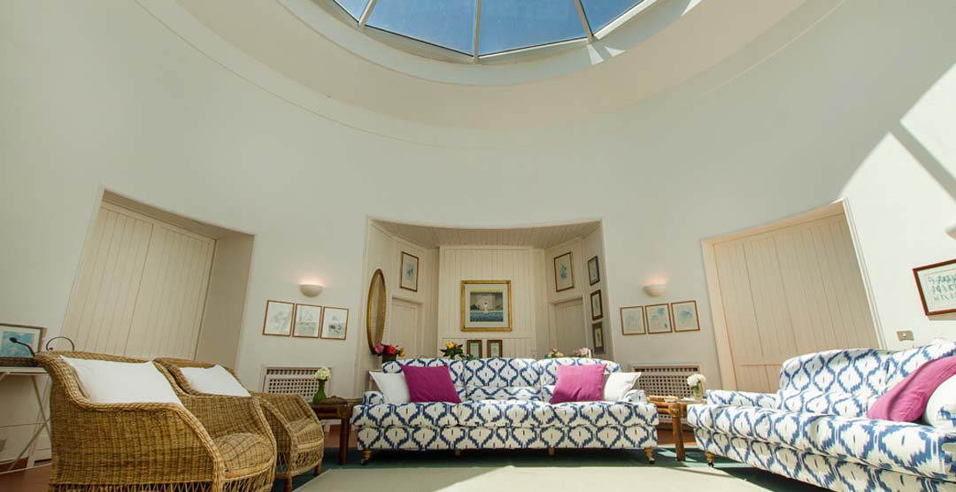 The main circular section consists of the spacious and light living area with couches and access to the terrace, sitting lounge with TV and open fireplace, dining area, spacious kitchen with large wooden table, and a bathroom with shower.