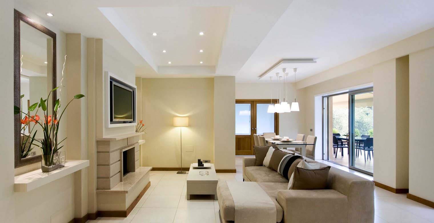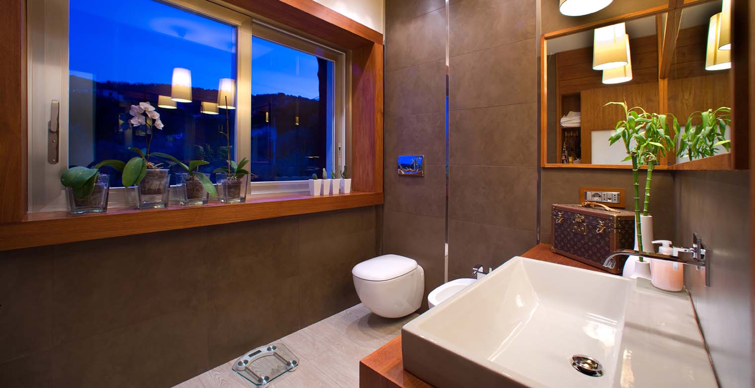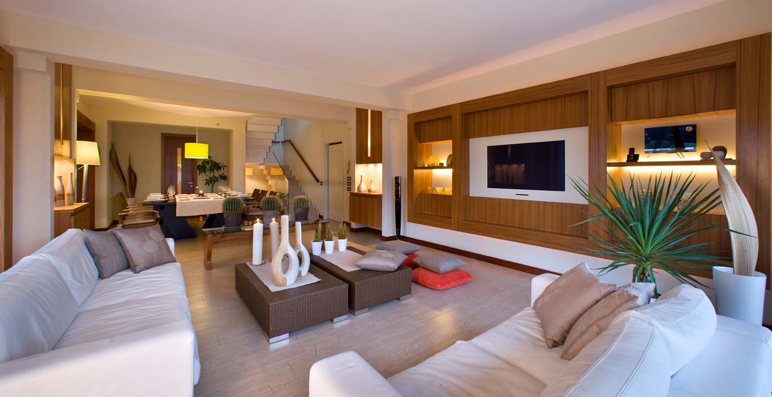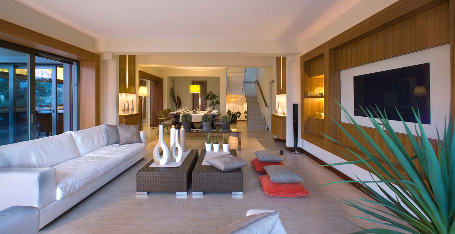 At the entrance of main floor there is a spacious and inviting lounge offering a wonderful space for guests to be together and relax. The space is cosy and welcoming and is furnished with two large leather sofas and a table, a built-in, flat screen SAT-TV and large, sliding glass doors opening onto the terrace surrounding the house.