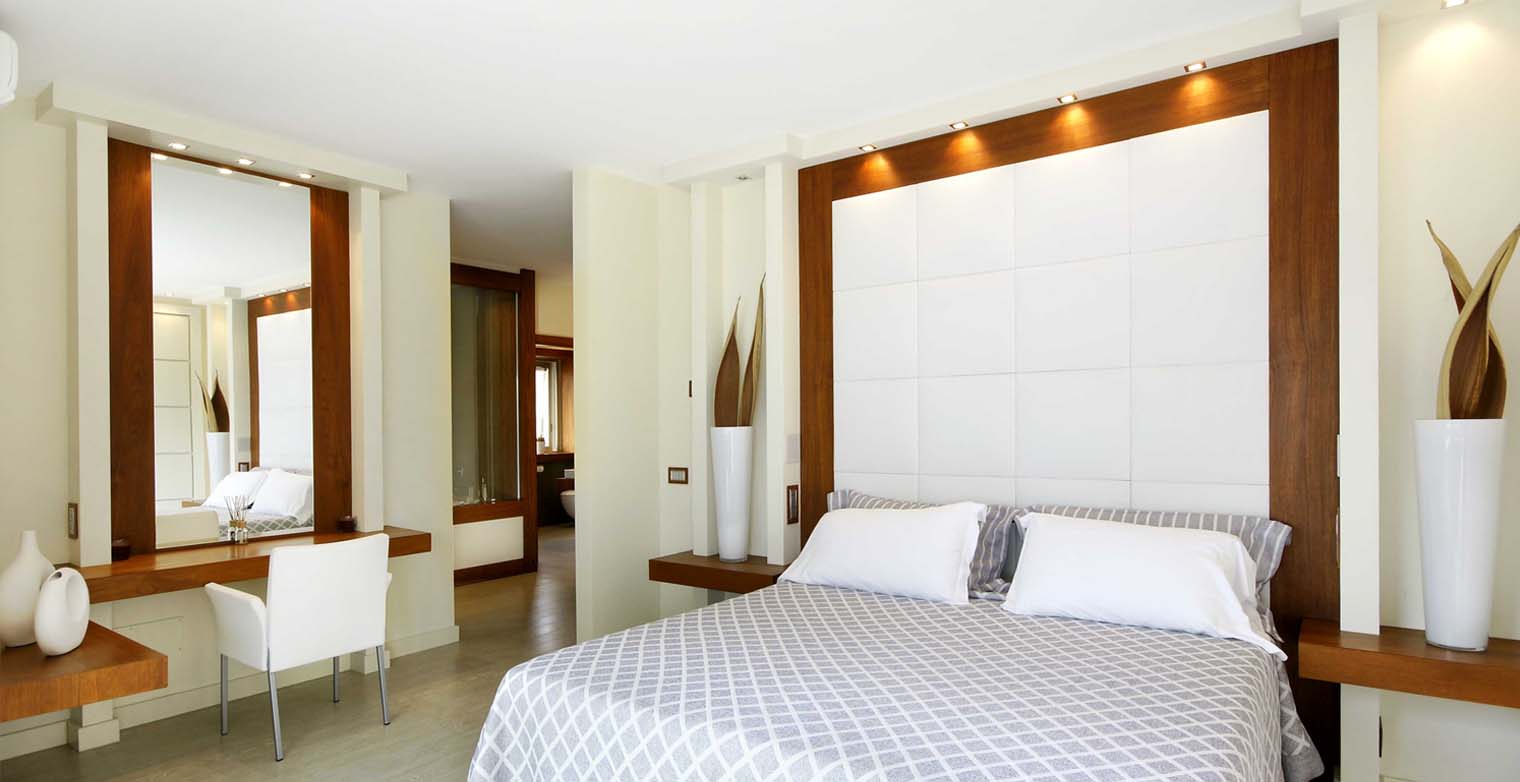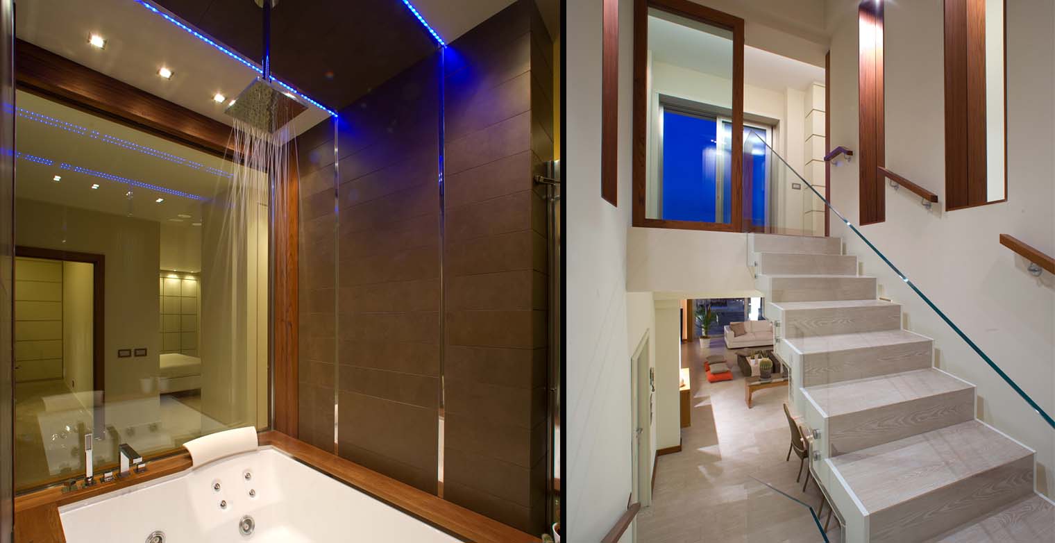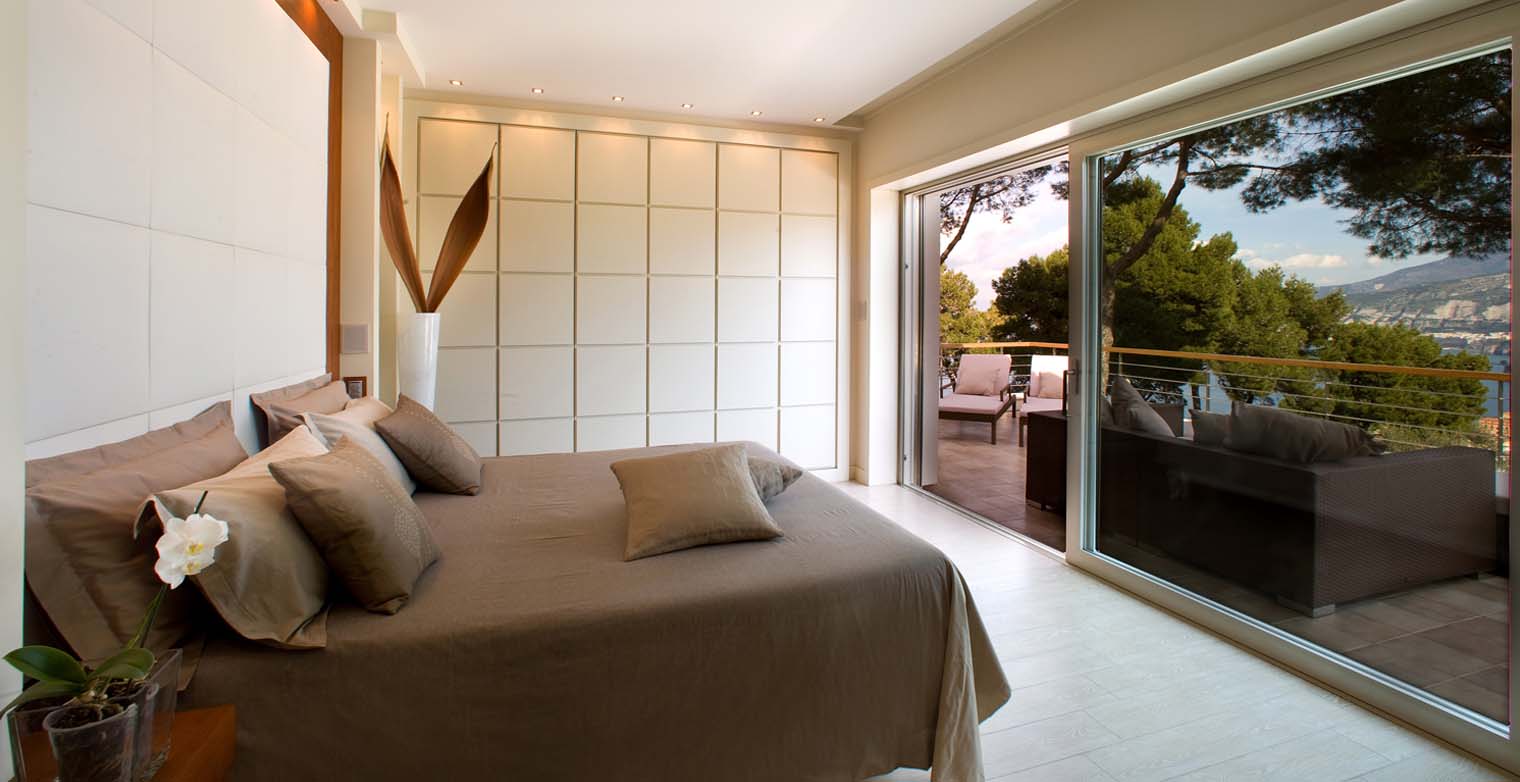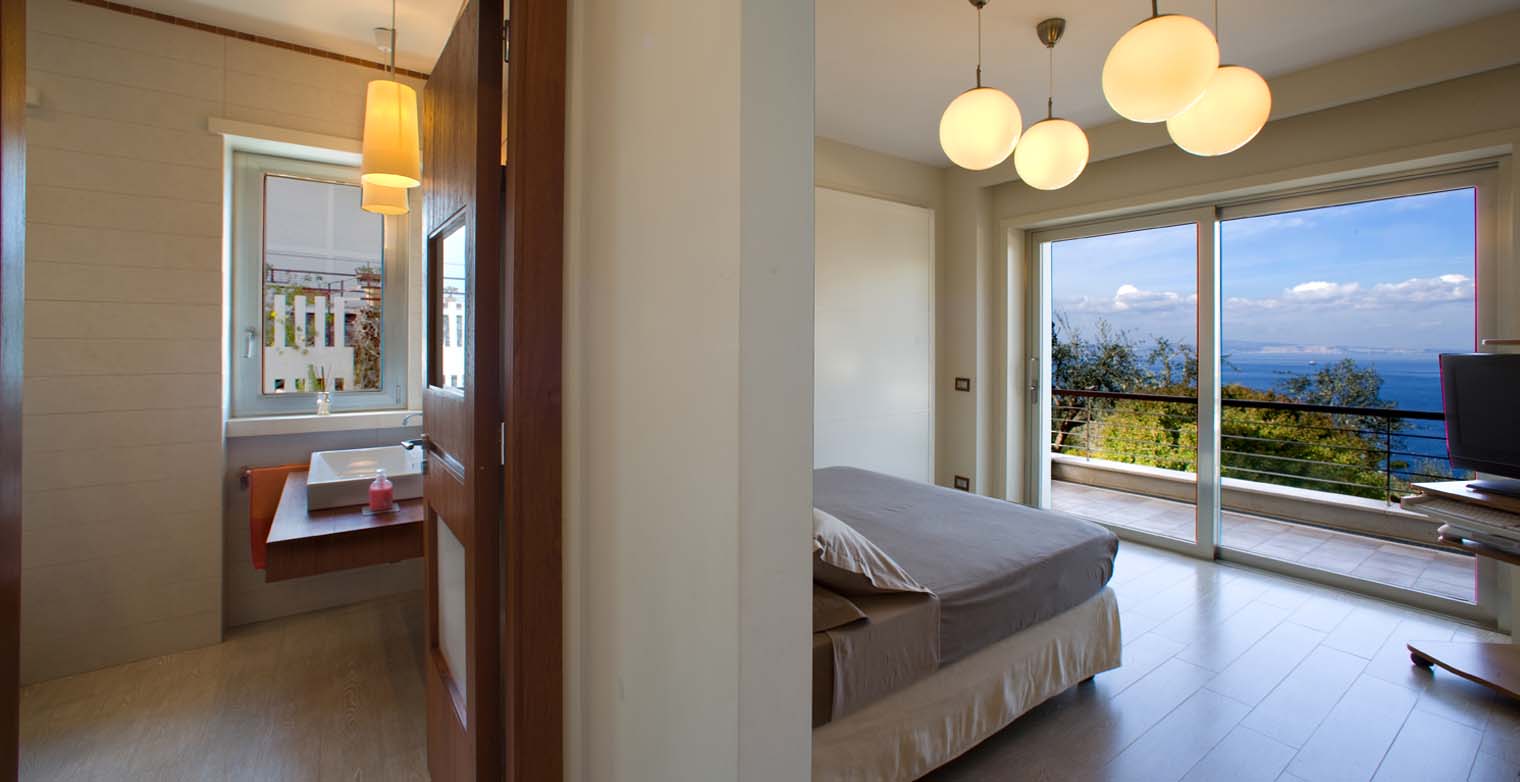 A master suite with a double bed with sliding door opens onto the terrace offering a panoramic view out over the town of Sorrento. The suite boasts a built-in closet. Two, private (him & her) bathrooms boast a Jacuzzi bath for two with chromatic lightning, accessible from both bathrooms.
