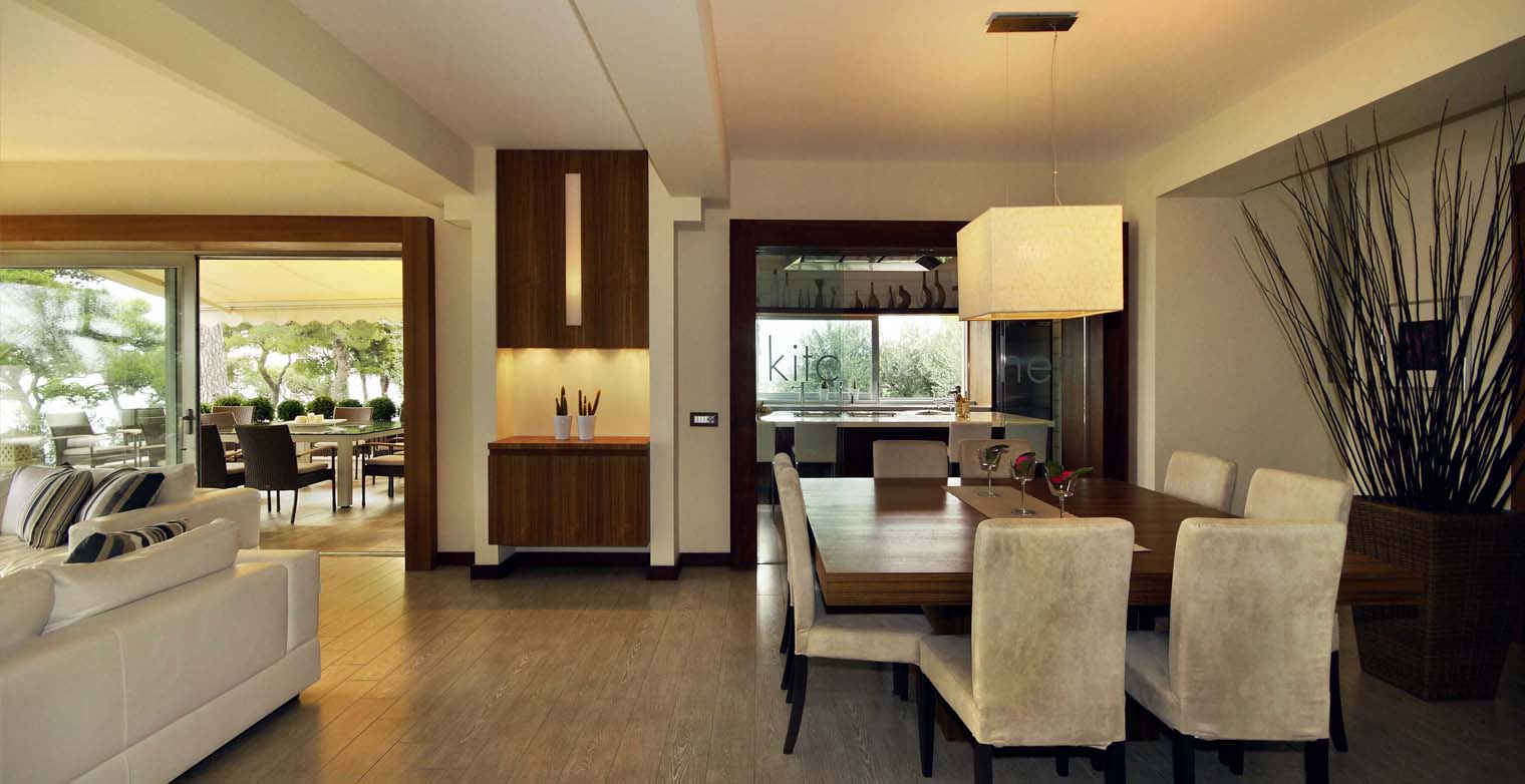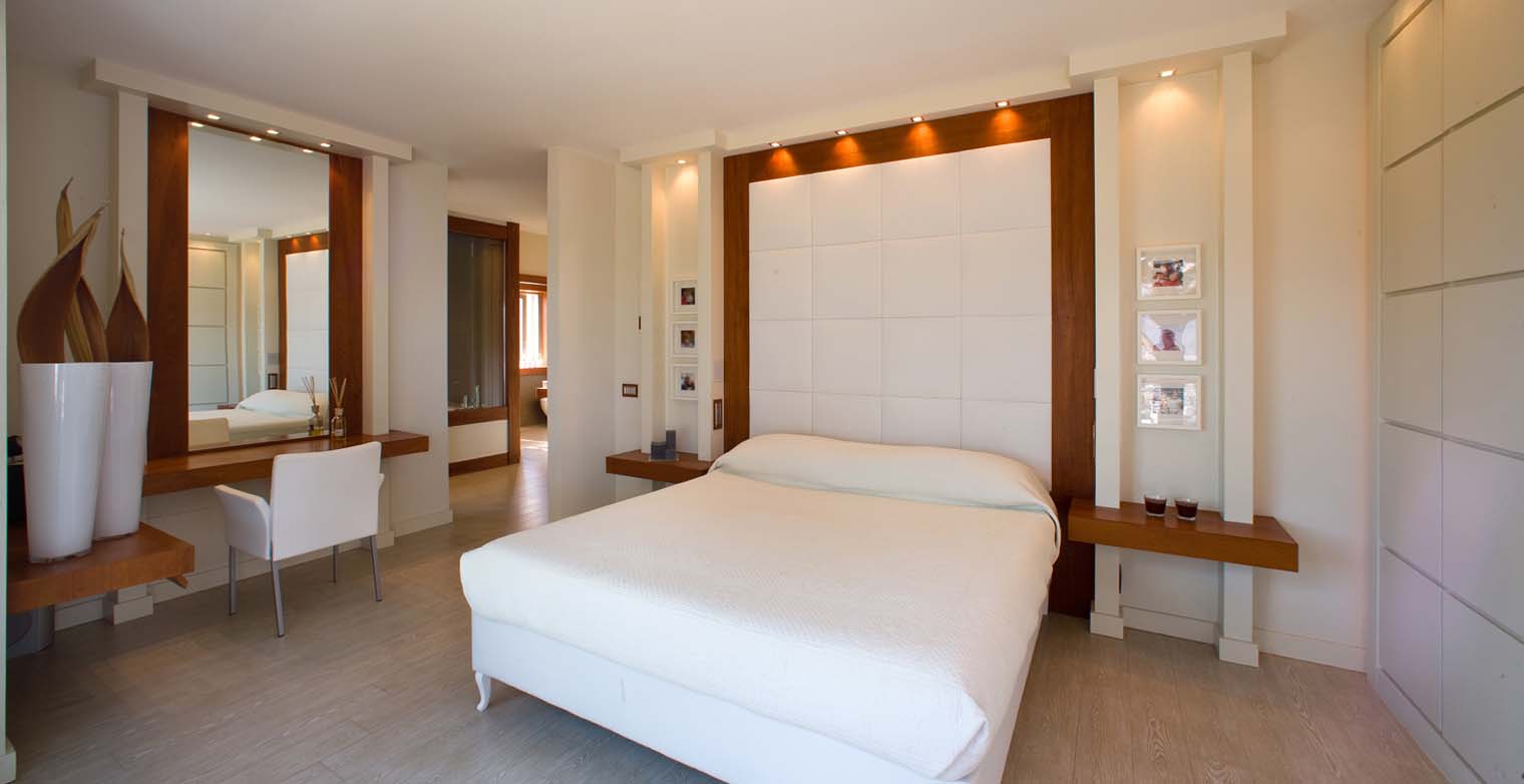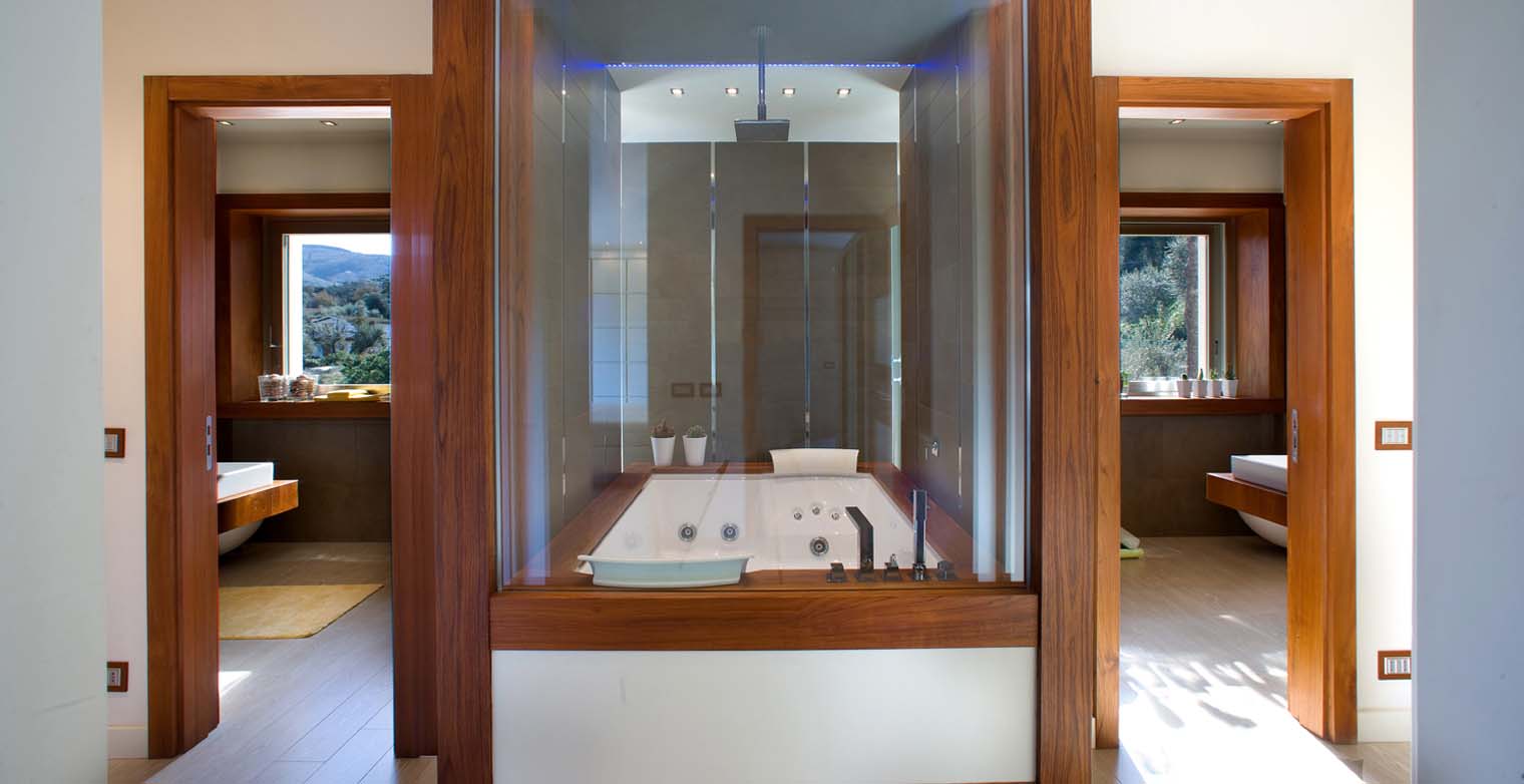 The entrance leads also into the living room from where a sliding glass door opens onto the terrace facing the picturesque olive trees. In this area we find the first three bedrooms with en-suite bathrooms, a gym area with pull-up bed (suitable for teenagers).