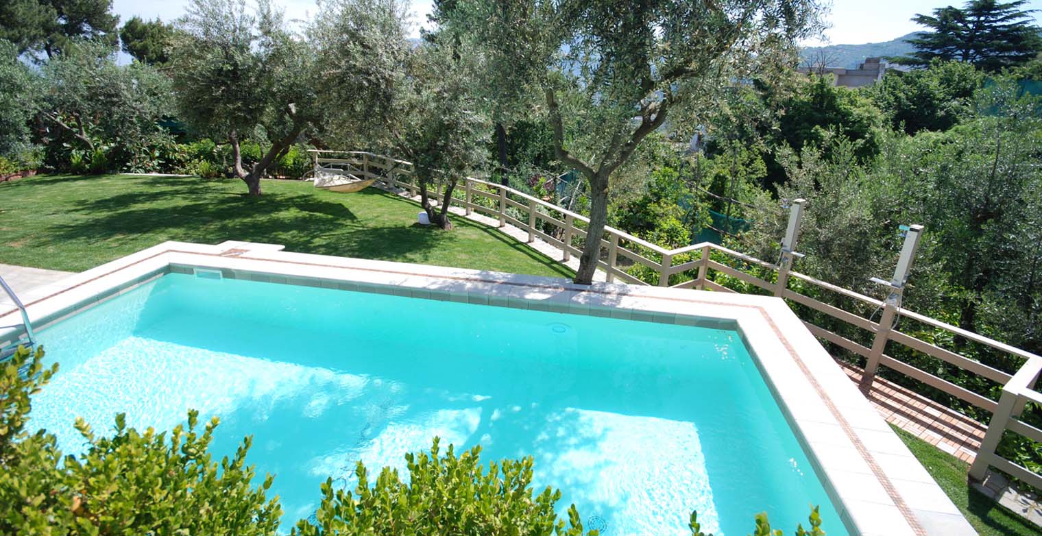The pool and the garden are reached up a flight of 5 steps leading to the swimming pool. There are sun lounge chairs set on the terrace around the pool and the patio has been created with a shaded area with a table and deck chairs. There are olive trees, one of the fundamental elements in the beautiful wild nature of the Sorrento Peninsula, and fruit trees growing through the garden out of the plain grass.