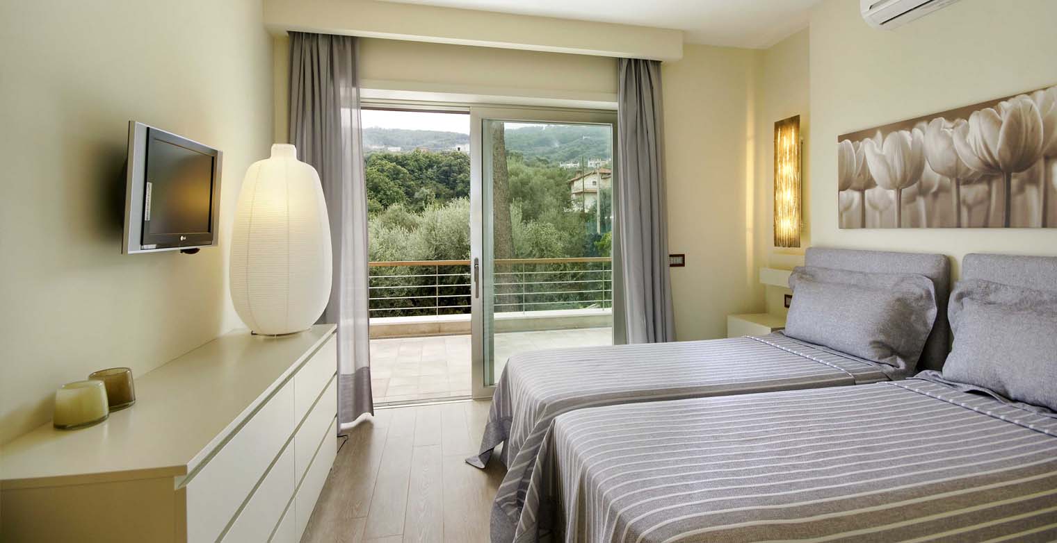 The second double bedroom enjoys a built-in closet with sliding doors opening onto a panoramic terrace. The bathroom boasts a shower. The third double bedroom (can be converted to twin beds) has a sliding door facing the olive grove garden. The en-suite bathroom enjoys a shower and bath tub.
