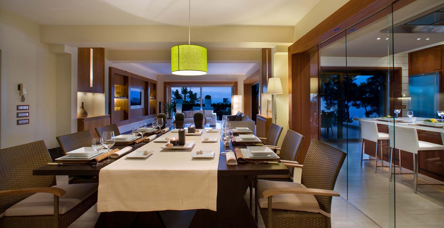 The dining room boasts a large wooden table and chairs with access to the trendy and stylish kitchen. The kitchen space is extremely functional; gourmands and food lovers will love to get their hands dirty here. The space enjoys a steamer, a professional induction wok, two full size refrigerators with freezers, an oven, dishwasher, induction cooker, grill, and espresso coffee machine. The tall, elegant leather bar chairs allow a chat with friends while preparing your meal or enjoying a drink.