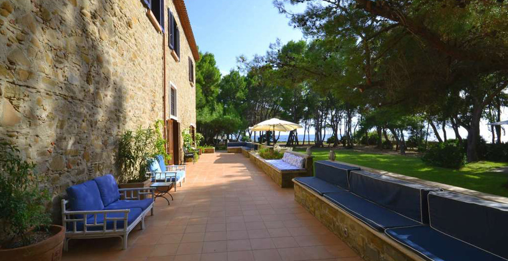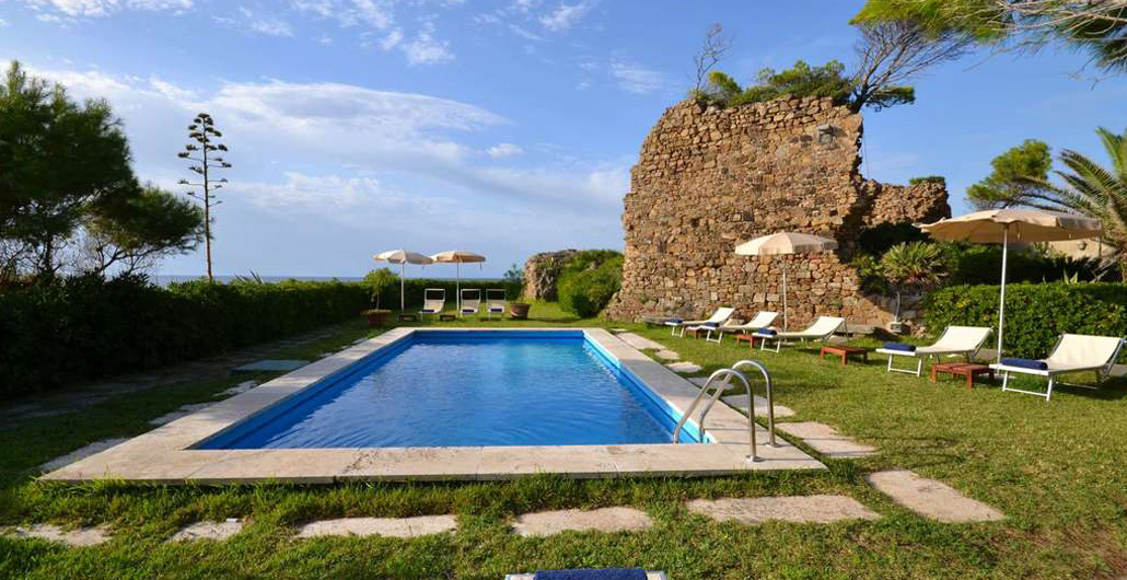 Sleeps up to 14, in 7 bedrooms: 4 bedrooms on the ground floor en-suite, and 3 double rooms upstairs having 2 separate bathrooms. 2 large sitting rooms – 1 downstairs with fireplace and one upstairs with great views over the sea, Built-in air conditioning in all bedrooms downstairs with ceiling fans upstairs, Large kitchen, 5,000 sq feet terracing around the house, 36 square metre covered gazebo with comfortable sofas for relaxing in the shade and for evening cocktails, Satellite TV, DVD, iPod dock, free Wi-Fi access, Sheltered fresh water pool, surrounded by Imperial Roman wall ruins.