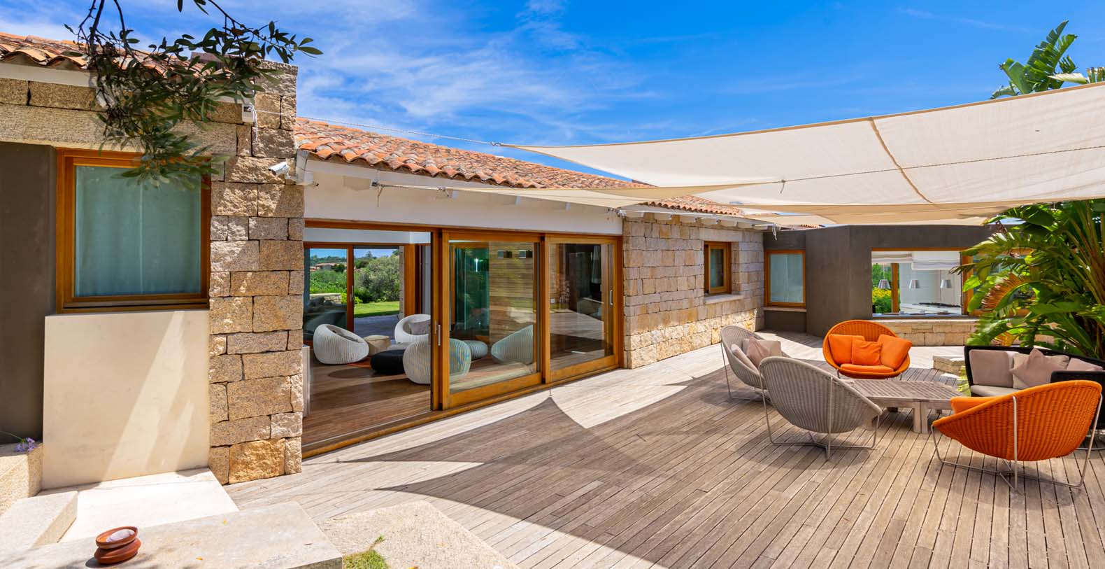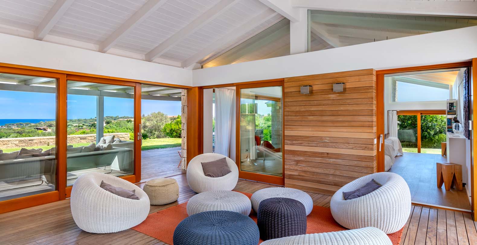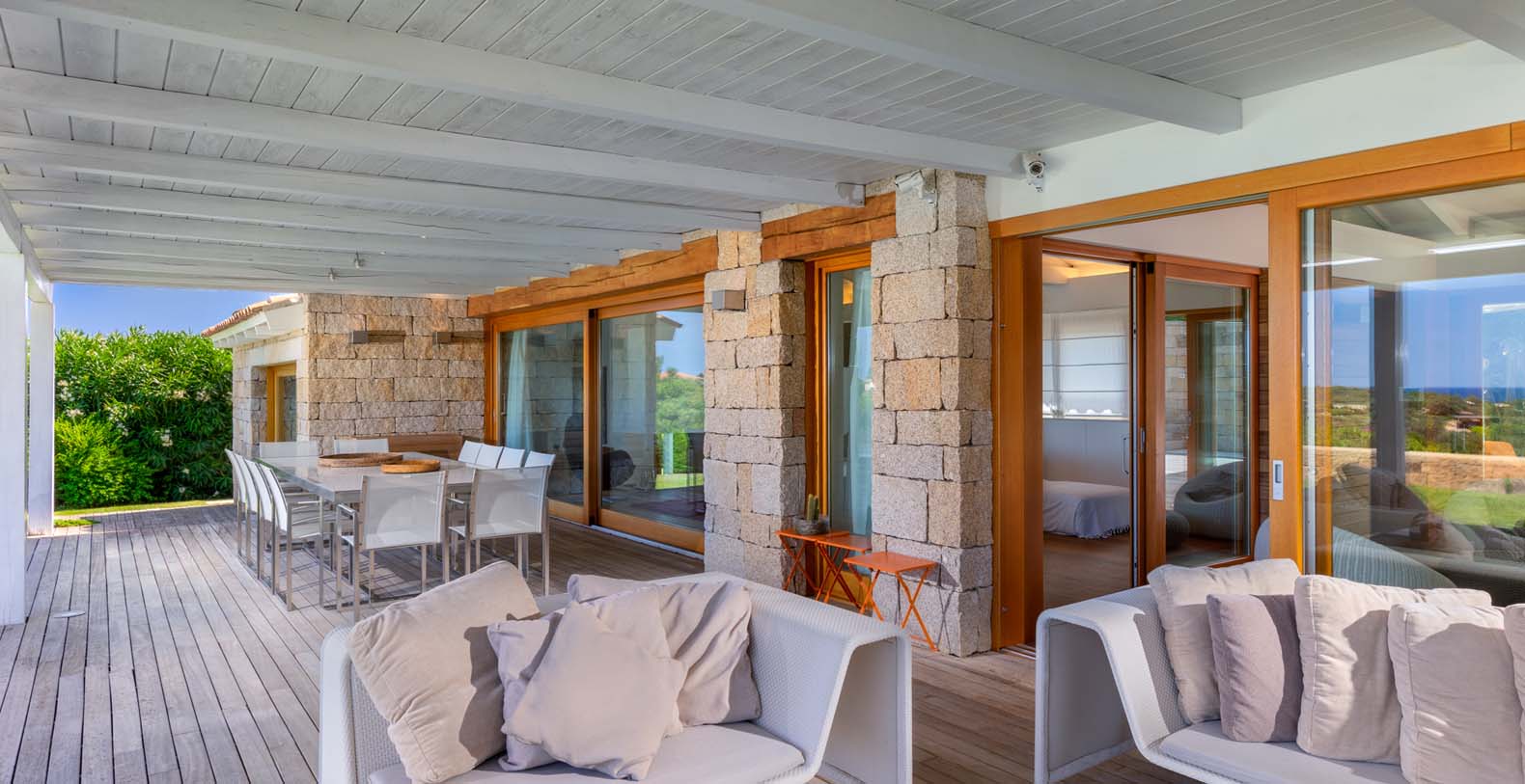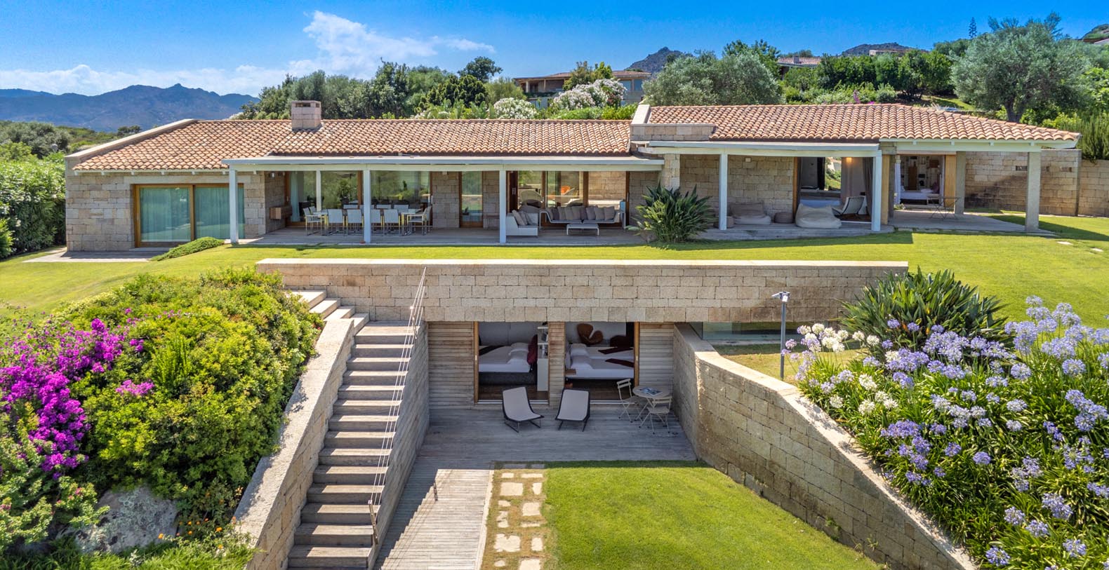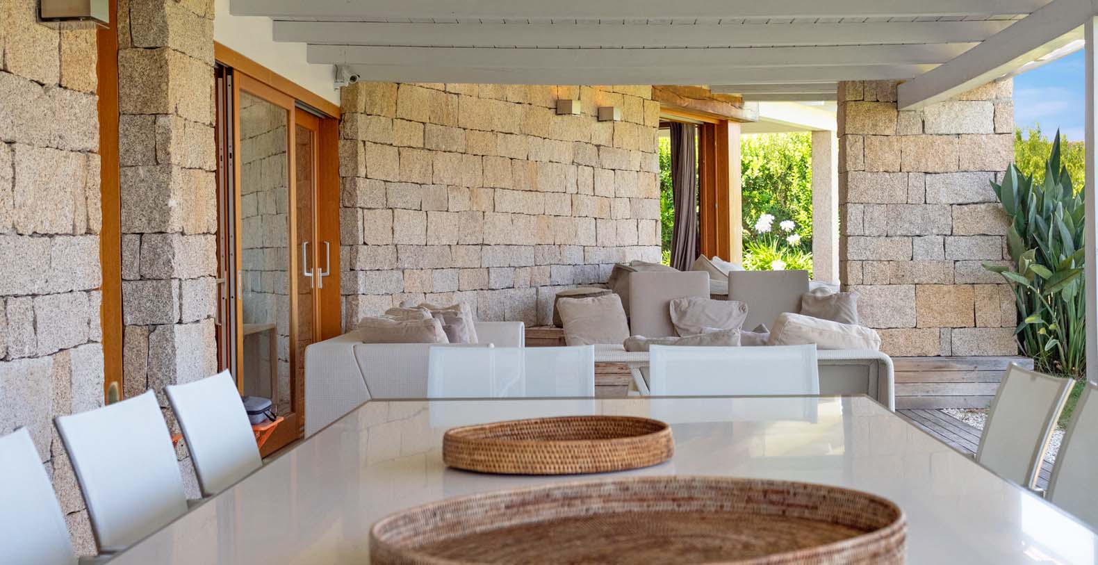Mediterranean style property, is in complete harmony with the surrounding environment, enlivened by the colors and the typical beauties of Sardinia. The entrance area welcomes you in a bright porch enclosed by large retractable glasses and furnished with sofas that overlook the sea.