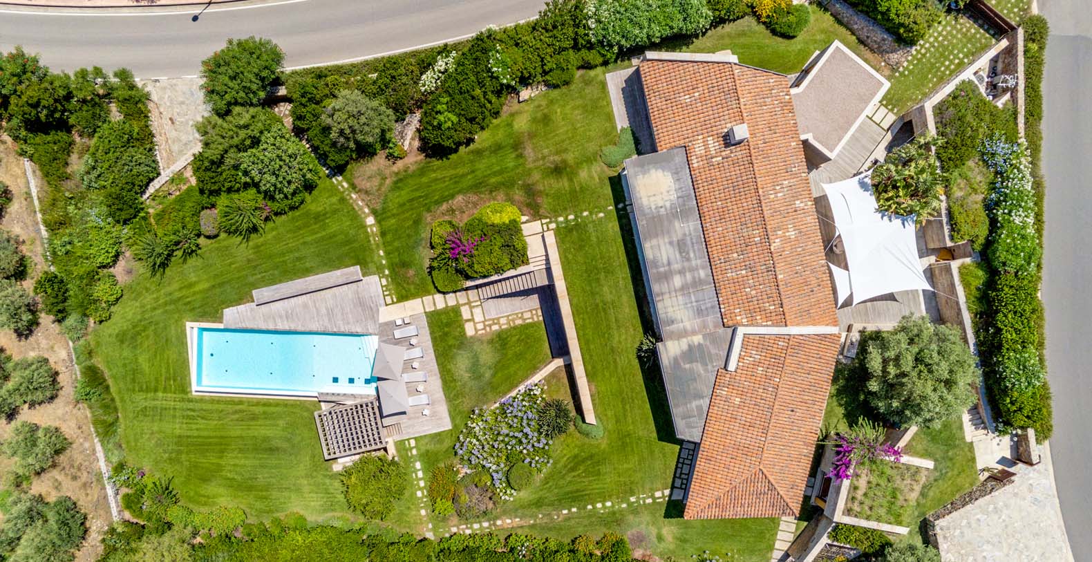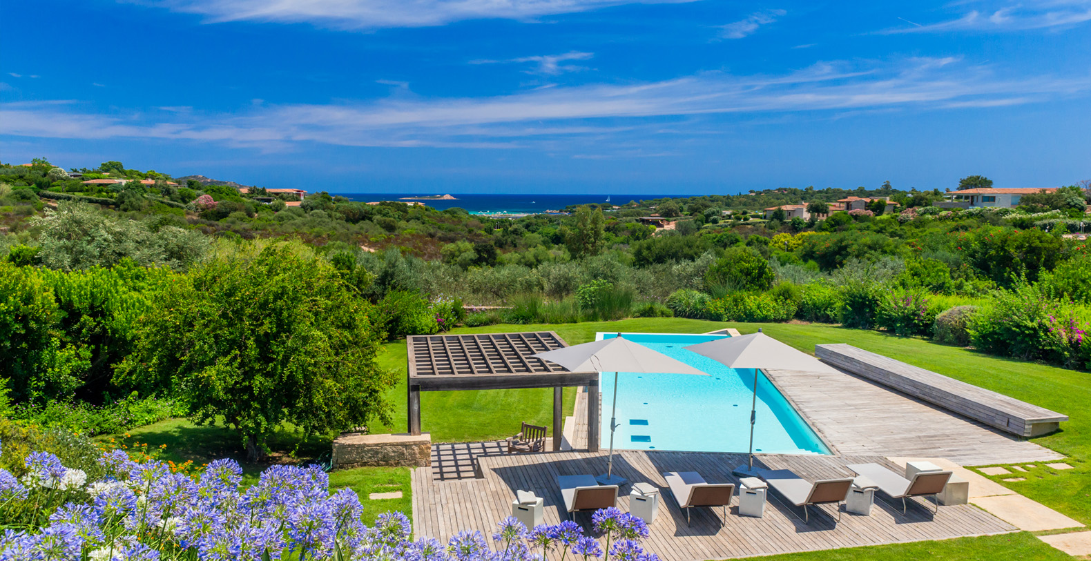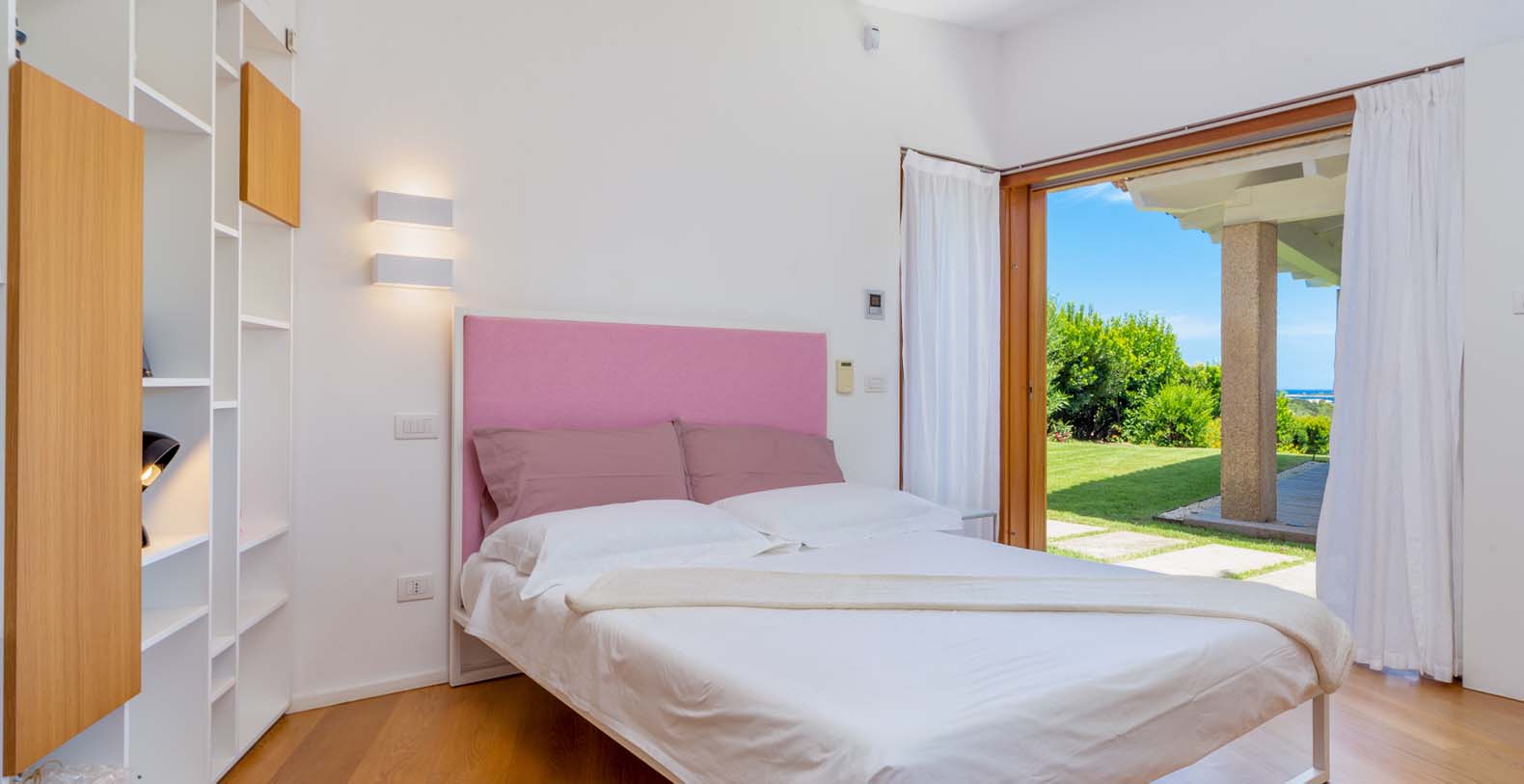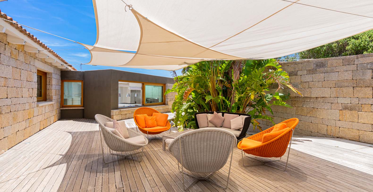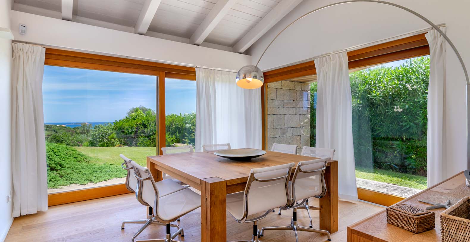 Mediterranean style property, is in complete harmony with the surrounding environment, enlivened by the colors and the typical beauties of Sardinia. The entrance area welcomes you in a bright porch enclosed by large retractable glasses and furnished with sofas that overlook the sea.