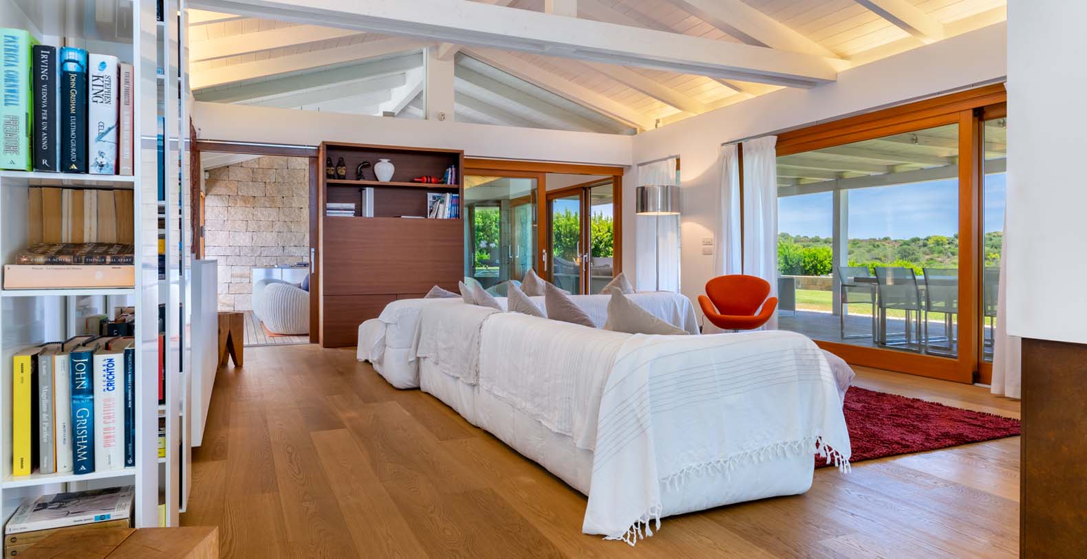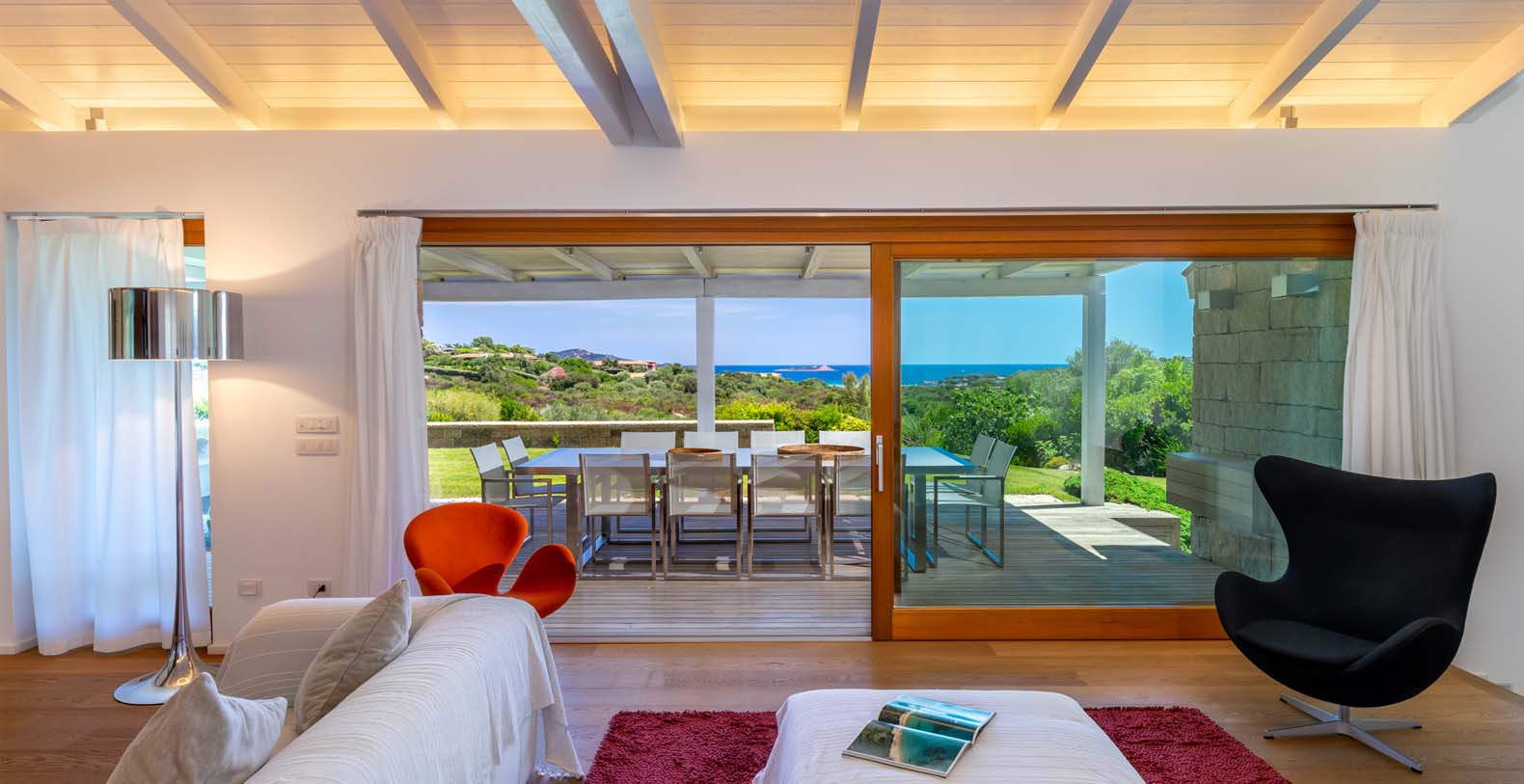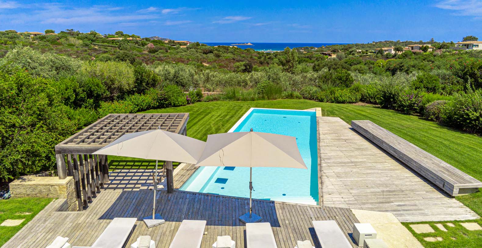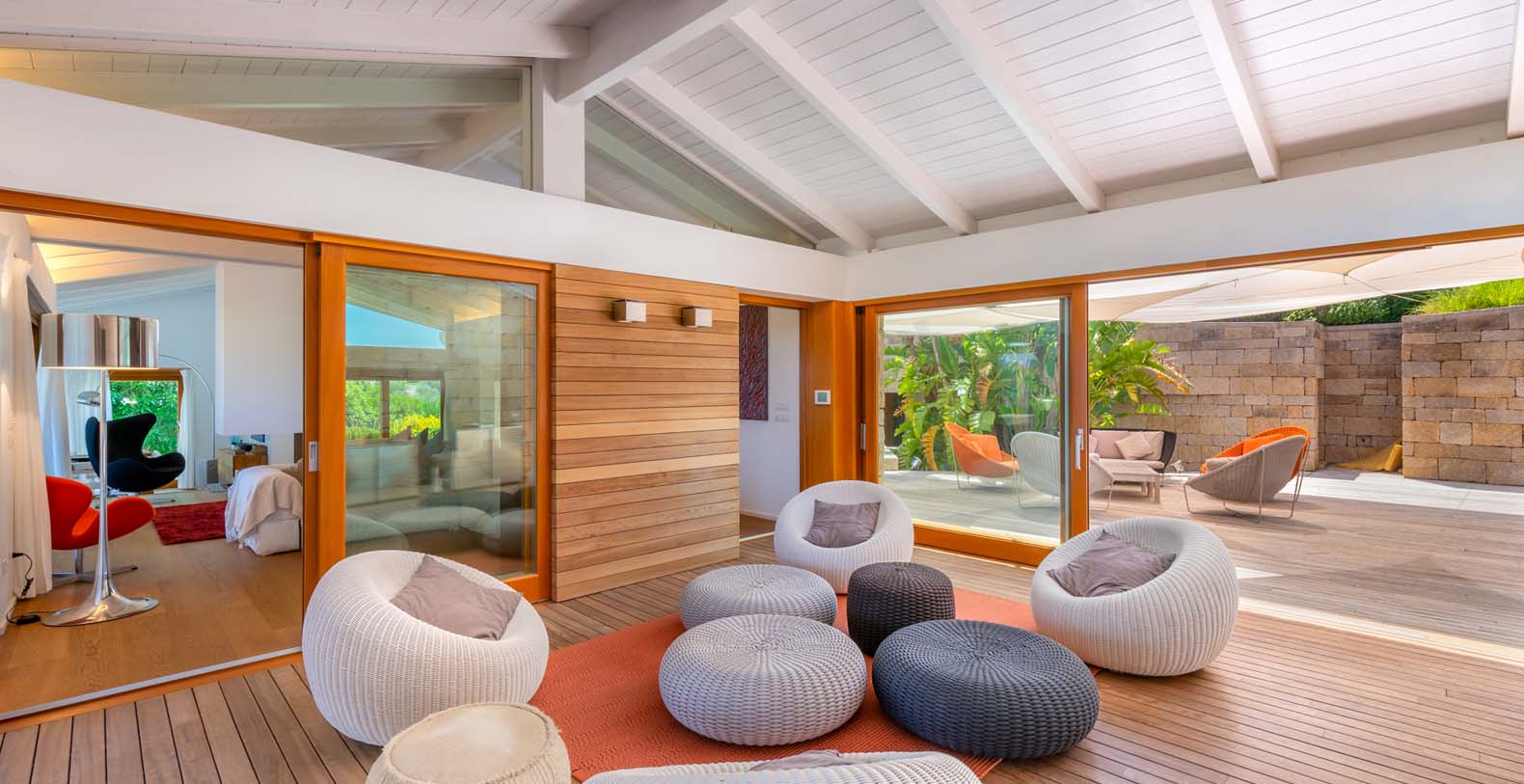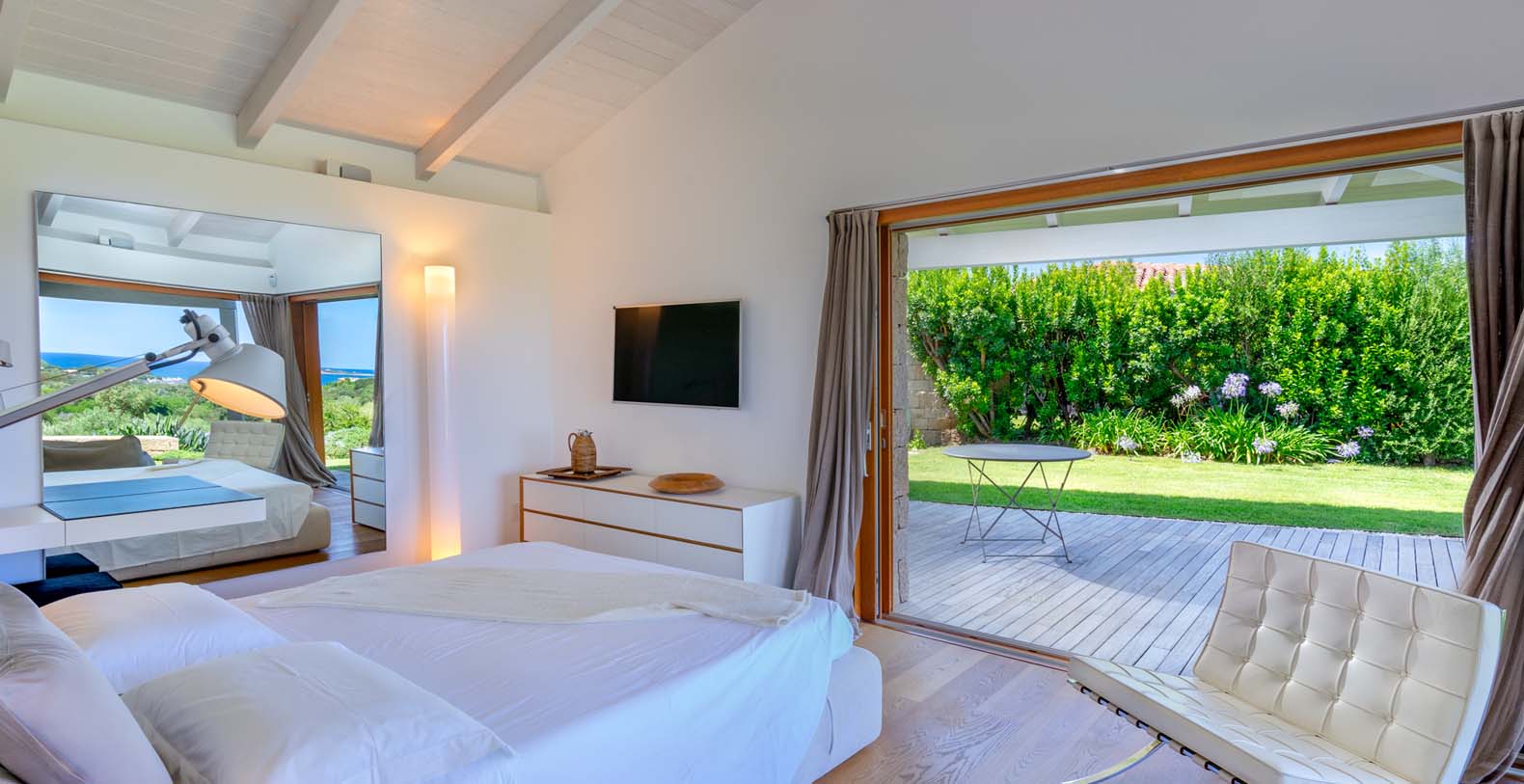 The atmosphere you will live during your stay will be very relaxing thanks to natural-colored furniture, white vaulted ceiling with beams and a variety of dark wood floors (parquet flooring), wooden furniture and white wicker. The sliding walls and windows which look out on the wooden terraces will make you feel part of the serene atmosphere of the surrounding landscape. In addition to the long pool, in the garden there is a terrace, a large solarium and a covered indoor GYM.