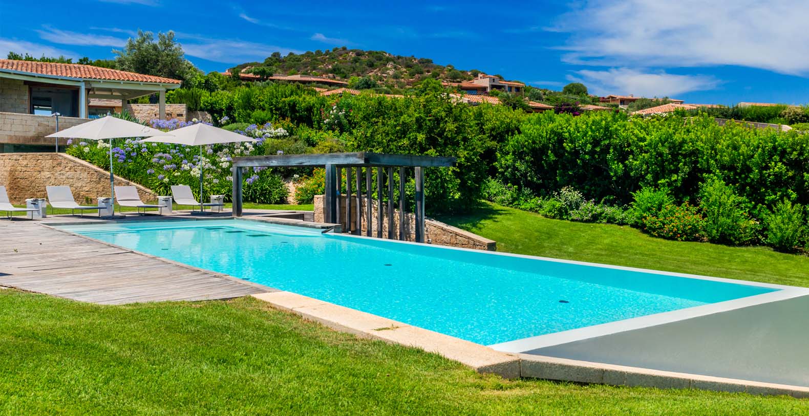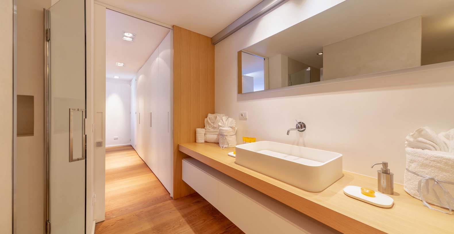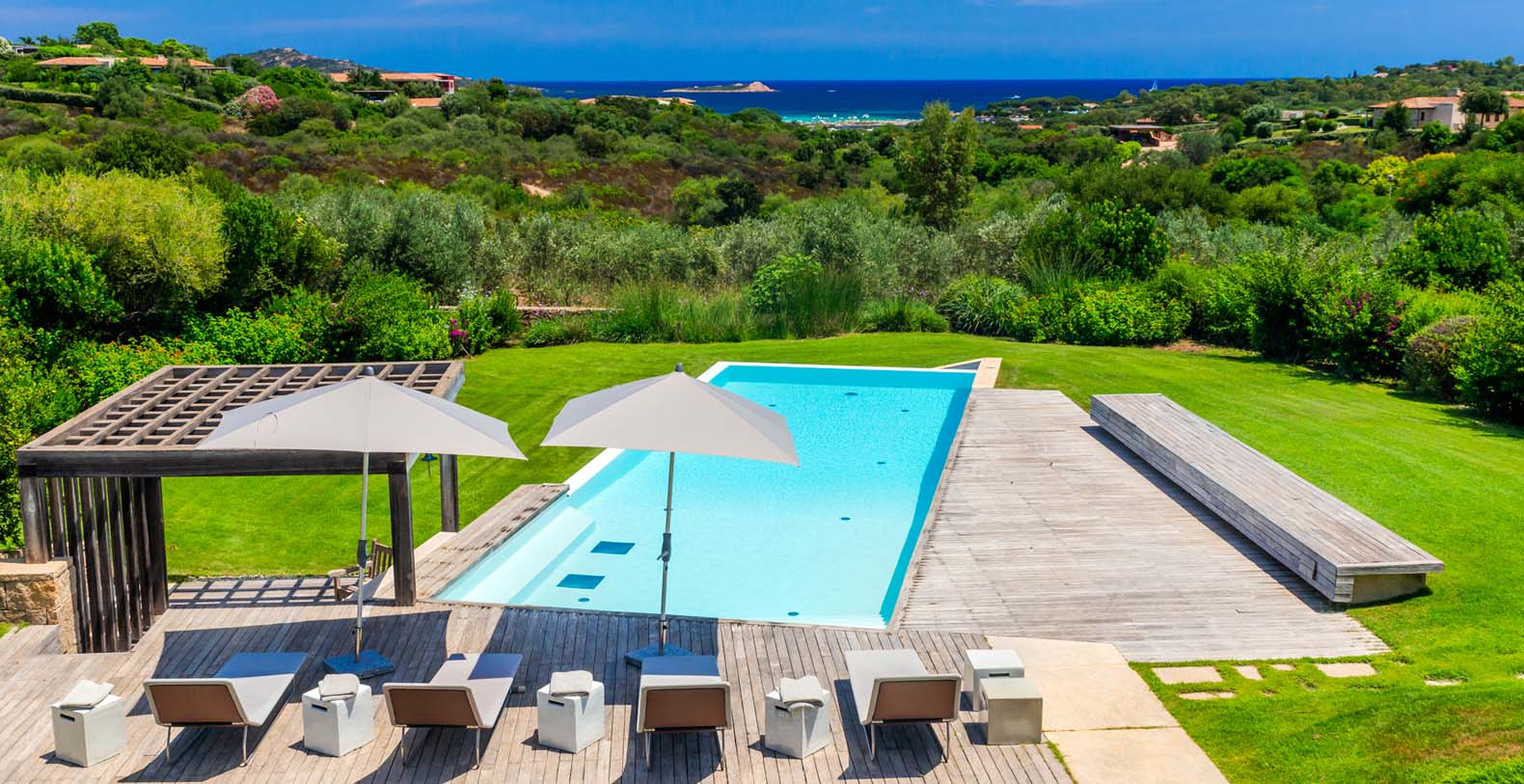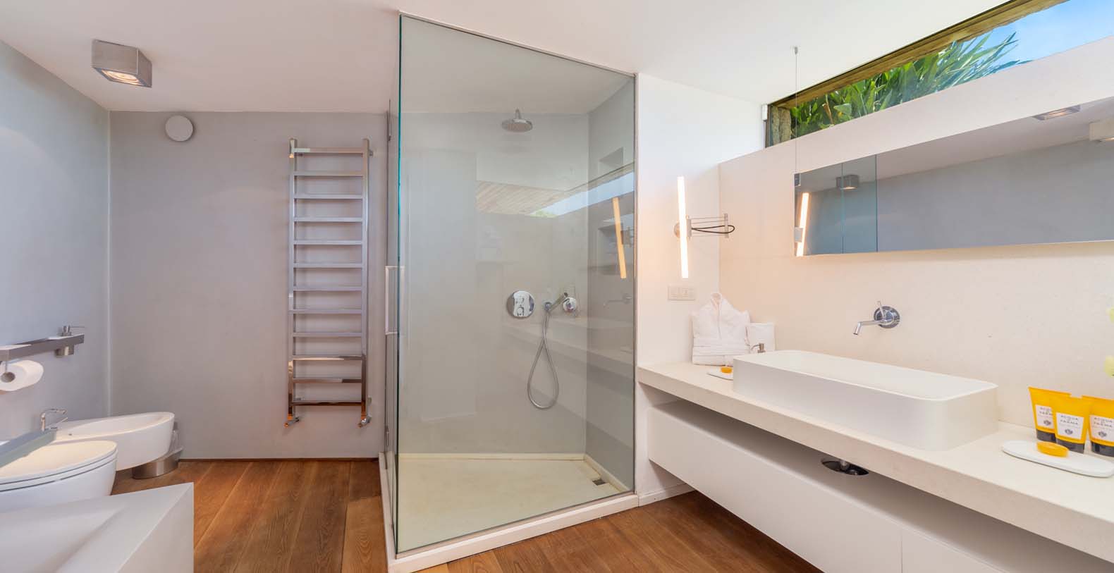 The atmosphere you will live during your stay will be very relaxing thanks to natural-colored furniture, white vaulted ceiling with beams and a variety of dark wood floors (parquet flooring), wooden furniture and white wicker. The sliding walls and windows which look out on the wooden terraces will make you feel part of the serene atmosphere of the surrounding landscape. In addition to the long pool, in the garden there is a terrace, a large solarium and a covered indoor GYM.