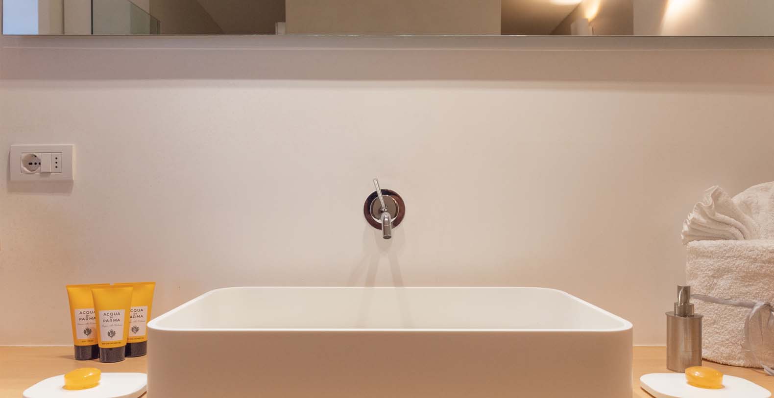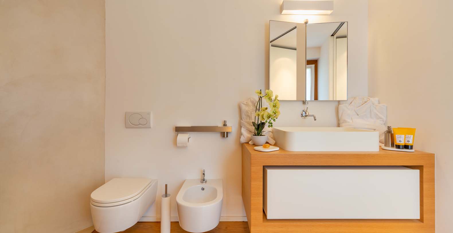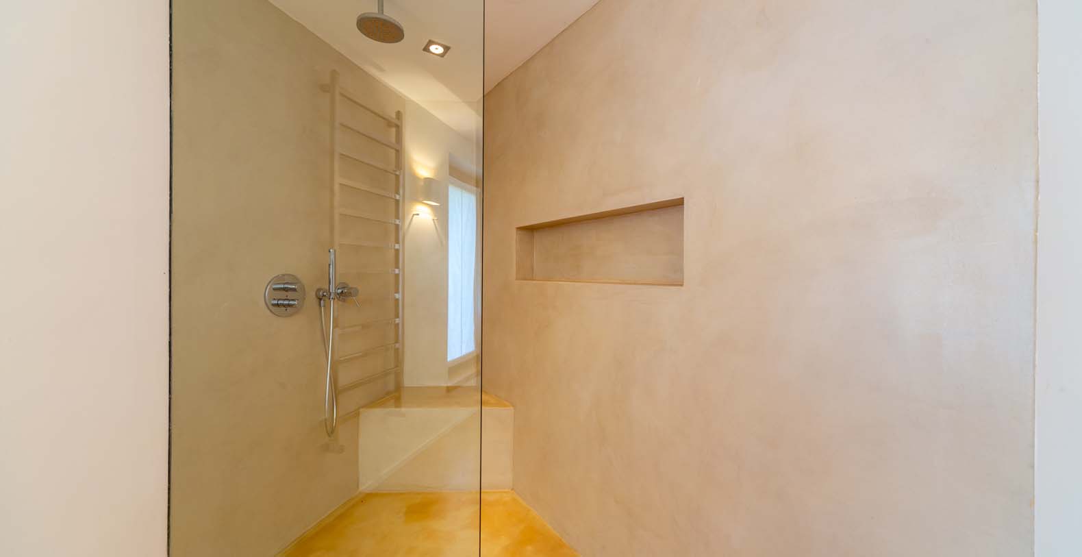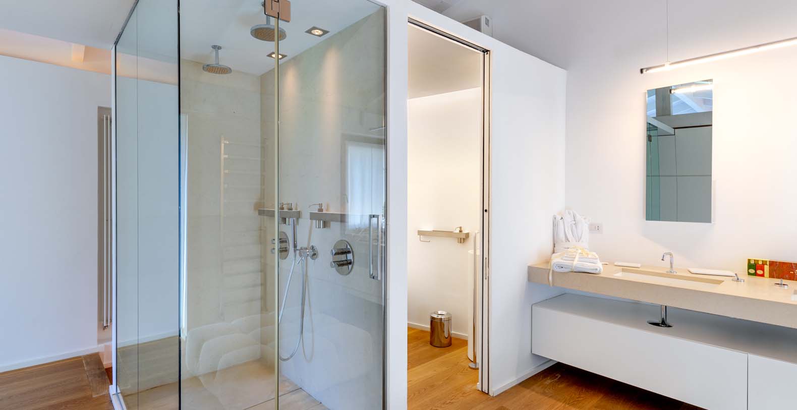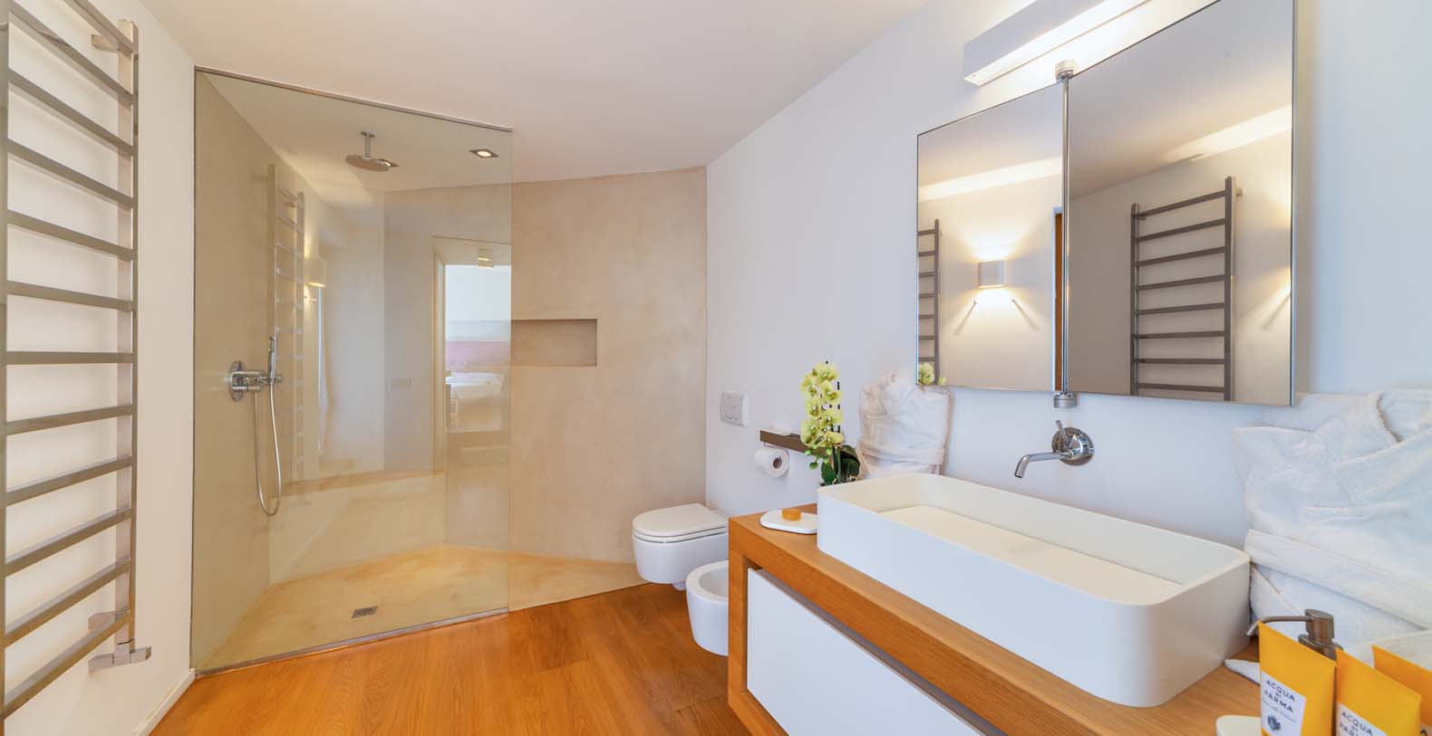 The atmosphere you will live during your stay will be very relaxing thanks to natural-colored furniture, white vaulted ceiling with beams and a variety of dark wood floors (parquet flooring), wooden furniture and white wicker. The sliding walls and windows which look out on the wooden terraces will make you feel part of the serene atmosphere of the surrounding landscape. In addition to the long pool, in the garden there is a terrace, a large solarium and a covered indoor GYM.