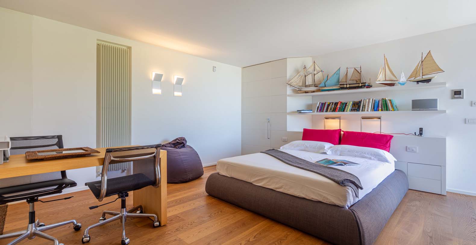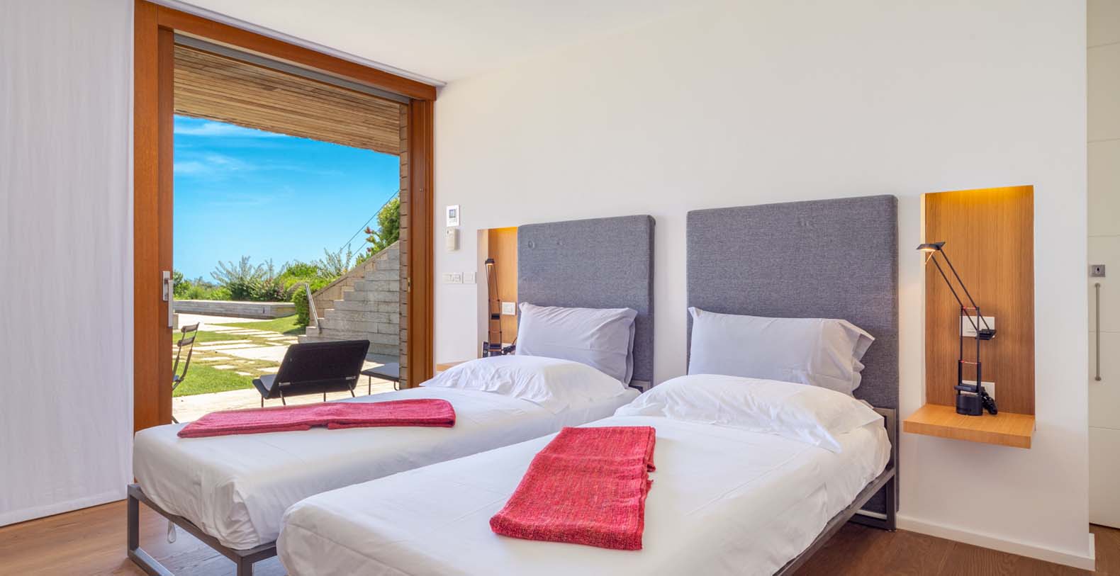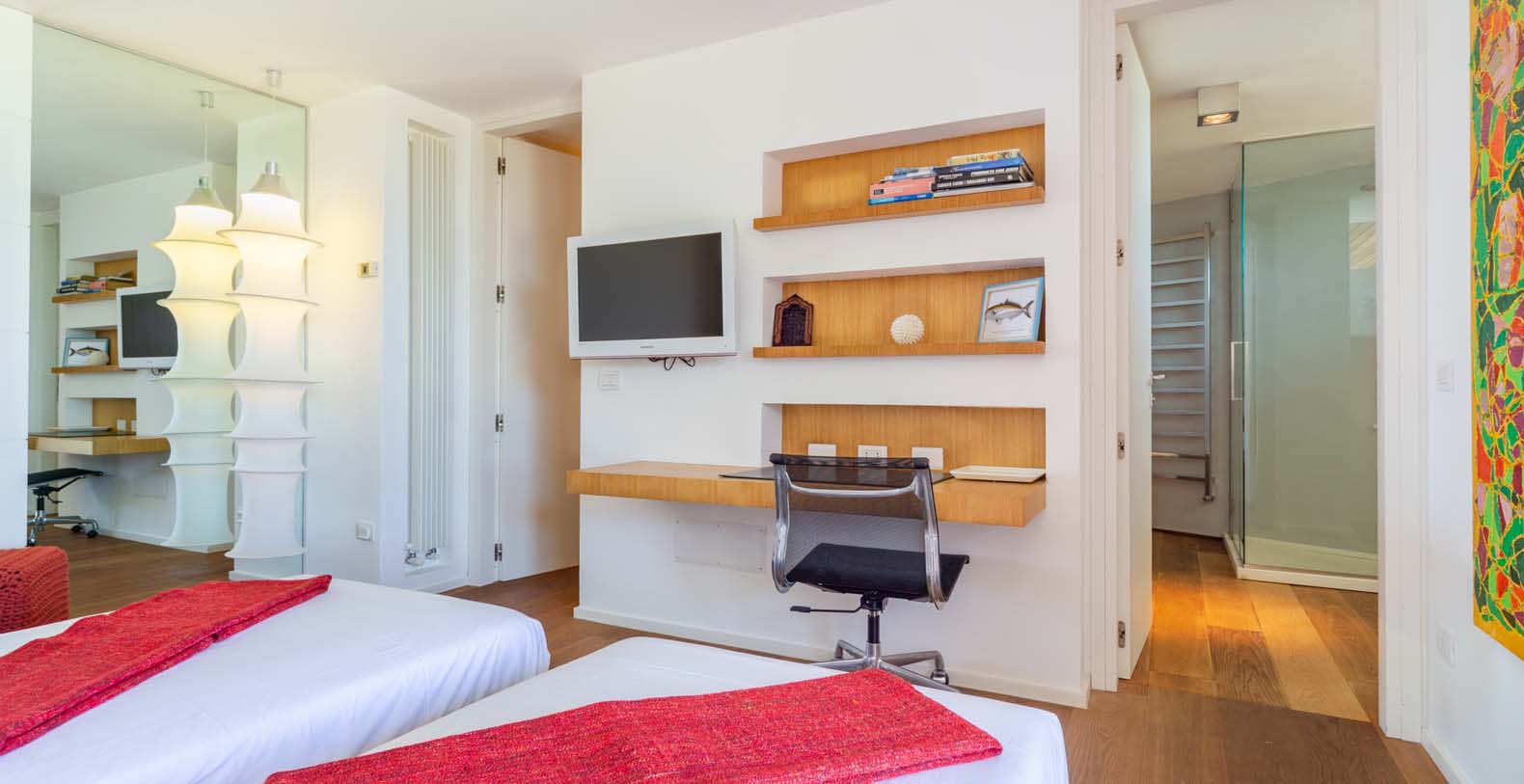 It can accommodate up to 8 persons in 4 modern wide bedrooms, one with a double bed. You can enjoy the company or the privacy. On request a 5th bedroom with en-suite bathroom is available for staff or nannies with children.