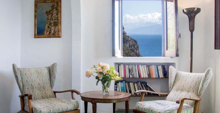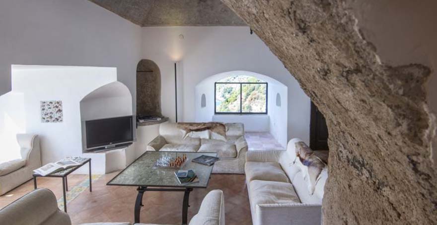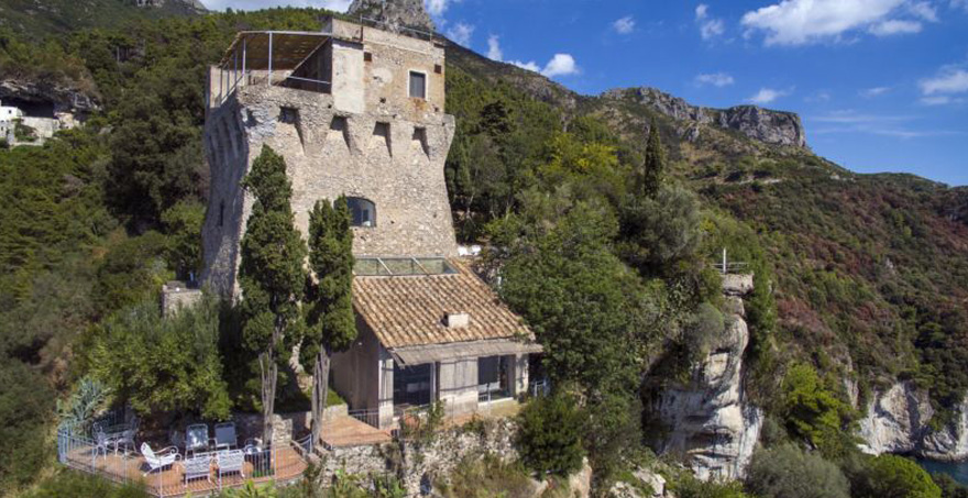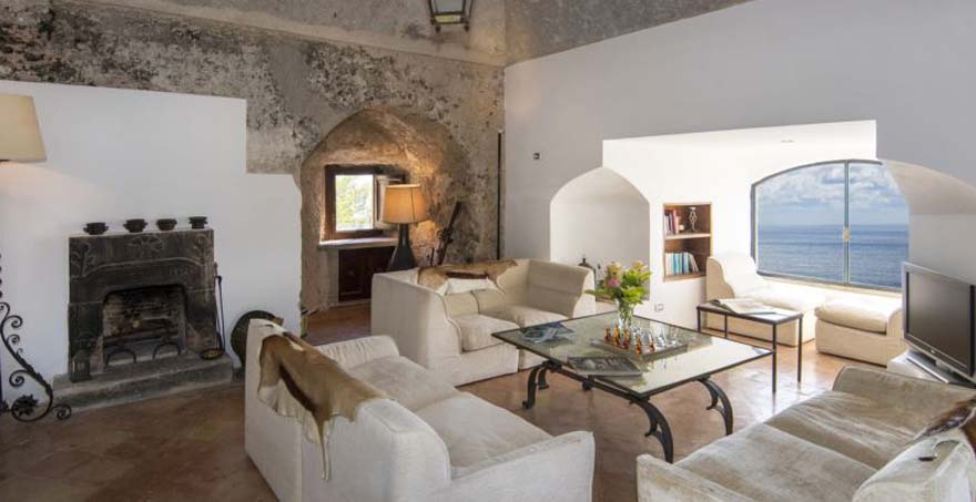 This recently renovated holiday villa is elegantly furnished with antiques and modern design classics accentuating the beauty of this unique building. Plate-glass windows and series of panoramic terraces offer spectacular views across the sea and of the unspoiled Amalfi Coast. These terraces provide a perfect setting for relaxing and eating outside. The luxury rental property also boasts an exclusive double-level swimming pool, ingeniously linked by communicating steps. A winding path leads down below the tower to a private cove for swimming in the sea.