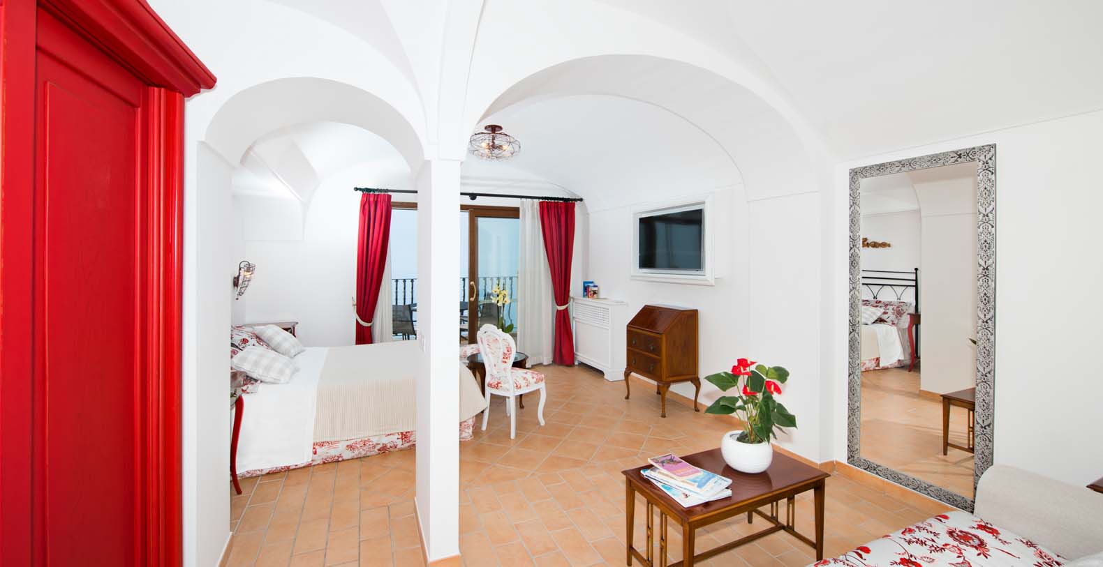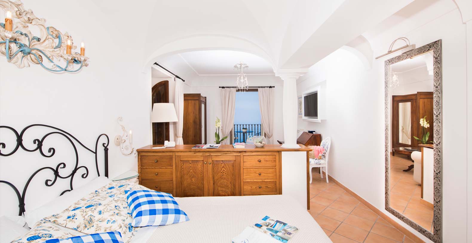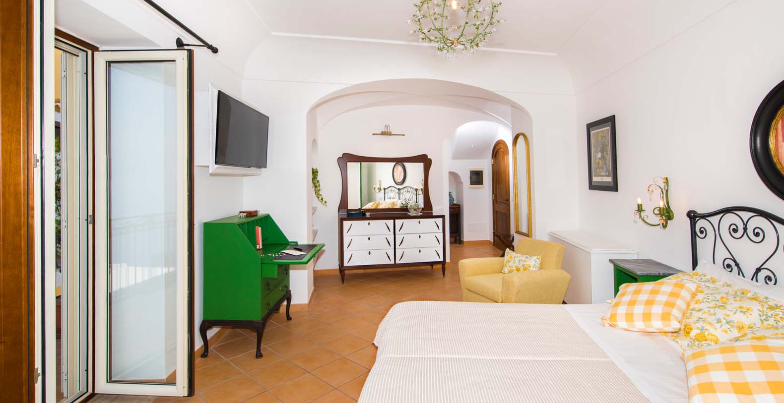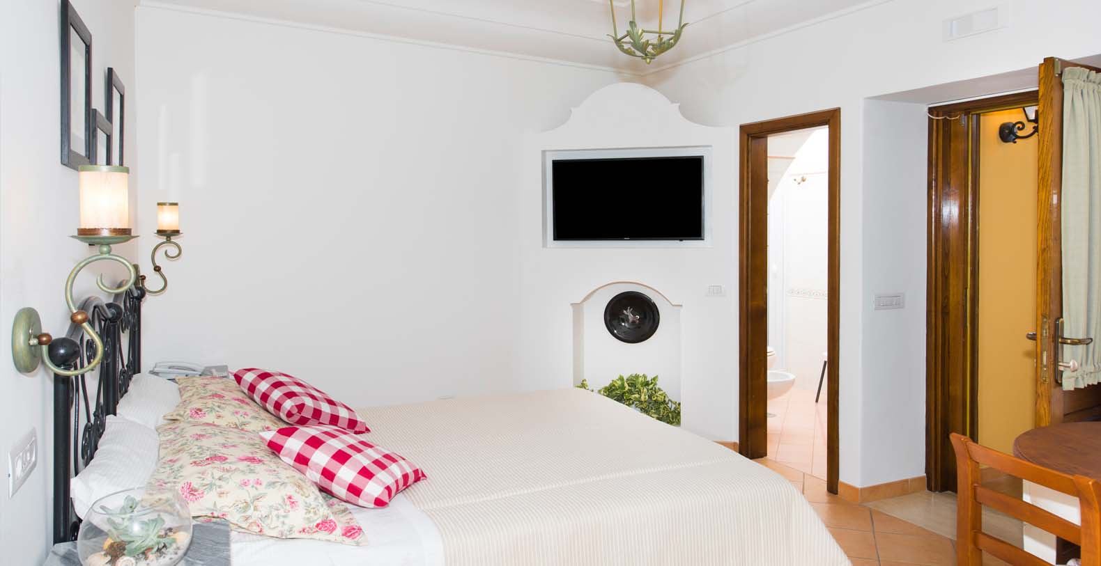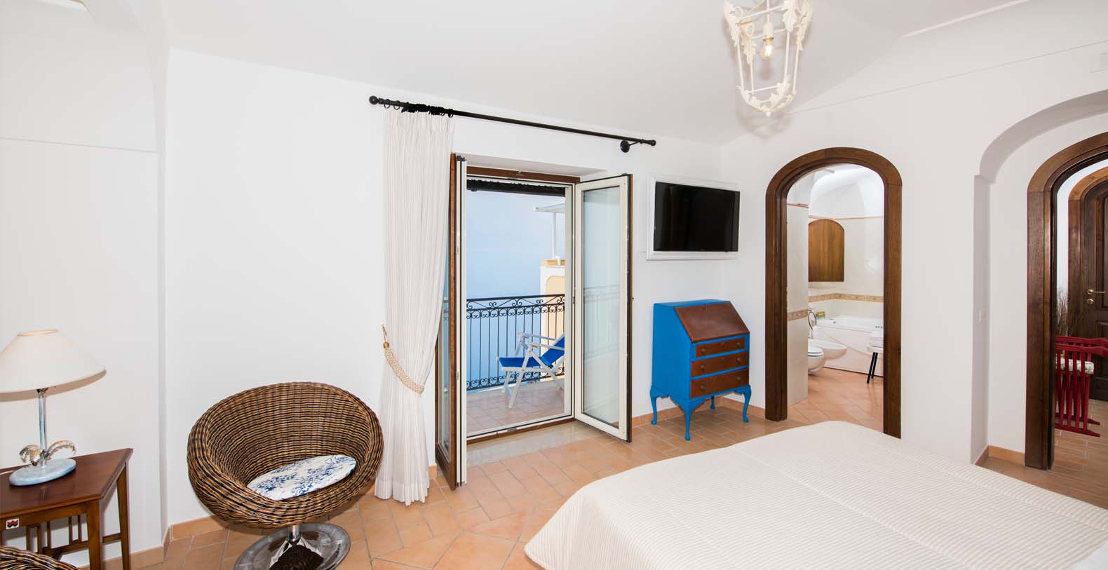 In every room there is a flat satellite smart tv, air conditioned, Jacuzzi tub and free WI-FI. One of the bedrooms has a sofa bed for 1 person and 2 panoramic balconies. The other bedroom has a large panoramic terrace and the possibility to add 2 small bed.