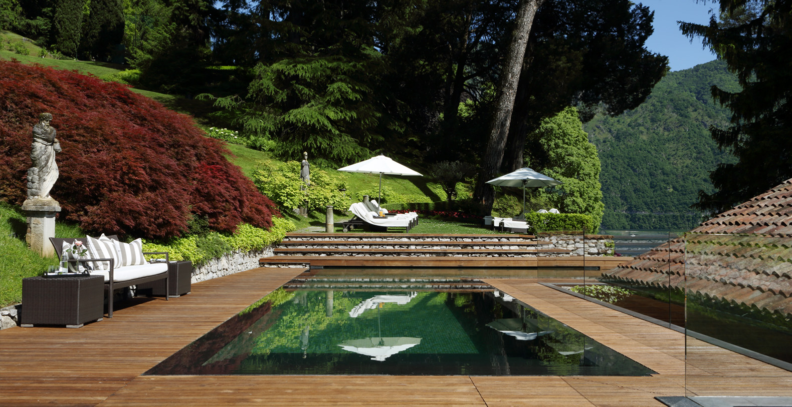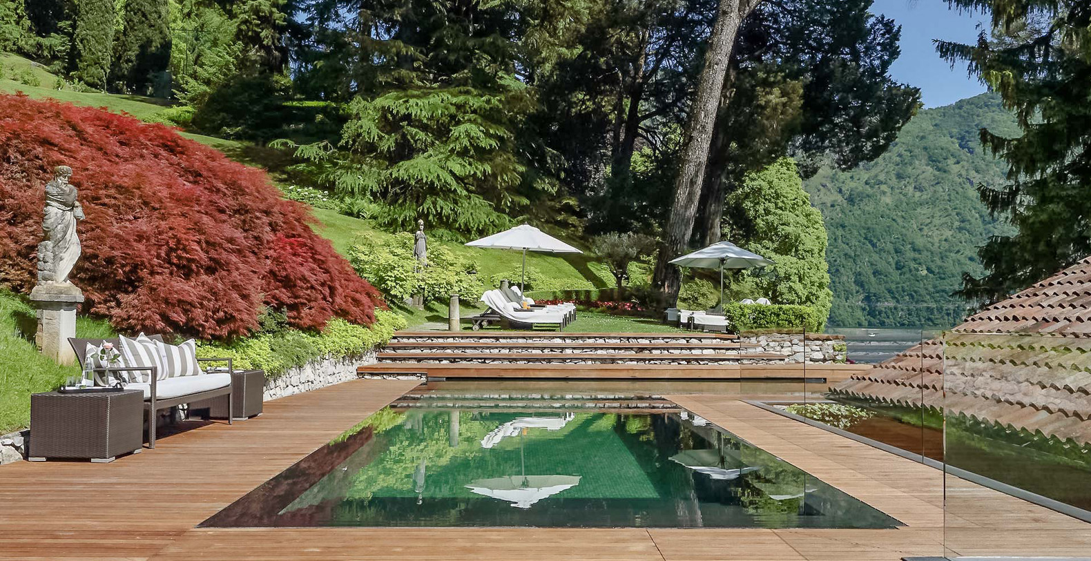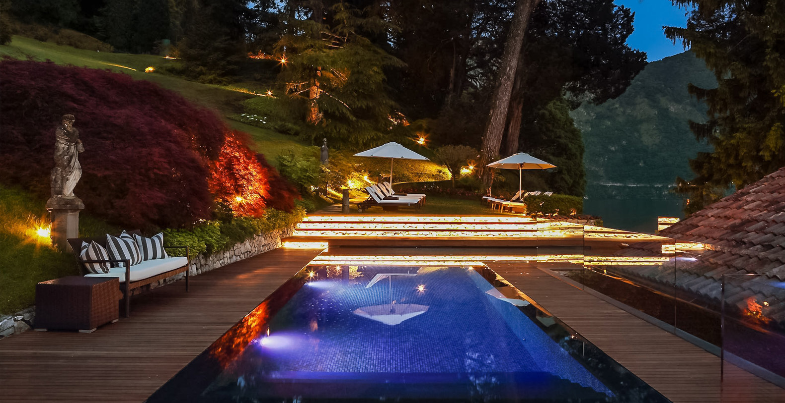 Adjacent to the fully heated infinity edge swimming pool, finished with 22-carat gold reflective tiles lies the state of the art cinema and a spa style bathroom which services the fully equipped Techno gym gymnasium. The floodlit tennis court is located a short walk away through the Villa’s perfectly kept gardens. The Terrace House with panoramic lake views, private terraces and dining area is quietly situated beyond the tennis court.