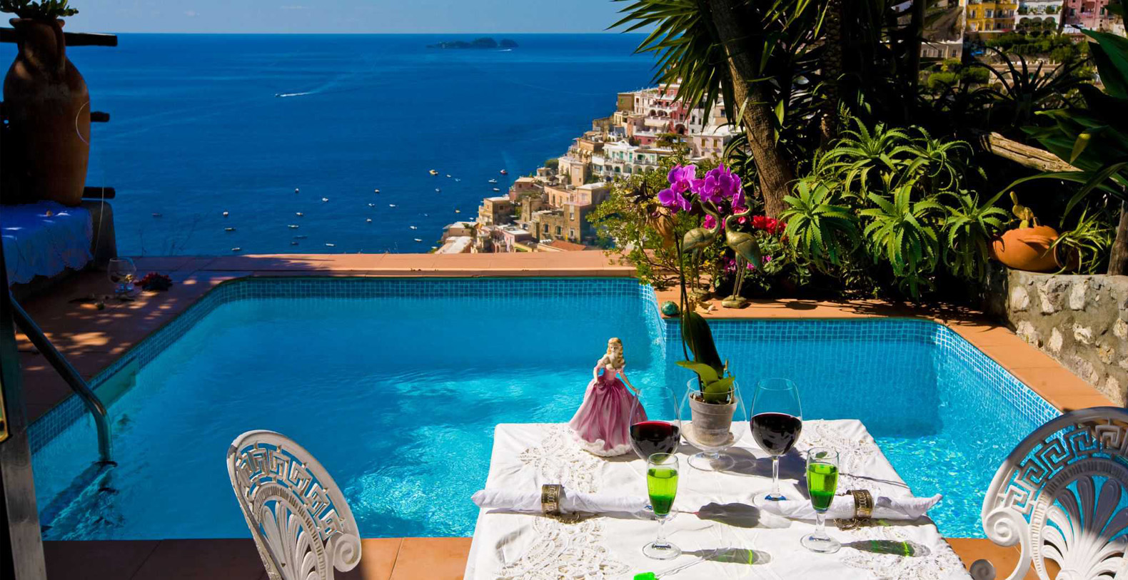 Choosing one Suite or the entire Villa for your holiday or wedding is an excellent way of spending a fairy tale dream. The villa is bathed by the sun till sunset and offers its guests an unforgettable scenery to admire from its terraces and INFINITY POOLS. Sitting on a rock high above the sea and only a few minutes from the beach, the villa is built in the typical Positano style and is made up of apartments and suites equipped with every comfort.