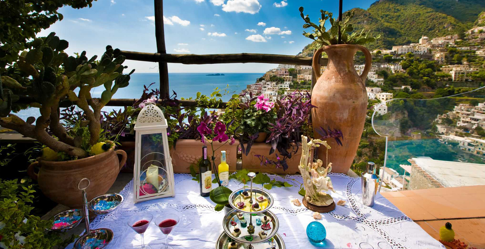 Sea view of Costiera Amalfitana and Li Galli islands, Private swimming pool with panorama and hydro-massage, Jacuzzi bath tub with Chromotherapy Light, Private solarium with showers and beds, Bathroom interior and exterior, Kitchen with hand-painted tiles from Vietri.