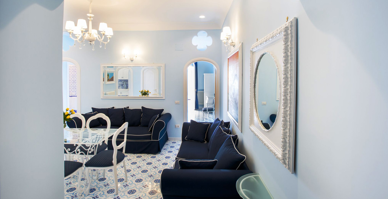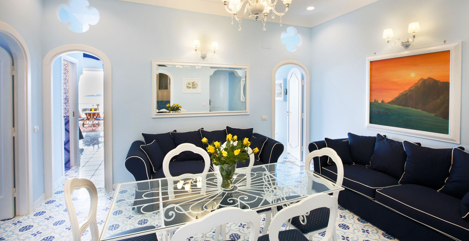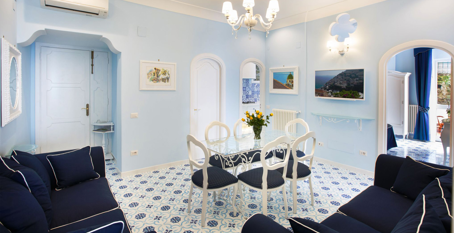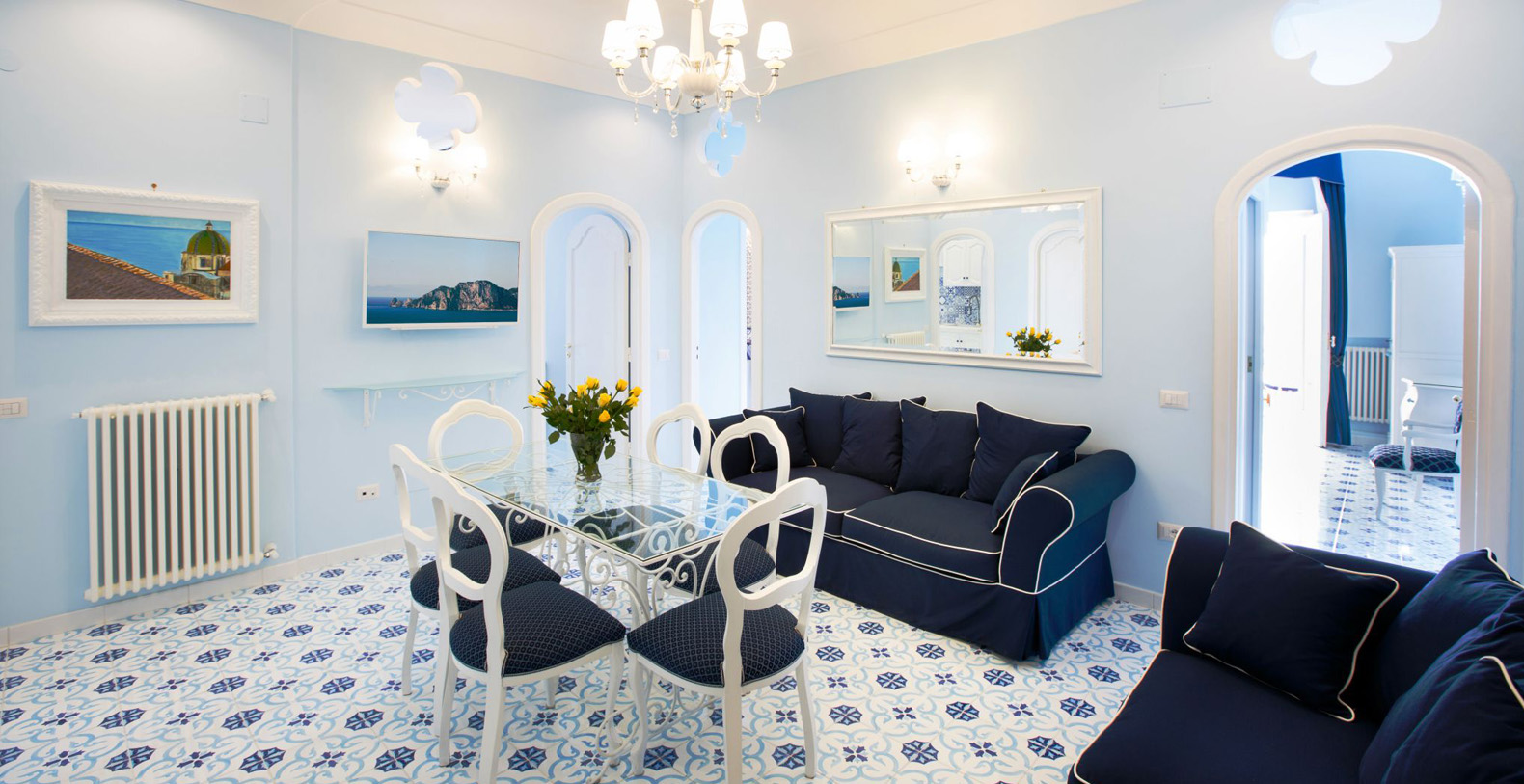 The amazing waterfront apartment, decorated with Vietri’s majolica, designed by the artist Domenico, and relaxing blue walls, according to its cool and Mediterranean style, is the perfect place to spend a holiday in Amalfi Coast. The apartment covers 170 square feet and is composed for three charming waterfront bedrooms, a huge living room, a gourmet kitchen and two stunning terraces, of which one is a solarium.