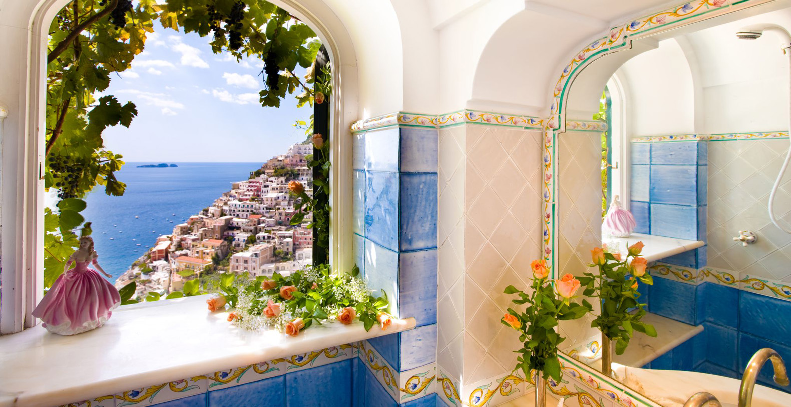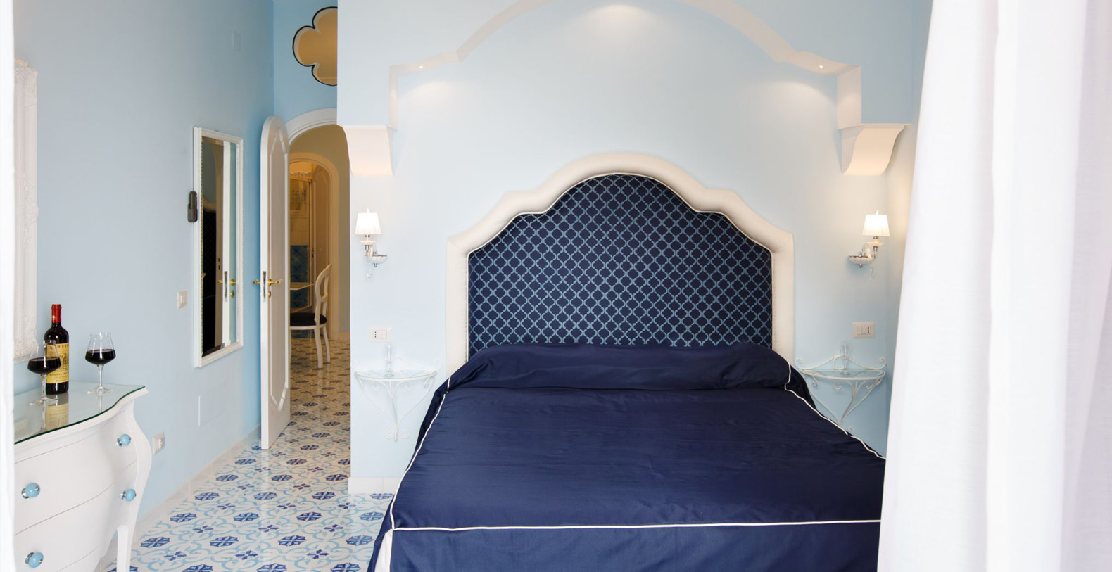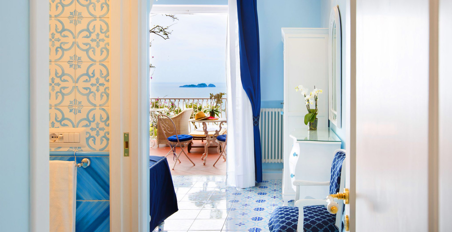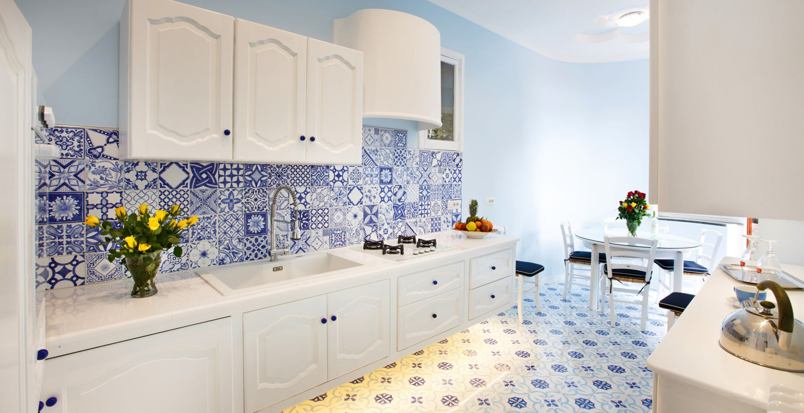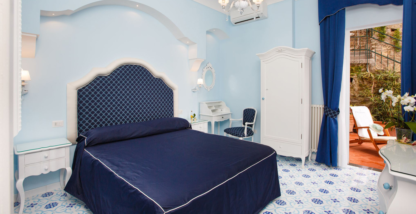 The amazing waterfront apartment, decorated with Vietri’s majolica, designed by the artist Domenico, and relaxing blue walls, according to its cool and Mediterranean style, is the perfect place to spend a holiday in Amalfi Coast. The apartment covers 170 square feet and is composed for three charming waterfront bedrooms, a huge living room, a gourmet kitchen and two stunning terraces, of which one is a solarium.