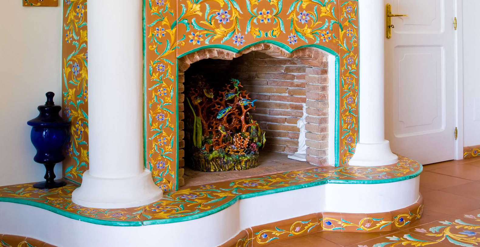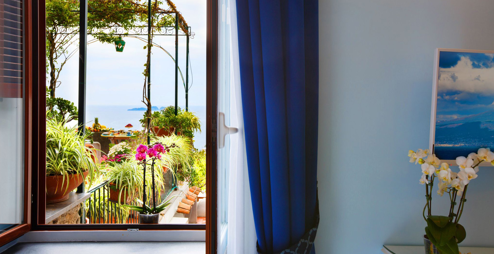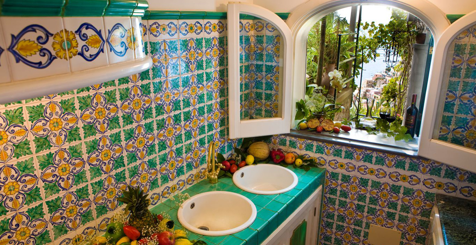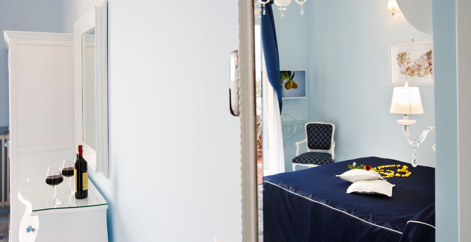 The amazing waterfront apartment, decorated with Vietri’s majolica, designed by the artist Domenico, and relaxing blue walls, according to its cool and Mediterranean style, is the perfect place to spend a holiday in Amalfi Coast. The apartment covers 170 square feet and is composed for three charming waterfront bedrooms, a huge living room, a gourmet kitchen and two stunning terraces, of which one is a solarium.