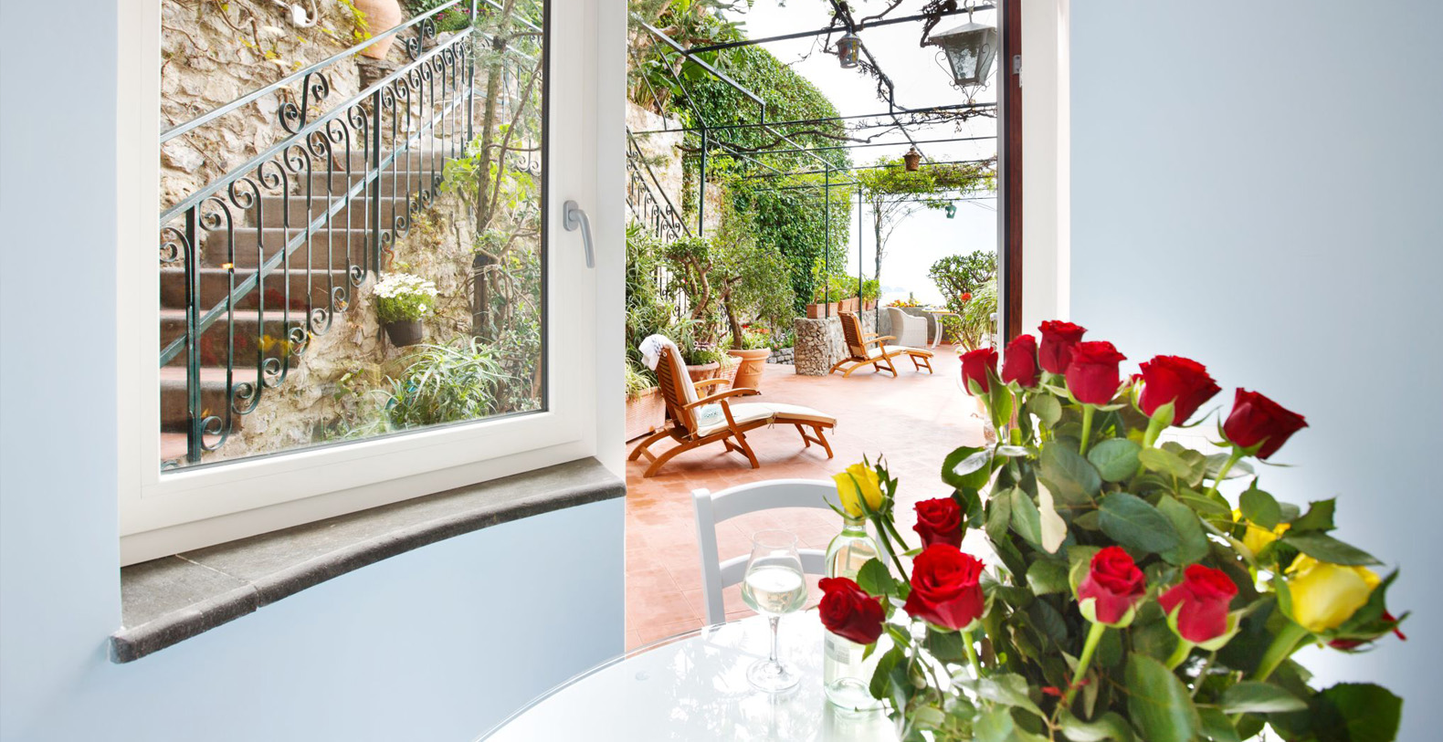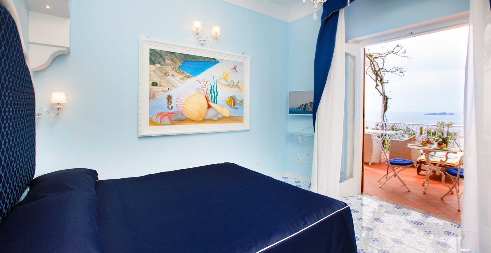 The Superior Rooms, overlooking the sea, are the ideal choice for couples who want to relax and enjoy the breathtaking views over an excellent breakfast served directly to the terrace. The Superior has a wonderful room, full of sunshine and with a view of the sea, decorated in the Mediterranean style with a flooring in hand painted ceramics from Vietri sul Mare and a panoramic terrace with a solarium. A panoramic staircase immersed in the luxurious greenery leads to the infinity pools and the Bar