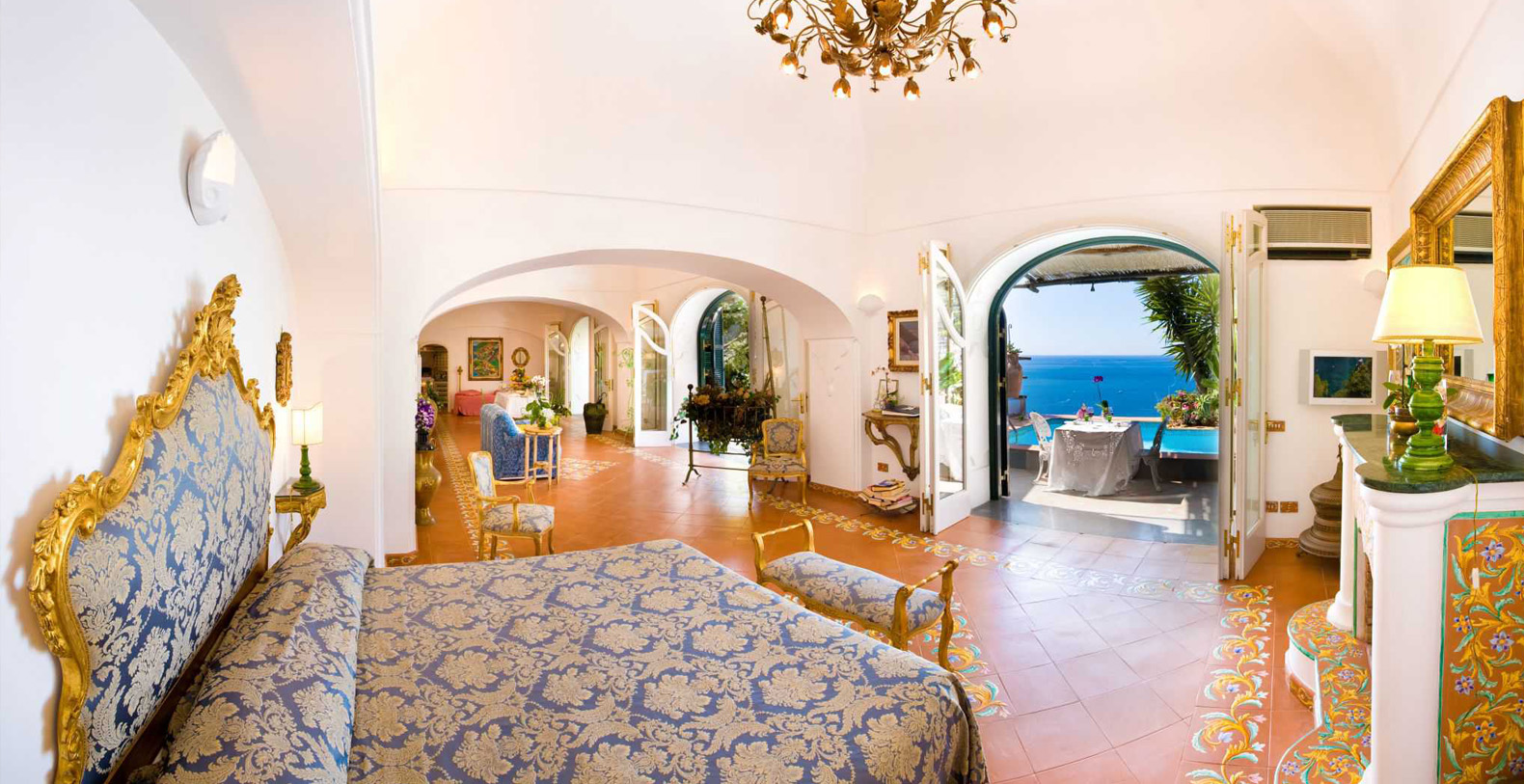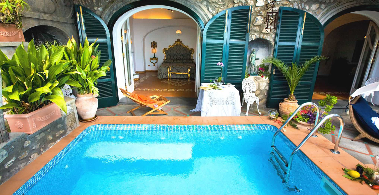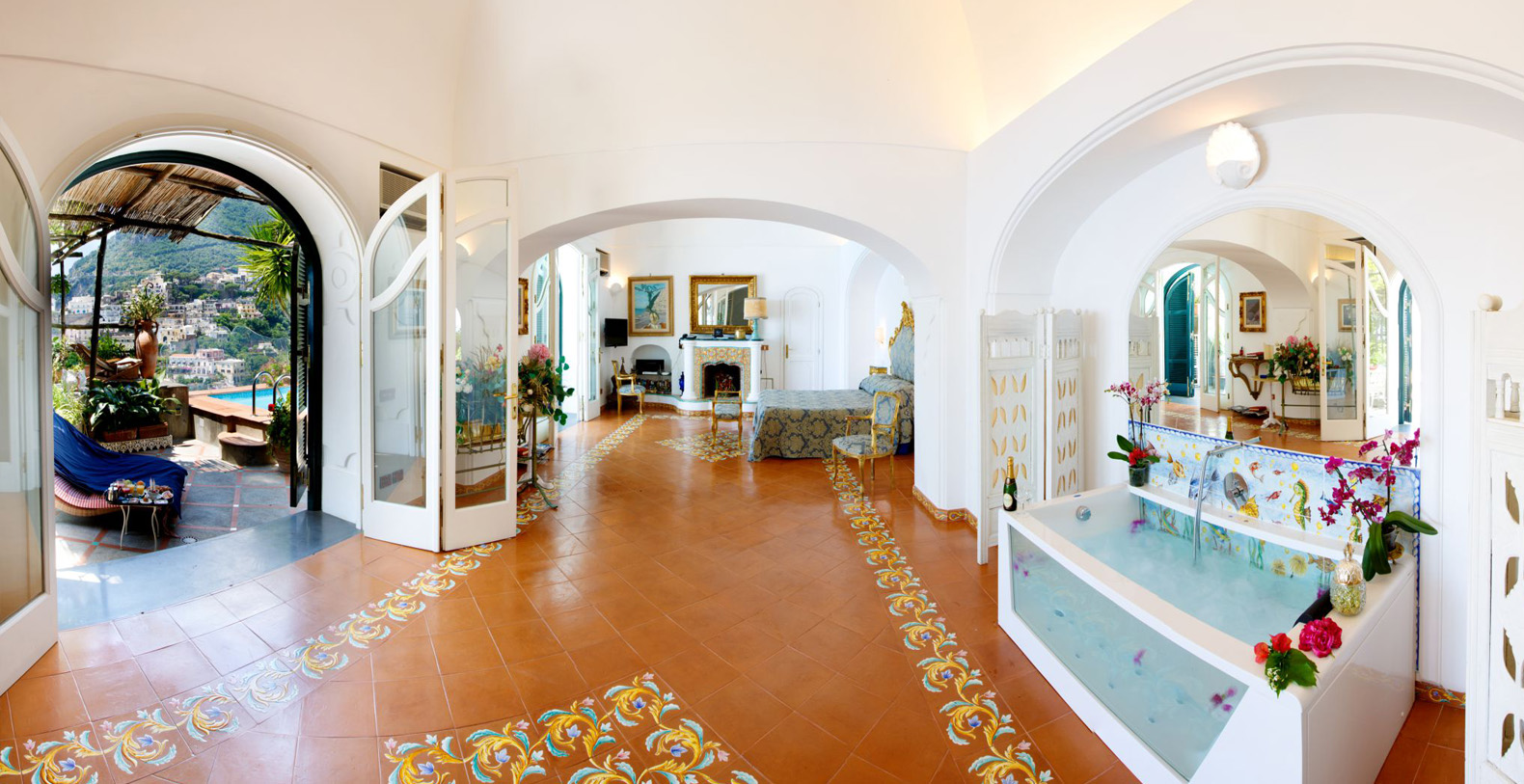 The suite is approximately 120 sqm interior...The interior decoration is elegant and refined, with classic furnishings, mixed with wicker and teak furniture, bronze sculptures and chandeliers by XVIII century, and an ancient brass cradle inherited from family Fiorentino ... for a unique, cozy and relaxing atmosphere. The suite is made from an old structure, a house of the XVII century, which preserves the vaulted ceiling, and an outdoor bathroom that was once a watchtower against the Saracens. A space designed to create emotions, in this luxury suite in Positano is contained all the charm of a honeymoon, a dinner for two under the stars or a night swim in the pool ... in the magical scenery of the Amalfi Coast.