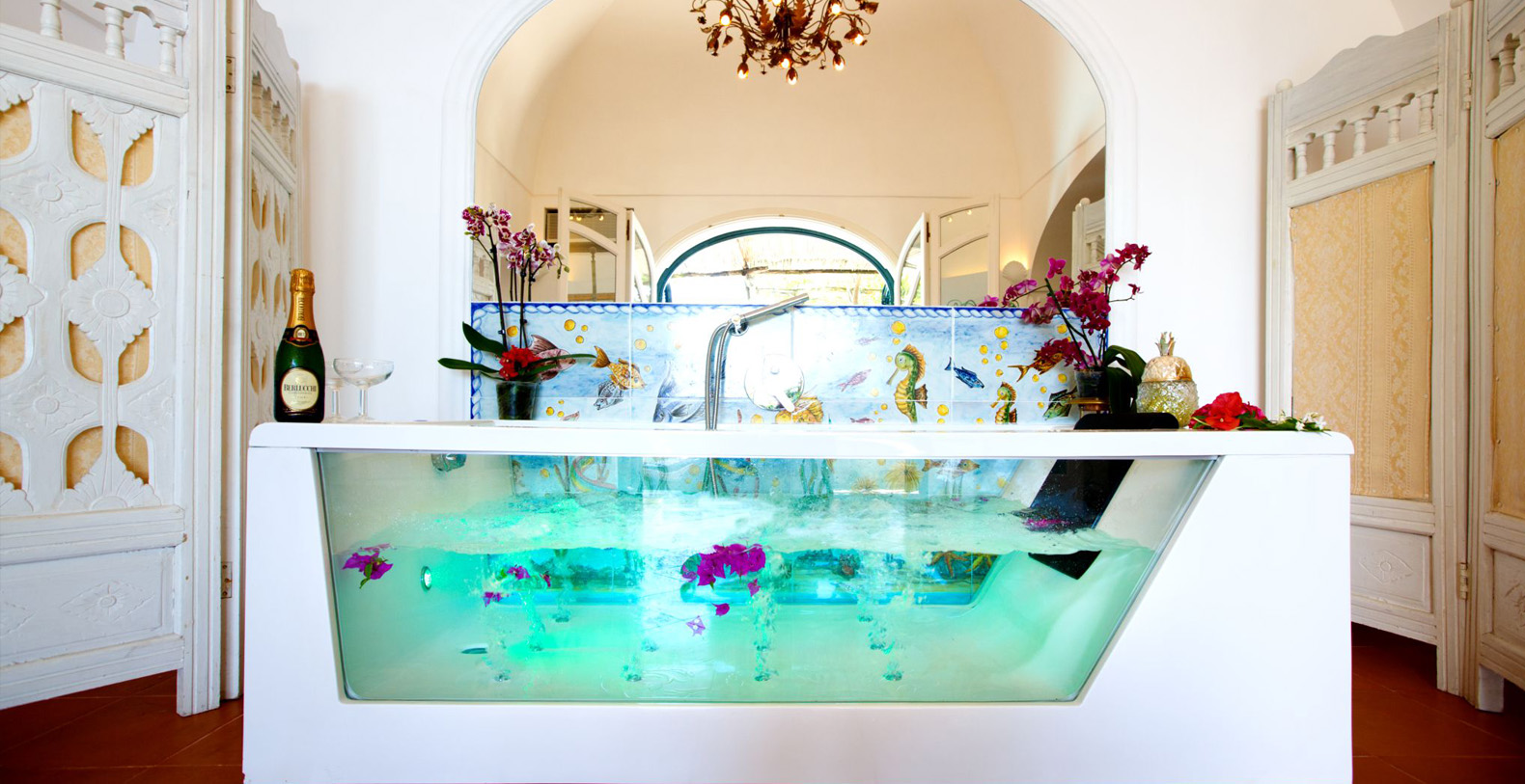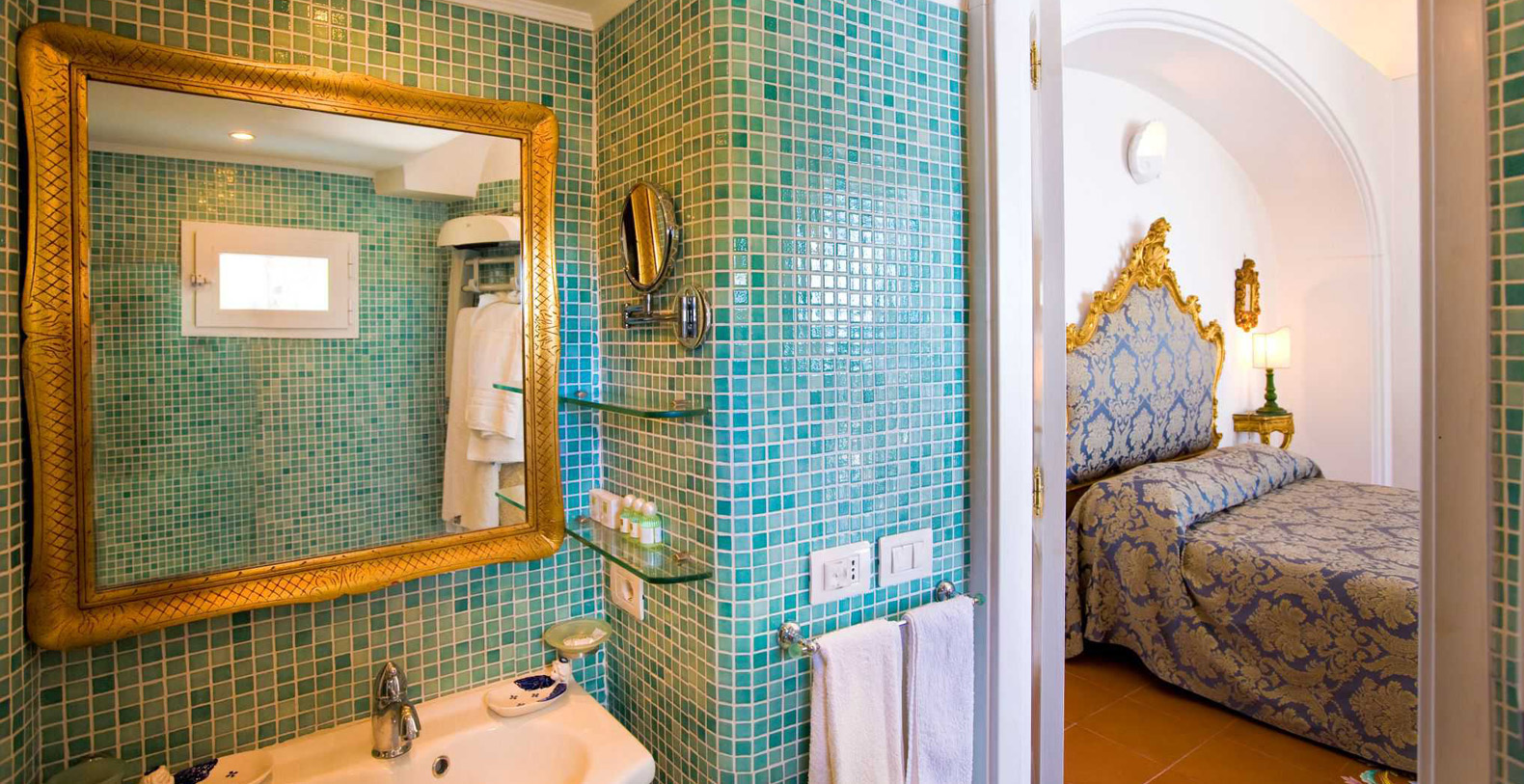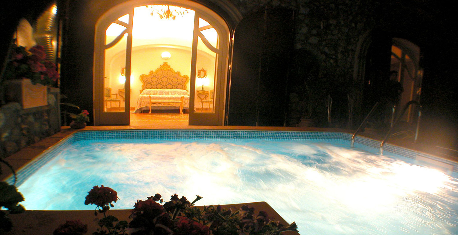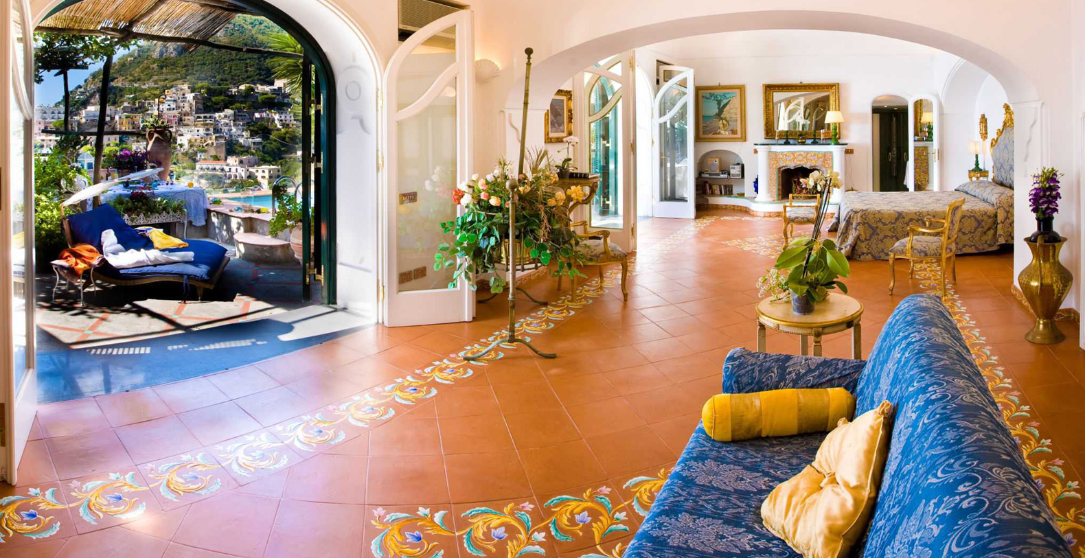 The suite is approximately 120 sqm interior...The interior decoration is elegant and refined, with classic furnishings, mixed with wicker and teak furniture, bronze sculptures and chandeliers by XVIII century, and an ancient brass cradle inherited from family Fiorentino ... for a unique, cozy and relaxing atmosphere. The suite is made from an old structure, a house of the XVII century, which preserves the vaulted ceiling, and an outdoor bathroom that was once a watchtower against the Saracens. A space designed to create emotions, in this luxury suite in Positano is contained all the charm of a honeymoon, a dinner for two under the stars or a night swim in the pool ... in the magical scenery of the Amalfi Coast.