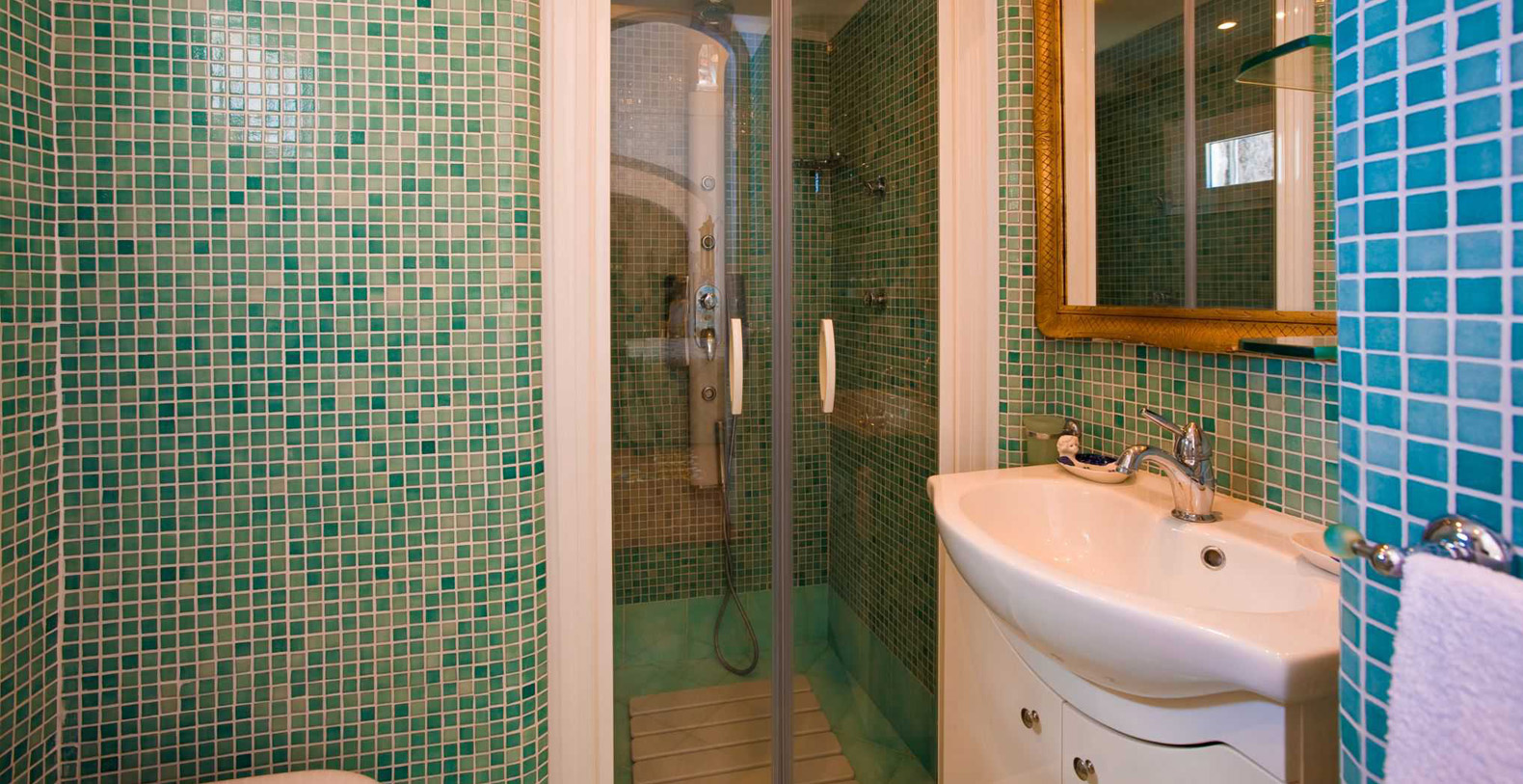 In the house, there are three bathrooms, one of them equipped with a Jacuzzi, and the other two with hydro massage showers. Victoria’s three bathrooms are characterized by elegant silk tapestries, charme’s furniture, Murano’s chandeliers and the lucky four-leaf clover.