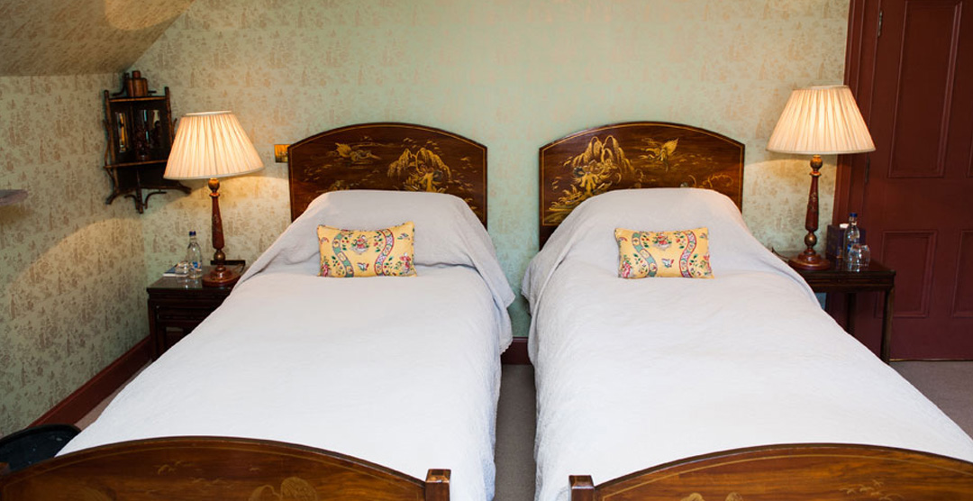 TWIN CHIMNIES is a king or twin-bedded room, reached by its own stone spiral staircase, with ensuite bath and shower. The TOWER ROOM is a classic Elizabethan four-poster and has adjacent stone stairs leading up to the twin-bedded CHINESE ROOM, with ensuite bathroom.